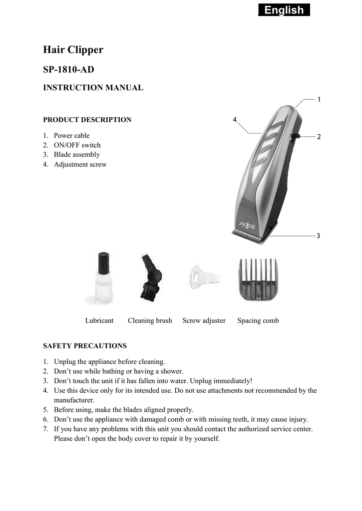 _English_ Hair Clipper SP-1810-AD INSTRUCTION MANUAL PRODUCT DESCRIPTION 1. 2. 3. 4. Power cable ON/OFF switch Blade assembly Adjustment screw Lubricant Cleaning brush Screw adjuster Spacing comb SAFETY PRECAUTIONS 1. 2. 3. 4. Unplug the appliance before cleaning. Don’t use while bathing or having a shower. Don’t touch the unit if it has fallen into water. Unplug immediately! Use this device only for its intended use. Do not use attachments not recommended by the manufacturer. 5. Before using, make the blades aligned properly. 6. Don’t use the appliance with damaged comb or with missing teeth, it may cause injury. 7. If you have any problems with this unit you should contact the authorized service center. Please don’t open the body cover to repair it by yourself. _English_ USING INSTRUCTIONS 1. Your clipper was examined to ensure that the blades were oiled and aligned before leaving the factory. 2. Add a few drops of oil to the blades, turn clipper on for a few seconds before trimming. Then turn off and unplug it. Using a damp cloth wipe the clipper body to avoid oil spatter on people’s hair. Loosen screws slightly and adjust the blade, tighten screws after blade is aligned. 3. While using the hair clipper there could be some noise, vibration and heating. Please don’t worry. This is the normal phenomenon and does not affect the clipper performance. 4. Please always keep the clipper clean and regularly drop oil to lubricate the blades. 5. After replacing or cleaning, the blades should be realigned. INSTRUCTION FOR HAIR CUTTING Before starting the hair cut: 1. Inspect the clipper, making sure that it is free of oil between the cutting blade teeth and turn the unit on to distribute the oil and to make sure it is running smoothly. Wipe off any excess oil. This should be done after each use. While using the unit, untwist the cord from time to time to avoid tangling. 2. Seat the person so their head is approximately at your eye level. This allow ease of visibility while cutting and a relaxed control of the unit 3. Before cutting always first comb the hair so it is tangle free and as it is naturally worn. 4. Place a towel around the neck and shoulders of the person having the haircut. Reminders • • • • Cut the hair in a relaxed and slow manner. Use short strokes only to work gradually over the entire head. Always take off a little hair at a time; you can always trim off additional hair later. As you work, comb the hair frequently back into the style to which you are cutting. When cutting with this hair clipper it is better to leave the hair dry, not wet. With the hair dry, it is much easier to control the amount of hair being cut. The clipper had been adjusted to the best working condition and designed to be used in 220V, ~50Hz voltage range before leaving the factory. The clipper will produce some strange noise when having a high voltage while it is operating. At this time you just need the equipped adjuster to loosen the adjust screw in anti-clockwise direction until decline down the noise. When having a low voltage the clipper blade will operate with less power and narrow moving range. At this condition, you just need to do the opposite operation to above. _English_ BLADE ALIGNMENT Blades must be realigned if they have been removed for cleaning or replacement; or blade alignment is incorrect. The adjustment steps are as below: 1. While aligning the blade position please use a screwdriver to loosen the underside blade fix screws and make sure the upper and under blade teeth are facing up. Align the blades and then tighten the screws. 2. To realign the blades, simply match the upper and bottom blades teeth. The end of top blade teeth should be approximately 1.2mm back from bottom blade in order to prevent skin shearing. 3. The leftmost tooth of the upper blade should cover up to the fist left tooth of the under blade; the rightmost tooth of the upper blade should cover up to the rightmost tooth of the under blade. LUBRICATION 1. Please add a few drops of oil between the cutting blade teeth before clipping. 2. Add a few drops of oil to the blades, after alignment or cleaning or replacing the clipper blades. Then turn clipper on for a few seconds to make sure the blades are being oiled. 3. The clipper upper blade moves at high frequency speed while it is operating. Do not use hair oil, grease, oil mixed with kerosene or any solvent as they may evaporate and leave thick oil film which will slow down blades motion. Use only the special clipper lubricant. _English_ Lubrication hole CLEANING & CARE 1. Using a clean damp cloth wipe the clipper body and using the included cleaning brush sweep the cut short hair or dust wedged between the blade teeth. Do this each time after you have finished using your clipper and then drop oil on the blades. 2. Please store your clipper in a dry environment to extend its life. 3. After long use the blades will become dulled and their cutting performance will decline. Please replace them with new blades. _Polski_ Maszynka do strzyżenia włosów SP-1810-AD INSTRKUCJA OBSŁUGI OPIS PRODUKTU 1. 2. 3. 4. Przewód zasilający Przełącznik ON/OFF Zespół ostrzy Śruba regulacyjna Olej maszynowy Szczotka czyszcząca Regulator śruby Nasadka grzebieniowa ZASADY BEZPIECZEŃSTWA 1. Odłącz urządzenie przed rozpoczęciem czyszczenia. 2. Nie należy używać podczas kąpieli ani pod prysznicem. 3. Nie wolno dotykać urządzenia, jeśli wpadło ono do wody. Odłącz je od zasilania natychmiast! 4. Używaj tego urządzenia wyłącznie do tego do czego jest przeznaczone. Nie używaj akcesoriów nie zalecanych przez producenta. 5. Przed rozpoczęciem użytkowania ustaw ostrza prawidłowo. 6. Nie należy używać urządzenia z uszkodzoną nasadką grzebieniową lub z brakującymi zębami, gdyż może to spowodować obrażenia ciała. _Polski_ 7. Jeśli masz jakieś problemy z tym urządzeniem, należy skontaktować się z autoryzowanym serwisem. Proszę nie ot