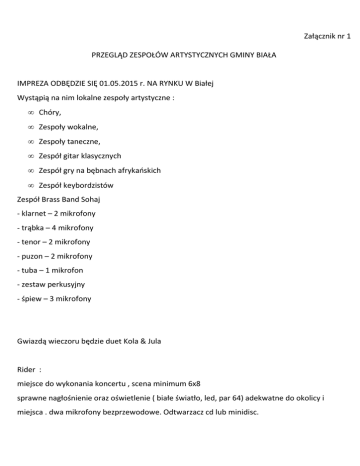 Załącznik nr 1 PRZEGLĄD ZESPOŁÓW ARTYSTYCZNYCH GMINY BIAŁA IMPREZA ODBĘDZIE SIĘ 01.05.2015 r. NA RYNKU W Białej Wystąpią na nim lokalne zespoły artystyczne : • Chóry, • Zespoły wokalne, • Zespoły taneczne, • Zespół gitar klasycznych • Zespół gry na bębnach afrykańskich • Zespół keybordzistów Zespół Brass Band Sohaj - klarnet – 2 mikrofony - trąbka – 4 mikrofony - tenor – 2 mikrofony - puzon – 2 mikrofony - tuba – 1 mikrofon - zestaw perkusyjny - śpiew – 3 mikrofony Gwiazdą wieczoru będzie duet Kola & Jula Rider : miejsce do wykonania koncertu , scena minimum 6x8 sprawne nagłośnienie oraz oświetlenie ( białe światło, led, par 64) adekwatne do okolicy i miejsca . dwa mikrofony bezprzewodowe. Odtwarzacz cd lub minidisc.
