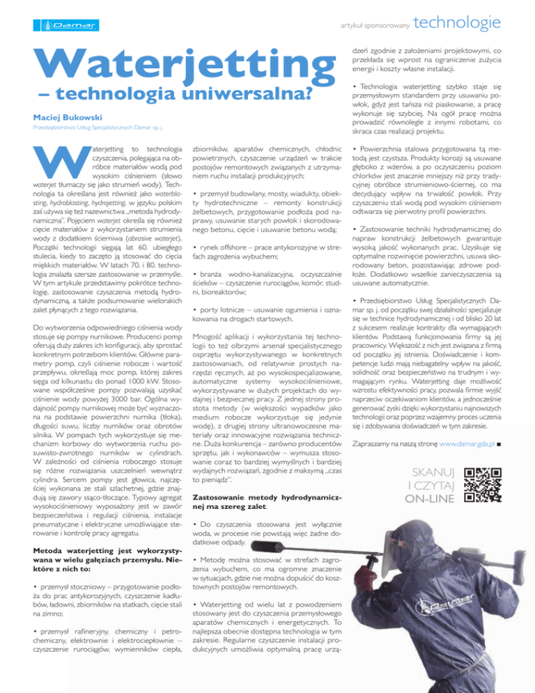 artykuł sponsorowany Waterjetting – technologia uniwersalna? Maciej Bukowski Przedsiębiorstwo Usług Specjalistycznych Damar sp. j. W aterjetting to technologia czyszczenia, polegająca na obróbce materiałów wodą pod wysokim ciśnieniem (słowo waterjet tłumaczy się jako strumień wody). Technologia ta określana jest również jako waterblasting, hydroblasting, hydrojetting, w języku polskim zaś używa się też nazewnictwa „metoda hydrodynamiczna”. Pojęciem waterjet określa się również cięcie materiałów z wykorzystaniem strumienia wody z dodatkiem ścierniwa (abrasive waterjet). Początki technologii sięgają lat 60. ubiegłego stulecia, kiedy to zaczęto ją stosować do cięcia miękkich materiałów. W latach 70. i 80. technologia znalazła szersze zastosowanie w przemyśle. W tym artykule przedstawimy pokrótce technologię, zastosowanie czyszczenia metodą hydrodynamiczną, a także podsumowanie wielorakich zalet płynących z tego rozwiązania. Do wytworzenia odpowiedniego ciśnienia wody stosuje się pompy nurnikowe. Producenci pomp oferują duży zakres ich konfiguracji, aby sprostać konkretnym potrzebom klientów. Główne parametry pomp, czyli ciśnienie robocze i wartość przepływu, określają moc pomp, której zakres sięga od kilkunastu do ponad 1000 kW. Stosowane współcześnie pompy pozwalają uzyskać ciśnienie wody powyżej 3000 bar. Ogólna wydajność pompy nurnikowej może być wyznaczona na podstawie powierzchni nurnika (tłoka), długości suwu, liczby nurników oraz obrotów silnika. W pompach tych wykorzystuje się mechanizm korbowy do wytworzenia ruchu posuwisto-zwrotnego nurników w cylindrach. W zależności od ciśnienia roboczego stosuje się różne rozwiązania uszczelnień wewnątrz cylindra. Sercem pompy jest głowica, najczęściej wykonana ze stali szlachetnej, gdzie znajdują się zawory ssąco-tłoczące. Typowy agregat wysokociśnieniowy wyposażony jest w zawór bezpieczeństwa i regulacji ciśnienia, instalacje pneumatyczne i elektryczne umożliwiające sterowanie i kontrolę pracy agregatu. Metoda waterjetting jest wykorzystywana w wielu gałęziach przemysłu. Niektóre z nich to: • przemysł stoczniowy – przygotowanie podłoża do prac antykorozyjnych, czyszczenie kadłubów, ładowni, zbiorników na statkach, cięcie stali na zimno; • przemysł rafineryjny, chemiczny i petrochemiczny, elektrownie i elektrociepłownie – czyszczenie rurociągów, wymienników ciepła, zbiorników, aparatów chemicznych, chłodnic powietrznych, czyszczenie urządzeń w trakcie postojów remontowych związanych z utrzymaniem ruchu instalacji produkcyjnych; • przemysł budowlany, mosty, wiadukty, obiekty hydrotechniczne – remonty konstrukcji żelbetowych, przygotowanie podłoża pod naprawy, usuwanie starych powłok i skorodowanego betonu, cięcie i usuwanie betonu wodą; • rynek offshore – prace antykorozyjne w strefach zagrożenia wybuchem; • branża wodno-kanalizacyjna, oczyszczalnie ścieków – czyszczenie rurociągów, komór, studni, bioreaktorów; • porty lotnicze – usuwanie ogumienia i oznakowania na drogach startowych. Mnogość aplikacji i wykorzystania tej technologii to też olbrzymi arsenał specjalistycznego osprzętu wykorzystywanego w konkretnych zastosowaniach, od relatywnie prostych narzędzi ręcznych, aż po wysokospecjalizowane, automatyczne systemy wysokociśnieniowe, wykorzystywane w dużych projektach do wydajnej i bezpiecznej pracy. Z jednej strony prostota metody (w większości wypadków jako medium robocze wykorzystuje się jedynie wodę), z drugiej strony ultranowoczesne materiały oraz innowacyjne rozwiązania techniczne. Duża konkurencja – zarówno producentów sprzętu, jak i wykonawców – wymusza stosowanie coraz to bardziej wymyślnych i bardziej wydajnych rozwiązań, zgodnie z maksymą „czas to pieniądz”. Zastosowanie metody hydrodynamicznej ma szereg zalet. • Do czyszczenia stosowana jest wyłącznie woda, w procesie nie powstają więc żadne dodatkowe odpady. • Metodę można stosować w strefach zagrożenia wybuchem, co ma ogromne znaczenie w sytuacjach, gdzie nie można dopuścić do kosztownych postojów remontowych. • Waterjetting od wielu lat z powodzeniem stosowany jest do czyszczenia przemysłowego aparatów chemicznych i energetycznych. To najlepsza obecnie dostępna technologia w tym zakresie. Regularne czyszczenie instalacji produkcyjnych umożliwia optymalną pracę urzą- technologie dzeń zgodnie z założeniami projektowymi, co przekłada się wprost na ograniczenie zużycia energii i koszty własne instalacji. • Technologia waterjetting szybko staje się przemysłowym standardem przy usuwaniu powłok, gdyż jest tańsza niż piaskowanie, a pracę wykonuje się szybciej. Na ogół pracę można prowadzić równolegle z innymi robotami, co skraca czas realizacji projektu. • Powierzchnia stalowa przygotowana tą metodą jest czystsza. Produkty korozji są usuwane głęboko z wżerów, a po oczyszczeniu poziom chlorków jest znacznie mniejszy niż przy tradycyjnej obróbce strumieniowo-ściernej, co ma decydujący wpływ na trwałość powłok. Przy czyszczeniu stali wodą pod wysokim ciśnieniem odtwarza się pierwotny profil powierzchni. • Zastosowanie techniki hydrodynamicznej do napraw konstrukcji żelbetowych gwarantuje wysoką jakość wykonanych prac. Uzyskuje się optymalne rozwinięcie powierzchni, usuwa skorodowany beton, pozostawiając zdrowe podłoże. Dodatkowo wszelkie zanieczyszczenia są usuwane automatycznie. • Przedsiębiorstwo Usług Specjalistycznych Damar sp. j. od początku swej działalności specjalizuje się w technice hydrodynamicznej i od blisko 20 lat z sukcesem realizuje kontrakty dla wymagających klientów. Podstawą funkcjonowania firmy są jej pracownicy. Większość z nich jest związana z firmą od początku jej istnienia. Doświadczenie i kompetencje ludzi mają niebagatelny wpływ na jakość, solidn