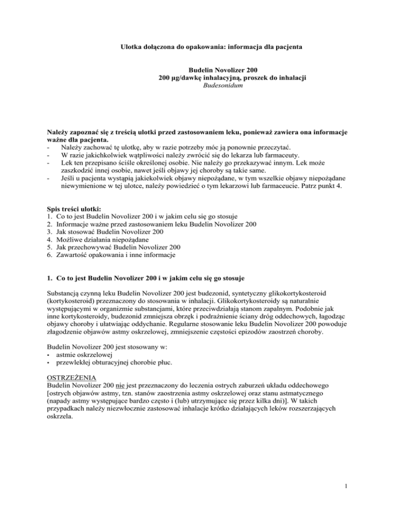 Ulotka dołączona do opakowania: informacja dla pacjenta Budelin Novolizer 200 200 μg/dawkę inhalacyjną, proszek do inhalacji Budesonidum Należy zapoznać się z treścią ulotki przed zastosowaniem leku, ponieważ zawiera ona informacje ważne dla pacjenta. Należy zachować tę ulotkę, aby w razie potrzeby móc ją ponownie przeczytać. W razie jakichkolwiek wątpliwości należy zwrócić się do lekarza lub farmaceuty. Lek ten przepisano ściśle określonej osobie. Nie należy go przekazywać innym. Lek może zaszkodzić innej osobie, nawet jeśli objawy jej choroby są takie same. Jeśli u pacjenta wystąpią jakiekolwiek objawy niepożądane, w tym wszelkie objawy niepożądane niewymienione w tej ulotce, należy powiedzieć o tym lekarzowi lub farmaceucie. Patrz punkt 4. Spis treści ulotki: 1. Co to jest Budelin Novolizer 200 i w jakim celu się go stosuje 2. Informacje ważne przed zastosowaniem leku Budelin Novolizer 200 3. Jak stosować Budelin Novolizer 200 4. Możliwe działania niepożądane 5. Jak przechowywać Budelin Novolizer 200 6. Zawartość opakowania i inne informacje 1. Co to jest Budelin Novolizer 200 i w jakim celu się go stosuje Substancją czynną leku Budelin Novolizer 200 jest budezonid, syntetyczny glikokortykosteroid (kortykosteroid) przeznaczony do stosowania w inhalacji. Glikokortykosteroidy są naturalnie występującymi w organizmie substancjami, które przeciwdziałają stanom zapalnym. Podobnie jak inne kortykosteroidy, budezonid zmniejsza obrzęk i podrażnienie ściany dróg oddechowych, łagodząc objawy choroby i ułatwiając oddychanie. Regularne stosowanie leku Budelin Novolizer 200 powoduje złagodzenie objawów astmy oskrzelowej, zmniejszenie częstości epizodów zaostrzeń choroby. Budelin Novolizer 200 jest stosowany w: astmie oskrzelowej przewlekłej obturacyjnej chorobie płuc. OSTRZEŻENIA Budelin Novolizer 200 nie jest przeznaczony do leczenia ostrych zaburzeń układu oddechowego [ostrych objawów astmy, tzn. stanów zaostrzenia astmy oskrzelowej oraz stanu astmatycznego (napady astmy występujące bardzo często i (lub) utrzymujące się przez kilka dni)]. W takich przypadkach należy niezwłocznie zastosować inhalacje krótko działających leków rozszerzających oskrzela. 1 2. Informacje ważne przed zastosowaniem leku Budelin Novolizer 200 Kiedy nie stosować leku Budelin Novolizer 200 jeśli pacjent ma uczulenie na substancję czynną lub którykolwiek z pozostałych składników tego leku (wymienionych w punkcie 6), w tym białka mleka zawarte w leku. Ostrzeżenia i środki ostrożności Przed rozpoczęciem stosowania leku Budelin Novolizer 200 należy omówić to z lekarzem lub farmaceutą. Należy zachować szczególną ostrożność podczas stosowania leku Budelin Novolizer 200 u pacjentów chorych na gruźlicę płuc lub inne zakażenia układu oddechowego (w tym zakażenia grzybicze i wirusowe). Dotyczy to również osób, u których występowały te schorzenia w przeszłości. Należy zwrócić się do lekarza. W trakcie leczenia lekiem Budelin Novolizer 200 konieczne jest odpowiednie leczenie zakażenia. Budelin Novolizer 200 nie jest przeznaczony do leczenia ostrych zaburzeń układu oddechowego ani ostrego, przedłużającego się skurczu oskrzeli (stan astmatyczny). Lekarz zaleci pacjentowi stosowanie krótko działającego leku rozszerzającego oskrzela jako lek ratujący życie, w celu złagodzenia ostrych objawów choroby. Jeżeli po zastosowaniu krótko działających leków rozszerzających oskrzela nie następuje zauważalna poprawa lub wystąpi potrzeba częstszego niż zazwyczaj ich stosowania, należy zgłosić się do lekarza. W takich przypadkach lekarz może rozważyć zastosowanie dodatkowego krótkotrwałego leczenia glikokortykosteroidami doustnymi. Zaburzenia czynności wątroby mogą wpływać na wydalanie budezonidu. Jeżeli po inhalacji leku Budelin Novolizer 200 występuje paradoksalny skurcz oskrzeli, należy niezwłocznie skontaktować się z lekarzem, który w razie konieczności może zalecić odstawienie leku Budelin Novolizer 200 oraz zastosować inne leczenie. U pacjentów z ciężkimi zaburzeniami czynności wątroby, szybkość wydalania leku może być zaburzona. W rezultacie może dojść do zwiększenia stężenia budezonidu we krwi oraz wystąpienia ogólnoustrojowych działań niepożądanych. Zaleca się kontrolowanie stężenia kortyzolu w surowicy w regularnych odstępach czasu. Leczenia nie należy przerywać nagle, lecz stopniowo zmniejszać dawki leku (zgodnie z zaleceniami lekarza). Długotrwałe leczenie dużymi dawkami wziewnych glikokortykosteroidów, w tym lekiem Budelin Novolizer 200, szczególnie dawkami większymi niż zalecane, może powodować działania niepożądane, m.in. istotne klinicznie zahamowanie czynności kory nadnerczy. Pacjenci leczeni glikokortykosteroidami, narażeni na ciężkie sytuacje stresowe należą do grupy zwiększonego ryzyka niewydolności kory nadnerczy. Wystąpienie ogólnoustrojowych działań podczas stosowania wziewnych glikokortykosteroidów jest znacznie mniej prawdopodobne niż podczas stosowania doustnych glikokortykosteroidów. Możliwe działania ogólnoustrojowe to: zespół Cushinga (stan wywołany nadmiarem hormonu zwanego kortyzolem objawiający się m.in. nagromadzeniem tkanki tłuszczowej na karku i twarzy), wygląd twarzy przypominający zespół Cushinga, zahamowanie czynności kory nadnerczy, opóźnienie wzrostu u dzieci i młodzieży, zmniejszenie gęstości mineralnej kości oraz choroby oczu (zaćma i jaskra) oraz rzadziej, szereg objawów psychicznych lub zmian zachowania, w tym nadpobudliwość psychoruchowa, zaburzenia snu, lęk, depresja lub agresja (szczególnie u dzieci). Lekarz dobierze najmniejszą skuteczną dawkę wziewnych glikokortykosteroidów leczącą astmę. 2 Jeśli wystąpi istotne klinicznie zahamowanie czynności kory nadnerczy, lekarz rozważy podanie dodatkowych glikokortykosteroidów (np.