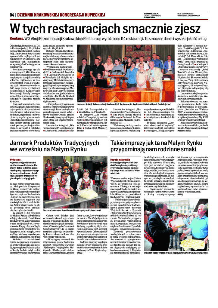 04 | DZIENNIK KRAKOWSKIEJ KONGREGACJI KUPIECKIEJ DZIENNIKPOLSKI24.PL CZWARTEK, 13 SIERPNIA 2015 DZIENNIK POLSKI POLUB NAS NA FACEBOOKU WWW.FACEBOOK.COM/DZIENNIKPOLSKI W tych restauracjach smacznie zjesz Odbyła się jubileuszowa, 10. Gala Finałowej edycji Akcji Rekomendacji Krakowskich Restauracji. Sala Obrad Rady Miasta zgromadziła najlepszych restauratorów w Krakowie, aby nagrodzić ich statuetkami za wysoką jakość usług gastronomicznych. Restauracje mogą być dla wymagających klientów oraz dla rodzin z dziećmi miejscem magicznym, specjalizować się w kuchni regionalnej. W Krakowie jest ich wiele, a w wyborze tych, które warto odwiedzić, mogą pomóc wyniki Akcji Rekomendacji Krakowskich Restauracji. Zostały one ogłoszone 3 lipca podczas uroczystej gali w Urzędzie Miasta Krakowa. Podczas trwania Akcji członkowie Kapituły Rekomendującej – są wśród nich przedstawiciele branży, szkół gastronomicznych, organizacji i instytucji związanych z gastronomią i turystyką oraz mediów – oceniali między innymi jadłospis, smak potraw, profesjonalizm obsługi, czystość i estetykę, a także dodatkową ofertę zwią- zaną z daną kategorią zgłoszonych do Akcji lokali. Z okazji 10-lecia Akcji Rekomendacji Krakowskich Restauracji zostały nagrodzone restauracje, które brały udział w akcji przez 10 lat i były każdorazowo rekomendowane. Wyróżnione restauracje – A Pod Baranem (ul. św. Gertrudy 21) A Corleone (ul. Poselska 19) A Jarema (Plac Matejki 5) A Kawaleria (ul. Gołębia 4) – otrzymały Medal Jubileuszowy 600-lecia Krakowskiej Kongregacji Kupieckiej oraz specjalną nagrodę ufundowaną przez Makro Cash and Carry w postaci voucherów na jednodniowe szkolenie dla Szefa Kuchni w Akademii Efektywnej Przedsiębiorczości. – W wyniku Akcji wyłoniono w sumie 114 rekomendowanych restauracji, które cechuje naprawdę wysoka jakość usług – mówi Wiesław Jopek, prezes Krakowskiej Kongregacji Kupieckiej, która jest współorganizatorem akcji. Laureaci w kategorii „Dla wymagających” to restauracje: A Amarylis (ul. Dietla 60) A Trzy FOT. MARIAN SATAŁA Konkurs. W X Akcji Rekomendacji Krakowskich Restauracji wyróżniono 114 restauracji. To smaczne dania i wysoka jakość usług Laureaci X Akcji Rekomendacji Krakowskich Restauracji z dyplomami i statuetkami. Gratulujemy! Rybki (ul. Szczepańska 5) A Vanilla Sky (ul. Flisacka 3). W kategorii „Dla rodzin z dziećmi” zwyciężyły restauracje: A Oberża Sąsiadów (ul. Kordiana 19) A Spaghetteria Pizza & Pasta (ul. Kobierzyńska 142a) A Focha 42 (al. Marsz. F. Focha). Laureaci w kategorii „Magiczne miejsce” to restauracje: A The Piano Rouge (Rynek Główny 46 A Farina (ul. św. Marka 16) A Jama Michalika (ul. Floriańska 45). W cieszącej się dużym zainteresowaniem kategorii „Z małopolską potrawą regionalną” wygrały restauracje: A Biała Róża (ul. Straszewskiego 16) A Pod Nosem (ul. Kanonicza 22) A Introligatornia Smaku (ul. Józefa 20). Podczas konkursu „Zawstydź obwarzanka i zagłosuj” internauci wyłonili laureatów: A w kategorii „Wyjątkowy pro- dukt kulinarny”: I miejsce zdobyły „Frytki belgijskie”(ul. św. Wawrzyńca 14), II miejsce „Kremówka” z Cocktail-baru „Czarodziej” (ul. Karmelicka 15), a III – „Kiełbaska z Niebieskiej Nyski” (przy Hali Targowej, ul. Grzegórzecka 3) A w kategorii „Zjawiska, trendy, inicjatywy”: I miejsce otrzymały „Food Trucki” z ul. św. Wawrzyńca, miejsce zwane Zakątkiem Hipstera lub Skwerem Judah, II miejsce Targ Pietruszkowy odbywający się na Placu Niepodległości, III miejsce Festiwal Pierogów odbywający się na Małym Rynku. Laureatom Akcji wręczono statuetki z symbolicznym krakowskim obwarzankiem. Rekomendowane restauracje promowane będą m.in. w przewodniku po restauracjach „Kraków na Widelcu 2015”, w wyszukiwarce restauracji na stronie www.krakow.pl, w aplikacji mobilnej My KRK oraz na www.krakow.travel. Jeśli zobaczysz w lokalu obwarzanka na widelcu, wchodź śmiało. Na pewno zjesz dobrze! Marian Satała Takie imprezy jak ta na Małym Rynku przypominają nam rodzinne smaki Wydarzenia Dobre bo małopolskie Najsmaczniej pod słońcem zjeść można w Krakowie. Kochamy dobre jedzenie, ale coraz chętniej sięgamy do receptur naszych rodziców i dziadków, szukamy produktów regionalnych i tradycyjnych. Promocją małopolskich produktów regionalnych i tradycyjnych na poważnie zajmuje się Urząd Marszałkowski Województwa. W czasie kiermaszu dzieci i dorośli nauczą się robić obwarzanki Celem tych działań jest ochrona krakowskiego obwarzanka wpisanego na listę produktów tradycyjnych i do rejestru „Chronionych Oznaczeń Geograficznych” UE. Bo ciągle na rynku pojawiają się produkty, które z obwarzankiem niewiele mają wspólnego. – W następny weekend, 1820 września, gościć będziemy polskich Producentów Wyrobów Wędzonych Tradycyjnie z Małopolski i Podkarpacia – informuje Dariusz Michalak, prezes firmy Artim, która organizuje jarmark. – Na Mały Rynek zostaną przywiezione wędzarnie. Producenci prezentować będą kiełbasy, szynki itp. Będą również informować o ich szczególnych walorach. Celem tej akcji jest wykazanie, iż wytwarzanie wędlin tą metodą nie jest szkodliwe dla zdrowia konsumentów. Podczas imprezy wystąpią zespoły i grupy obrzędowe zrzeszone w Stowarzyszeniu Folklorystycznym Teatr Regionalny. (MAS) Wiecemarszałek województwa Wojciech Kozak nie ma wątpliwości, że promocja jest konieczna. Dlatego z entuzjazmem podchodzi do takich inicjatyw jak urządzanie jarmarków i kiermaszy z produktami tradycyjnymi i regionalnymi. – Nasze województwo buduje przemysł turystyczny bazując na dziedzictwie kulturowym i kulinarnym - twierdzi Wojciech Kozak. – Spośród 1450 produktów tradycyjnych rodowód małopolski ma aż 149 z nich. Natomiast w przypadku produktów regionalnych nasza przewaga jest jeszcze większa bowiem na 37 produktów