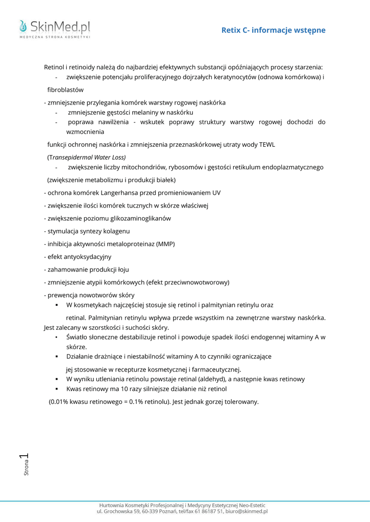 Retix C- informacje wstępne Retinol i retinoidy należą do najbardziej efektywnych substancji opóźniających procesy starzenia: - zwiększenie potencjału proliferacyjnego dojrzałych keratynocytów (odnowa komórkowa) i fibroblastów - zmniejszenie przylegania komórek warstwy rogowej naskórka - zmniejszenie gęstości melaniny w naskórku - poprawa nawilżenia - wskutek poprawy struktury warstwy rogowej dochodzi do wzmocnienia funkcji ochronnej naskórka i zmniejszenia przeznaskórkowej utraty wody TEWL (Transepidermal Water Loss) - zwiększenie liczby mitochondriów, rybosomów i gęstości retikulum endoplazmatycznego (zwiększenie metabolizmu i produkcji białek) - ochrona komórek Langerhansa przed promieniowaniem UV - zwiększenie ilości komórek tucznych w skórze właściwej - zwiększenie poziomu glikozaminoglikanów - stymulacja syntezy kolagenu - inhibicja aktywności metaloproteinaz (MMP) - efekt antyoksydacyjny - zahamowanie produkcji łoju - zmniejszenie atypii komórkowych (efekt przeciwnowotworowy) - prewencja nowotworów skóry W kosmetykach najczęściej stosuje się retinol i palmitynian retinylu oraz retinal. Palmitynian retinylu wpływa przede wszystkim na zewnętrzne warstwy naskórka. Jest zalecany w szorstkości i suchości skóry. • Światło słoneczne destabilizuje retinol i powoduje spadek ilości endogennej witaminy A w skórze. Działanie drażniące i niestabilność witaminy A to czynniki ograniczające jej stosowanie w recepturze kosmetycznej i farmaceutycznej. W wyniku utleniania retinolu powstaje retinal (aldehyd), a następnie kwas retinowy Kwas retinowy ma 10 razy silniejsze działanie niż retinol Strona 1 (0.01% kwasu retinowego = 0.1% retinolu). Jest jednak gorzej tolerowany. Retix C- informacje wstępne ZESTAW DO UŻYTKU PROFESJONALNEGO: AMPUŁKA SKŁADNIKI AKTYWNE: 8% witaminy C (lewoskrętny stereoizomer kwasu askorbinowego) Kompleks antyoksydantów (flawonoidy) WŁAŚCIWOŚCI: Stabilna i aktywna forma witaminy C Intensywne działanie antyoksydacyjne, chroni przed fotouszkodzeniami Wyrównuje kolor skóry, rozświetla Stymuluje syntezę kolagenu Dodaje blasku skórze SASZETKA SKŁADNIKI AKTYWNE: 4% RETINOL NNKT wyciąg z rozmarynu Wit. E WŁAŚCIWOŚCI: Normalizuje keratynizację Rozjaśnia skórę i dodaje blasku Nawilża i odnawia skórę Stymuluje syntezę kolagenu Redukuje niedoskonałości WSKAZANIA: fotostarzenie melasma wiotka skóra niedoskonałości (zmarszczki, nierówności, rozszerzone pory) rozstępy intensywnie wygładza redukując niedoskonałości (rozszerzone pory, zmarszczki) skóra szara, matowa, pozbawiona blasku Właściwości maski: • Maska zawiera substancje zwiększające w skórze proces przekształcania estrów retinolu do retinolu. (*) • Maska zawiera specyficzne składniki, które zwiększają penetrację substancji aktywnych i retinolu w głąb skóry (*) Strona 2 • Maska zawiera również substancje kluczowe, zapewniające magazynowanie i trwałość retinolu w skórze Retix C- informacje wstępne • Wyciąg z rozmarynu – ma właściwości antyseptyczne i bakteriobójcze (zapewnia to profil bezpieczeństwa po zabiegu), działa antyoksydacyjnie i przeciwzapalnie, dzięki czemu zmniejsza się ryzyko nadmiernego podrażnienia i stanów zapalnych. • Witamina E – stabilizuje witaminę A, jest silnym antyoksydantem, ma właściwości przeciwzmarszczkowe. *wyjątkowa, chroniona polimerowa formuła producenta Retix C • nie jest pilingiem – to intensywna kuracja stymulująca odnowę tkankową • w zależności od potrzeb zabieg można połączyć z wybranym pilingiem chemicznym Xylogic (Mandel 50% lub Peel Mix) w celu zwiększenia intensywności działania • Nowoczesna formuła maski stabilizuje retinol, wydłuża i optymalizuje jego działanie, dzięki czemu możliwe jest zastosowanie niższego stężenia retinolu w masce • Serum z witaminą C i antyoksydantami dodatkowo wzmacnia działanie retinolu (UV destabilizuje retinol) w skórze, poza tym flawonoidy wykazują synergię działania w połączeniu z witaminą C – tworzą potężną „tarczę ochronną” dla skóry i chronią przed szkodliwym wpływem wolnych rodników i promieniowania UV zapobiegają powstawaniu zmarszczek, wzmacniają naczynia krwionośne Strona 3 *wyjątkowa, chroniona polimerowa formuła producenta Retix C- PROCEDURA ZABIEGU RETIX C POWER : Retix C TERAPIA : ODBUDOWA I ODMŁODZENIE SKÓRY Twarz + szyja + dekolt 1. Wykonać demakijaż. 2. Odtłuścić skórę za pomocą roztworu odtłuszczającego MY PEEL Prepeel w celu usunięcia sebum i zapewnienia jak najlepszej efektywności działania substancji aktywnych – odczekać, aż preparat całkowicie wchłonie się w skórę. Na suchą skórę zaaplikować fiolkę 2 ml Serum z witaminą C 8% i antyoksydantami 30%, delikatnie wmasować do wchłonięcia. 3. Nałożyć na skórę Maskę retinolową 4%– pozostawić na skórze 6-8 godzin. 4. Pacjent usuwa maskę w domu za pomocą czystej wody (należy uważać, aby maska nie dostała się do oczu). Częstotliwość: jeden zabieg co 28 dni. Ilość zabiegów w serii: 3 zabiegów Przez cały okres kuracji i przynajmniej miesiąc od jej zakończenia należy stosować krem z wysokim Strona 4 filtrem przeciwsłonecznym (SPF 50+) Retix C- PROCEDURA ZABIEGU RETIX C ILUMINATION : Retix C + Xylogic Mandel Peel 50% RETIX C ILUMINATION : Retix C + Xylogic Mandel Peel 50% TERAPIA: REDUKCJA NIEDOSKONAŁOŚCI I HIPERPIGMENTACJA Twarz + szyja + dekolt 1. Wykonać demakijaż. 2. Odtłuścić skórę za pomocą roztworu odtłuszczającego MY PEEL Prepeel w celu usunięcia sebum i zapewnienia jak najlepszej efektywności działania pilingu. 3. Zabezpieczyć wrażliwe miejsca (m.in. kontur ust, kąciki oczu, skrzydełka nosa, brwi) za pomocą wazeliny. 4. Na oczy nałożyć wilgotne płatki kosmetyczne w celu wyeliminowania ryzyka dostania się pilingu do oczu. 5. Piling Mandel 50% aplikować za pomocą pędzelka na skórę (w przypadku tw