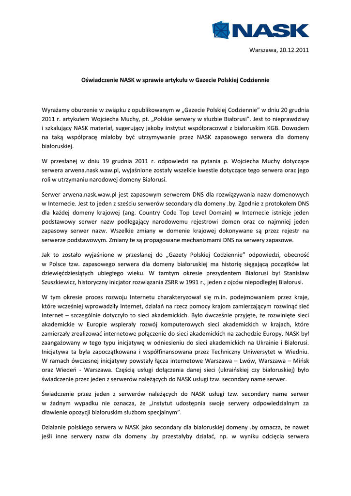 Warszawa, 20.12.2011 Oświadczenie NASK w sprawie artykułu w Gazecie Polskiej Codziennie Wyrażamy oburzenie w związku z opublikowanym w „Gazecie Polskiej Codziennie” w dniu 20 grudnia 2011 r. artykułem Wojciecha Muchy, pt. „Polskie serwery w służbie Białorusi”. Jest to nieprawdziwy i szkalujący NASK materiał, sugerujący jakoby instytut współpracował z białoruskim KGB. Dowodem na taką współpracę miałoby być utrzymywanie przez NASK zapasowego serwera dla domeny białoruskiej. W przesłanej w dniu 19 grudnia 2011 r. odpowiedzi na pytania p. Wojciecha Muchy dotyczące serwera arwena.nask.waw.pl, wyjaśnione zostały wszelkie kwestie dotyczące tego serwera oraz jego roli w utrzymaniu narodowej domeny Białorusi. Serwer arwena.nask.waw.pl jest zapasowym serwerem DNS dla rozwiązywania nazw domenowych w Internecie. Jest to jeden z sześciu serwerów secondary dla domeny .by. Zgodnie z protokołem DNS dla każdej domeny krajowej (ang. Country Code Top Level Domain) w Internecie istnieje jeden podstawowy serwer nazw podlegający narodowemu rejestrowi domen oraz co najmniej jeden zapasowy serwer nazw. Wszelkie zmiany w domenie krajowej dokonywane są przez rejestr na serwerze podstawowym. Zmiany te są propagowane mechanizmami DNS na serwery zapasowe. Jak to zostało wyjaśnione w przesłanej do „Gazety Polskiej Codziennie” odpowiedzi, obecność w Polsce tzw. zapasowego serwera dla domeny białoruskiej ma historię sięgającą początków lat dziewięćdziesiątych ubiegłego wieku. W tamtym okresie prezydentem Białorusi był Stanisław Szuszkiewicz, historyczny inicjator rozwiązania ZSRR w 1991 r., jeden z ojców niepodległej Białorusi. W tym okresie proces rozwoju Internetu charakteryzował się m.in. podejmowaniem przez kraje, które wcześniej wprowadziły Internet, działań na rzecz pomocy krajom zamierzającym rozwinąć sieć Internet – szczególnie dotyczyło to sieci akademickich. Było ówcześnie przyjęte, że rozwinięte sieci akademickie w Europie wspierały rozwój komputerowych sieci akademickich w krajach, które zamierzały zrealizować internetowe połączenie do sieci akademickich na zachodzie Europy. NASK był zaangażowany w tego typu inicjatywę w odniesieniu do sieci akademickich na Ukrainie i Białorusi. Inicjatywa ta była zapoczątkowana i współfinansowana przez Techniczny Uniwersytet w Wiedniu. W ramach ówczesnej inicjatywy powstały łącza internetowe Warszawa – Lwów, Warszawa – Mińsk oraz Wiedeń - Warszawa. Częścią usługi dołączenia danej sieci (ukraińskiej czy białoruskiej) było świadczenie przez jeden z serwerów należących do NASK usługi tzw. secondary name serwer. Świadczenie przez jeden z serwerów należących do NASK usługi tzw. secondary name serwer w żadnym wypadku nie oznacza, że „instytut udostępnia swoje serwery odpowiedzialnym za dławienie opozycji białoruskim służbom specjalnym”. Działanie polskiego serwera w NASK jako secondary dla białoruskiej domeny .by oznacza, że nawet jeśli inne serwery nazw dla domeny .by przestałyby działać, np. w wyniku odcięcia serwera podstawowego przez reżim Łukaszenki – użytkownicy Internetu na Białorusi mogliby przez jakiś czas korzystać z serwisu DNS, który jest podstawowym protokołem przy korzystaniu z Internetu. Powyższa informacja jasno wskazuje, iż działania NASK nie tylko nie przyczyniają się do tłumienia wolności słowa i ograniczania swobód, ale mogą mieć istotny wpływ na poszerzanie sfery wolności w kraju naszych sąsiadów. Z tych samych powodów z terytorium Polski nadawany jest program Biełsat TV, kanał telewizji satelitarnej w języku białoruskim i z tych samych powodów wiele czasopism i książek dla Białorusinów drukowanych jest w naszym kraju. Artykuł p. Muchy wskazuje na całkowite, być może celowe, niezrozumienie tych intencji, zawartych w przygotowanej przez nas odpowiedzi na zadane pytania. W związku z opublikowaniem tego kłamliwego i wprowadzającego w błąd opinię publiczną artykułu, NASK podejmie odpowiednie kroki prawne. Reasumując: Znajdujący się w NASK serwer jest zapasowym serwerem dla domeny .by. i jednym z sześciu istniejących serwerów zapasowych dla tej domeny. Istnienie serwerów zapasowych ma umożliwić korzystanie z zasobów Internetu w razie awarii systemu podstawowego. Rozwiązanie, o którym mowa istnieje od początku lat dziewięćdziesiątych i związane jest z wzajemną pomocą państw tworzących wtedy podstawy Internetu. NASK nie współpracuje z żadnymi służbami specjalnymi białoruskiego państwa. Działania NASK nie tylko nie przyczyniają się do tłumienia wolności słowa i ograniczania swobód, ale mogą mieć istotny wpływ na poszerzanie sfery wolności w kraju naszych sąsiadów. Dlatego też tym bardziej niezrozumiałe są intencje red. Muchy, których konsekwencją może być wyłączenie tego serwera. Informacja o NASK NASK jest instytutem badawczym podległym Ministerstwu Nauki i Szkolnictwa Wyższego. Celem badań naukowych jest opracowywanie rozwiązań zwiększających efektywność, niezawodność i bezpieczeństwo sieci teleinformatycznych oraz innych złożonych systemów sieciowych. Istotne miejsce zajmują badania dotyczące biometrycznych metod weryfikacji tożsamości w bezpieczeństwie usług. Kluczowym polem aktywności NASK są działania związane z zapewnieniem bezpieczeństwa Internetu. Reagowaniem na zdarzenia naruszające bezpieczeństwo sieci zajmuje się zespół CERT Polska (Computer Emergency Response Team). Jako operator telekomunikacyjny NASK oferuje innowacyjne rozwiązania teleinformatyczne dla klientów finansowych, biznesowych, administracji i nauki (m.in. ARAKIS - system wczesnego ostrzegania o zagrożeniach w sieci). NASK prowadzi także rejestr narodowej domeny .PL. Ważną rolę pełni działalność edukacyjna i popularyzacja idei społeczeństwa informacyjnego. W Akademii NASK prowadzone są unikatowe szk