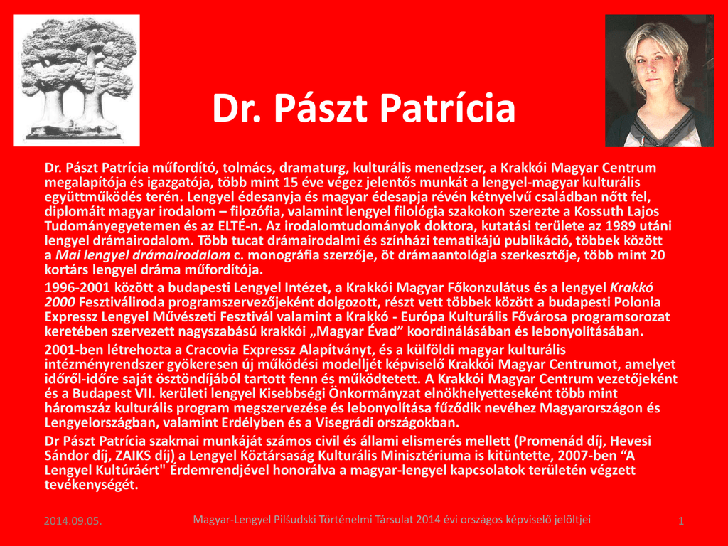 Dr. Pászt Patrícia Dr. Pászt Patrícia műfordító, tolmács, dramaturg, kulturális menedzser, a Krakkói Magyar Centrum megalapítója és igazgatója, több mint 15 éve végez jelentős munkát a lengyel-magyar kulturális együttműködés terén. Lengyel édesanyja és magyar édesapja révén kétnyelvű családban nőtt fel, diplomáit magyar irodalom – filozófia, valamint lengyel filológia szakokon szerezte a Kossuth Lajos Tudományegyetemen és az ELTÉ-n. Az irodalomtudományok doktora, kutatási területe az 1989 utáni lengyel drámairodalom. Több tucat drámairodalmi és színházi tematikájú publikáció, többek között a Mai lengyel drámairodalom c. monográfia szerzője, öt drámaantológia szerkesztője, több mint 20 kortárs lengyel dráma műfordítója. 1996-2001 között a budapesti Lengyel Intézet, a Krakkói Magyar Főkonzulátus és a lengyel Krakkó 2000 Fesztiváliroda programszervezőjeként dolgozott, részt vett többek között a budapesti Polonia Expressz Lengyel Művészeti Fesztivál valamint a Krakkó - Európa Kulturális Fővárosa programsorozat keretében szervezett nagyszabású krakkói „Magyar Évad” koordinálásában és lebonyolításában. 2001-ben létrehozta a Cracovia Expressz Alapítványt, és a külföldi magyar kulturális intézményrendszer gyökeresen új működési modelljét képviselő Krakkói Magyar Centrumot, amelyet időről-időre saját ösztöndíjából tartott fenn és működtetett. A Krakkói Magyar Centrum vezetőjeként és a Budapest VII. kerületi lengyel Kisebbségi Önkormányzat elnökhelyetteseként több mint háromszáz kulturális program megszervezése és lebonyolítása fűződik nevéhez Magyarországon és Lengyelországban, valamint Erdélyben és a Visegrádi országokban. Dr Pászt Patrícia szakmai munkáját számos civil és állami elismerés mellett (Promenád díj, Hevesi Sándor díj, ZAIKS díj) a Lengyel Köztársaság Kulturális Minisztériuma is kitüntette, 2007-ben “A Lengyel Kultúráért" Érdemrendjével honorálva a magyar-lengyel kapcsolatok területén végzett tevékenységét. 2014.09.05. Magyar-Lengyel Pilśudski Történelmi Társulat 2014 évi országos képviselő jelöltjei 1 dr Patrycja Pászt Dr Patrycja Pászt - założyciel i dyrektor Centrum Węgierskiego w Krakowie, działa od ponad 15 lat na rzecz propagowania kultury polskiej na Węgrzech i kultury węgierskiej w Polsce. Pochodzi z mieszanej rodziny (ojciec Węgier, matka pochodzenia polskiego). Odbyła studia w zakresie polonistyki, hungarystyki i filozofii w Krakowie, Budapeszcie i Debreczynie. W roku 2011 uzyskała stopień doktora w dziedzinie polskiego dramatu współczesnego. Od ponad 20 lat zajmuje się tłumaczeniem dzieł literackich, będąc równocześnie łącznikiem pomiędzy kulturami obu krajów. Pracowała w Instytucie Polskim w Budapeszcie, Biurze Festiwalowym Kraków 2000 oraz Konsulacie Węgierskim w Krakowie jako organizator programów i kierownik projektów węgierskich. Od 2001 r. założyciel i dyrektor Centrum Węgierskiego w Krakowie, prezes Fundacji Cracovia Express, od 2006 r. Wiceprzewodnicząca Samorządu Mniejszości Polskiej VII dzielnicy w Budapeszcie, organizator ponad 300 polsko-węgierskich projektów w dziedzinie kultury w Polsce, na Węgrzech, Rumunii i krajach Wyszegradzkich. Redaktor i tłumacz pięciu nowych antologii poświęconych współczesnej dramaturgii polskiej i węgierskiej, autorka monografii pt. Nowa dramaturgia polska oraz licznych tłumaczeń literackich, w tym ponad 25 współczesnych dramatów polskich na język węgierski. Pomysłodawca, organizator i promotor kilkuset imprez w Polsce, na Węgrzech i w pozostałych Krajach Wyszegradzkich, z udziałem wybitnych artystów i gości z Polski, Węgier, Czech, Słowacji i Rumunii. Wyjątkowe zasługi Patrycji Pászt w pogłębianiu związków kulturalnych i współpracy polsko-węgierskiej zostały docenione m.in. nagrodami Ministerstwa Kultury RP (order „Zasłużony dla Kultury Polskiej”), Instytutu Teatralnego (Nagroda Teatralna im. Sandora Hevesi`ego), Stowarzyszenia ZAIKS (nagroda za przekłady literatury polskiej na język węgierski) oraz węgierskiej organizacji pozarządowej Promenada (nagroda „Promenada”). 2014.09.05. Magyar-Lengyel Pilśudski Történelmi Társulat 2014 évi országos képviselő jelöltjei 2 Buskó András Buskó András vasútépítő mérnök, környezetvédelmi-környezetgazdálkodási szakmérnök és szakértő. 1979 óta foglalkozik a magyar-lengyel történelmi, kulturális és gazdasági kérdésekkel. 2000-ben alapítója volt a rákosligeti Magyar-Lengyel Baráti Körnek. A társaság 2010-ben elnyerte a Magyarországi Lengyelekért-díjat. 2002 óta a Budapest Főváros XVII. kerületi Lengyel Nemzetiségi Önkormányzat elnöke, 2008-ban ebben a kerületben szentelték fel Magyarország II. János Pál pápáról készült első egészalakos szobrát. Számos kerületi és országos lengyel konferencia szervezője és résztvevője. A magyar és lengyel történelmmel kapcsolatos írásai a www.leki17.hu honlapon találhatók. A Közszolgálati Egyetem részére elkészítette a magyarországi lengyelekről szóló etnoszociográfiai értekezést. 2003 óta az Országos Lengyel Önkormányzat tagja, 2007 óta alelnöke. 2003 óta részt vett a Magyarországi Lengyelség Múzeuma és Levéltára valamint az Országos Lengyel Nyelvoktató Iskola építésében. Lengyelországi utazásai során több mint 450 települést keresett fel és készített útikönyvet róluk. Összeállította az első lengyel-magyar enciklopédiát, és lengyel-magyar akusztikai, textilipari és informatikai szótárat szerkesztett. 2004-től tagja a Magyar Honvédvadász Hagyományőrző és Sport Szakosztálynak és pártoló tagja az Aradi Vértanúk Egyesületnek, hagyományőr tüzér százados rendfokozattal rendelkezik. 2010-ben I. fokozatú „Złoty Medal Opiek