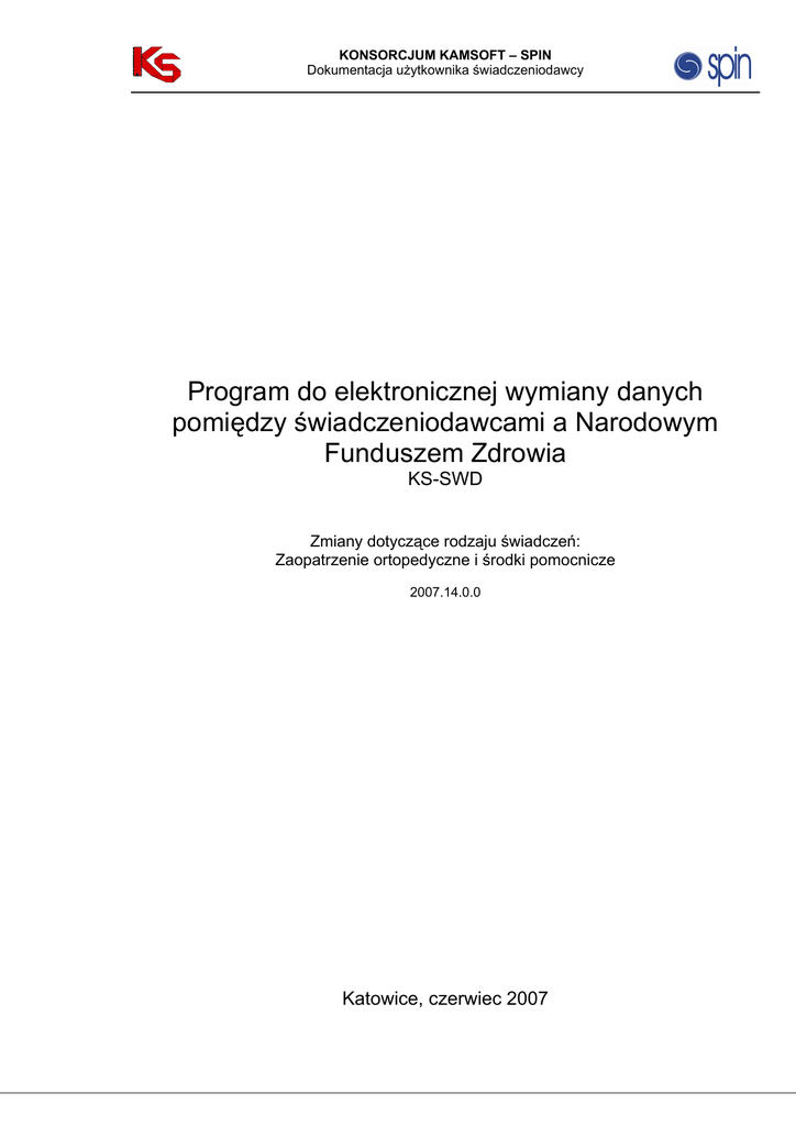 KONSORCJUM KAMSOFT – SPIN Dokumentacja użytkownika świadczeniodawcy Program do elektronicznej wymiany danych pomiędzy świadczeniodawcami a Narodowym Funduszem Zdrowia KS-SWD Zmiany dotyczące rodzaju świadczeń: Zaopatrzenie ortopedyczne i środki pomocnicze 2007.14.0.0 Katowice, czerwiec 2007 KONSORCJUM KAMSOFT – SPIN Dokumentacja użytkownika świadczeniodawcy KS-SWD Zaopatrzenie ortopedyczne Strona 2 z 16 KONSORCJUM KAMSOFT – SPIN Dokumentacja użytkownika świadczeniodawcy KS-SWD Zaopatrzenie ortopedyczne SPIS TREŚCI 1 Rejestracja realizacji zaopatrzenia .........................................................................................................5 1.1 Wprowadzanie realizacji zaopatrzenia ................................................................................................5 1.1.1 Funkcja dodawania - zmiany............................................................................................................5 1.1.2 Pierwsza rejestracja wykonania świadczenia ..................................................................................5 1.1.3 Rejestracja wykonania świadczenia.................................................................................................6 1.1.4 Uzupełnianie karty Realizacji zaopatrzenia .....................................................................................6 1.1.4.1 Uzupełnienie informacji podstawowych – pola wymagane...........................................................6 1.1.4.2 Uzupełnienie informacji o zleceniu ...............................................................................................6 1.1.4.3 Uzupełnienie informacji o produktach w ramach kontaktu ...........................................................9 1.1.4.4 Zapis realizacji zaopatrzenia.......................................................................................................11 1.2 Sprawozdanie z realizacji zaopatrzenie ortopedycznego .................................................................11 1.2.1 Tworzenie sprawozdania z realizacji zaopatrzenia........................................................................11 1.2.2 Sprawdzenie raportu statystycznego .............................................................................................12 1.2.3 Zatwierdzenie raportu statystycznego ...........................................................................................12 1.2.4 Generowanie komunikatu statystycznego do OW NFZ .................................................................12 1.3 Potwierdzenie danych sprawozdawczych .........................................................................................13 2 Modyfikacja danych zarejestrowanych w formacie niezgodnym z Zarządzeniem nr 32/2007.............13 2.1 Modyfikacja / dodanie informacji o zleceniu ......................................................................................13 2.2 Modyfikacja realizacji zaopatrzenia wprowadzonej w dotychczasowej wersji systemu....................13 Strona 3 z 16 KONSORCJUM KAMSOFT – SPIN Dokumentacja użytkownika świadczeniodawcy KS-SWD Zaopatrzenie ortopedyczne Szanowni Państwo! W związku z Zarządzeniem nr 32/2007 Prezesa NFZ z dnia 28.maja 2007 roku w systemie świadczeniodawcy KS-SWD zostały wprowadzone zmiany dotyczące rodzaju świadczeń: Zaopatrzenie w przedmioty ortopedyczne i środki pomocnicze. Wprowadzone modyfikacje dotyczą przede wszystkim dostosowania systemu do zmian w formacie wymiany danych. Zmiana ma wpływ na sposób wprowadzania realizacji świadczeń. W związku z powyższym prosimy o zapoznanie się z załączoną dokumentacją! Strona 4 z 16 KONSORCJUM KAMSOFT – SPIN Dokumentacja użytkownika świadczeniodawcy KS-SWD Zaopatrzenie ortopedyczne 1 Rejestracja realizacji zaopatrzenia W celu wprowadzenia realizacji wydania lub naprawy środka pomocniczego należ wybrać opcję Rejestracja – Wykonane usługi. Czynność ta spowoduje wyświetlenie okna Lista produktów. Rysunek 1-1 Przykładowe okno produktów 1.1 Wprowadzanie realizacji zaopatrzenia 1.1.1 Funkcja dodawania - zmiany W nowej wersji systemu, ze względu na rozbieżności we wprowadzaniu danych zależne od rodzaju wprowadzanych świadczeń, zmodyfikowane zostały funkcje rejestracji produktu. Dotychczasowe funkcje Nowe funkcje Domyślnie przy pierwszej próbie dodania realizacji wydania/naprawy produktu klawisz dodawania (F2) ustawiony jest w pozycji dodawania wizyty ambulatoryjnej. Uwaga! Opcja F2-Dodaj wizytę służy do wprowadzania świadczeń ambulatoryjnych. Wybór opcji nie pozwoli realizatorowi zarejestrować wykonania świadczenia na podstawie karty/wniosku na zaopatrzenie. 1.1.2 Pierwsza rejestracja wykonania świadczenia Rejestracja pierwszego świadczenia w rodzaju: zaopatrzenie w przedmioty ortopedyczne i środki pomocnicze, wymaga wybrania opcji Dodaj… . Kliknięcie w funkcję spowoduje wyświetlenie dodatkowego menu, z którego należy wybrać opcję Dodaj realizację zaopatrzenia. Rysunek 1-2 Wybór opcji rejestracji realizacji zaopatrzenia Czynność spowoduje: • wyświetlenie Karty realizacji zaopatrzenia – dodawanie Strona 5 z 16 KONSORCJUM KAMSOFT – SPIN Dokumentacja użytkownika świadczeniodawcy KS-SWD Zaopatrzenie ortopedyczne • ustawienie domyślnej funkcji dodawania na F2-Dodaj realizację zaopatrzenia [funkcja będzie domyślnie aktywna również po zamknięciu i ponownym uruchomieniu programu] 1.1.3 Rejestracja wykonania świadczenia Czynność rejestracji kolejnych realizacji zaopatrzenia wykonuje się wybierając opcję F2-Dodaj realizację zaopatrzenia . Czynność spowoduje wyświetlenie Karty realizacji zaopatrzenia – dodawanie. 1.1.4 Uzupełnianie karty Realizacji zaopatrzenia Karta realizacji zaopatrzenia zbliżona jest wizualnie do dotychczasowej formatki Karty kontaktu. Rysunek 1-3 Przykładowa karta realizacji zaopatrzenia – dodawanie 1.1.4.1 Uzupełnienie informacji podstawowych – pola wymagane W celu rejestr