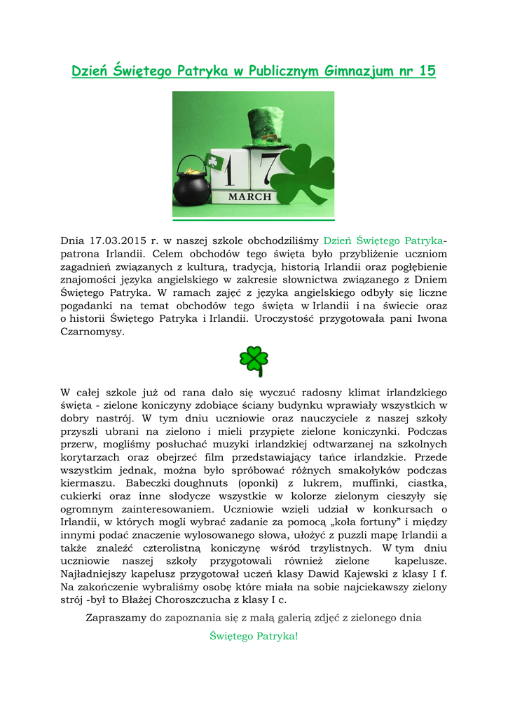 Dzień Świętego Patryka w Publicznym Gimnazjum nr 15 Dnia 17.03.2015 r. w naszej szkole obchodziliśmy Dzień Świętego Patrykapatrona Irlandii. Celem obchodów tego święta było przybliżenie uczniom zagadnień związanych z kulturą, tradycją, historią Irlandii oraz pogłębienie znajomości języka angielskiego w zakresie słownictwa związanego z Dniem Świętego Patryka. W ramach zajęć z języka angielskiego odbyły się liczne pogadanki na temat obchodów tego święta w Irlandii i na świecie oraz o historii Świętego Patryka i Irlandii. Uroczystość przygotowała pani Iwona Czarnomysy. W całej szkole już od rana dało się wyczuć radosny klimat irlandzkiego święta - zielone koniczyny zdobiące ściany budynku wprawiały wszystkich w dobry nastrój. W tym dniu uczniowie oraz nauczyciele z naszej szkoły przyszli ubrani na zielono i mieli przypięte zielone koniczynki. Podczas przerw, mogliśmy posłuchać muzyki irlandzkiej odtwarzanej na szkolnych korytarzach oraz obejrzeć film przedstawiający tańce irlandzkie. Przede wszystkim jednak, można było spróbować różnych smakołyków podczas kiermaszu. Babeczki doughnuts (oponki) z lukrem, muffinki, ciastka, cukierki oraz inne słodycze wszystkie w kolorze zielonym cieszyły się ogromnym zainteresowaniem. Uczniowie wzięli udział w konkursach o Irlandii, w których mogli wybrać zadanie za pomocą „koła fortuny” i między innymi podać znaczenie wylosowanego słowa, ułożyć z puzzli mapę Irlandii a także znaleźć czterolistną koniczynę wśród trzylistnych. W tym dniu uczniowie naszej szkoły przygotowali również zielone kapelusze. Najładniejszy kapelusz przygotował uczeń klasy Dawid Kajewski z klasy I f. Na zakończenie wybraliśmy osobę które miała na sobie najciekawszy zielony strój -był to Błażej Choroszczucha z klasy I c. Zapraszamy do zapoznania się z małą galerią zdjęć z zielonego dnia Świętego Patryka!