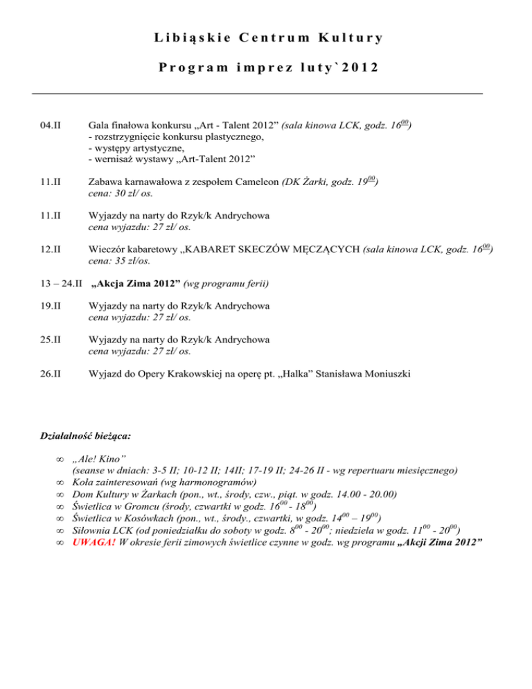 Libiąskie Centrum Kultury Program imprez luty`2012 04.II Gala finałowa konkursu „Art - Talent 2012” (sala kinowa LCK, godz. 1600) - rozstrzygnięcie konkursu plastycznego, - występy artystyczne, - wernisaż wystawy „Art-Talent 2012” 11.II Zabawa karnawałowa z zespołem Cameleon (DK Żarki, godz. 1900) cena: 30 zł/ os. 11.II Wyjazdy na narty do Rzyk/k Andrychowa cena wyjazdu: 27 zł/ os. 12.II Wieczór kabaretowy „KABARET SKECZÓW MĘCZĄCYCH (sala kinowa LCK, godz. 1600) cena: 35 zł/os. 13 – 24.II „Akcja Zima 2012” (wg programu ferii) 19.II Wyjazdy na narty do Rzyk/k Andrychowa cena wyjazdu: 27 zł/ os. 25.II Wyjazdy na narty do Rzyk/k Andrychowa cena wyjazdu: 27 zł/ os. 26.II Wyjazd do Opery Krakowskiej na operę pt. „Halka” Stanisława Moniuszki Działalność bieżąca: • • • • • • • „Ale! Kino” (seanse w dniach: 3-5 II; 10-12 II; 14II; 17-19 II; 24-26 II - wg repertuaru miesięcznego) Koła zainteresowań (wg harmonogramów) Dom Kultury w Żarkach (pon., wt., środy, czw., piąt. w godz. 14.00 - 20.00) Świetlica w Gromcu (środy, czwartki w godz. 1600 - 1800) Świetlica w Kosówkach (pon., wt., środy., czwartki, w godz. 1400 – 1900) Siłownia LCK (od poniedziałku do soboty w godz. 800 - 2000; niedziela w godz. 1100 - 2000) UWAGA! W okresie ferii zimowych świetlice czynne w godz. wg programu „Akcji Zima 2012”