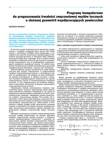 966 MECHANIK NR 11/2008 Programy komputerowe do prognozowania trwałości zmęczeniowej węzłów tocznych o złożonej geometrii współpracujących powierzchni BOGDAN WARDA* W pracy przedstawiono programy komputerowe służące do przewidywania trwałości zmęczeniowej zazębienia obiegowej przekładni cykloidalnej oraz mechanizmu krzywkowego z rolkowym popychaczem. Programy wykorzystują ogólną metodykę prognozowania trwałości zmęczeniowej par tocznych o złożonej geometrii współpracujących powierzchni. chanizmu krzywkowego z liniowym popychaczem rolkowym [7]. W oparciu o te metody zbudowano programy komputerowe służące do prognozowania trwałości zmęczeniowej zazębienia przekładni cykloidalnej oraz mechanizmu krzywkowego z rolkowym popychaczem. W licznych parach kinematycznych elementów napędu maszyn i urządzeń występuje tarcie toczne albo tarcie toczne z minimalnym udziałem tarcia ślizgowego, a obciążenie oraz warunki smarowania współpracujących elementów sprzyjają tworzeniu w obszarach styku elastohydrodynamicznego filmu olejowego. Ma to miejsce przede wszystkim w łożyskach tocznych, jak również w mechanizmach krzywkowych oraz w przekładniach wykorzystujących zazębienie o specjalnym zarysie. Te ostatnie urządzenia charakteryzuje ponadto skomplikowana geometria współpracujących elementów i złożony stan obciążenia. Główną postacią zużycia wymienionych wyżej węzłów tocznych jest zużycie zmęczeniowe, a prognozowanie trwałości zmęczeniowej jest jednym z ważniejszych etapów ich projektowania. Ze względu na duże podobieństwo zjawisk zachodzących w węzłach tocznych o złożonym kształcie współpracujących powierzchni do zjawisk towarzyszących zużyciu w konwencjonalnych łożyskach tocznych, w celu prognozowania ich trwałości postanowiono wykorzystać teoretyczne podstawy wytrzymałości zmęczeniowej łożysk tocznych. Współczesne metody przewidywania trwałości zmęczeniowej łożysk tocznych wykorzystują model obliczeniowy autorstwa Lundberga i Palmgrena [1, 2], oparty na statystycznej analizie pękania materiałów kruchych, opracowanej przez Weibulla i zakładający zawsze ograniczoną trwałość zmęczeniową łożyska. Pod koniec XX w. Ioannides i Harris opracowali podstawy nowej teorii trwałości łożysk tocznych opartej na hipotezie nieograniczonej wytrzymałości zmęczeniowej [3]. Jednocześnie w Politechnice Łódzkiej podjęto próbę opracowania podobnej metody w odniesieniu do łożysk tocznych produkcji polskiej, zakończoną opracowaniem ogólnej metodyki prognozowania trwałości zmęczeniowej łożysk tocznych [4, 5]. Metodyka wyznaczania trwałości zmęczeniowej łożysk tocznych została dostosowana do potrzeb obliczania trwałości zmęczeniowej węzłów tocznych o złożonym zarysie współpracujących powierzchni i posłużyła do opracowania ogólnej metodyki prognozowania trwałości zmęczeniowej takich węzłów. Jej zasady wykorzystano w numerycznej metodzie przewidywania trwałości węzłów tocznych, które występują w obiegowej przekładni cykloidalnej wykorzystującej zazębienie o specjalnym zarysie [6] oraz w analogicznej metodzie w odniesieniu do me- W modelu obliczeniowym zastosowanym w metodach prognozowania trwałości zmęczeniowej węzłów tocznych o złożonej geometrii współpracujących powierzchni prawdopodobieństwo trwałości ϕ jest funkcją: liczby cykli obciążenia, będącej iloczynem nagromadzonej liczby obrotów L i liczby cykli przypadających na jeden obrót u, różnicy kwadratów maksymalnych zastępczych naprężeń podpowierzchniowych σ , obliczonych według hipotezy Hubera, Misesa i Henckego oraz naprężenia granicznego σ g, głębokości występowania naprężeń podpowierzchniowych Z, umownej objętości materiału poddanego działaniu naprężeń ∆ V. * Dr inż. Bogdan Warda – Politechnika Łódzka, Katedra Konstrukcji Precyzyjnych Zarys metodyki prognozowania trwałości zmęczeniowej Model pozwala na uwzględnienie lokalnych zmian w trójwymiarowym rozkładzie naprężeń pod powierzchnią styku, wynikających z warunków obciążenia oraz ze złożonego kształtu współpracujących powierzchni. Model stosuje się przede wszystkim do prognozowania trwałości zazębienia obiegowej przekładni cykloidalnej. Przekładnia wykorzystuje w układzie przeniesienia mocy wewnętrzne, pozaśrodkowe zazębienie cykloidalne, które tworzą specjalne koła obiegowe o liczbie zębów równej przełożeniu przekładni: zs = i, współpracujące z nieruchomym zestawem zk rolek. Uzębienie kół ma postać ekwidystanty epicykloidy skróconej. O trwałości zazębienia takiej przekładni decyduje zużycie zmęczeniowe zębów koła obiegowego lub rolek koła współpracującego. Budowa przekładni oraz zasada jej działania zostały przedstawione w [8]. Opisany w [6] sposób modelowania obszaru poddanego działaniu naprężeń podpowierzchniowych w styku rolki nieruchomego koła współpracującego z zębem koła obiegowego (rys. 1) pozwolił na sformułowanie zależności umożliwiających obliczenie przewidywanej trwałości zmęczeniowej uzębienia koła obiegowego oraz rolek nieruchomego koła współpracującego. Trwałość pojedynczego zęba Le, wyrażoną w liczbie obrotów wału napędowego przekładni, wyznacza się z równania: (1) a trwałość całego uzębienia LE ze wzoru: (2) MECHANIK NR 11/2008 967 gdzie: zr = (zl – 1) / ur. Trwałość LR wszystkich rolek współpracujących z kołem obiegowym określa wzór: (6) Drugim zastosowaniem modelu obliczeniowego trwałości zmęczeniowej jest przewidywanie trwałości mechanizmu krzywkowego z rolkowym popychaczem liniowym. Modelowanie obszaru poddanego działaniu naprężeń podpowierzchniowych (rys. 2) omówiono w [7]. Poniżej przedstawiono równania pozwaRys. 1. Modelowanie obszaru poddanego działaniu naprężeń podpowierzchniowych w zazębieniu obiegowej przekładni cykloidaln