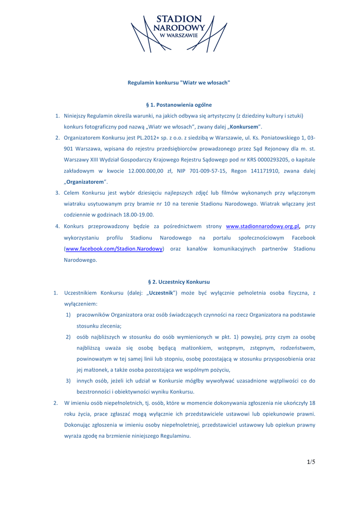 Regulamin konkursu "Wiatr we włosach" § 1. Postanowienia ogólne 1. Niniejszy Regulamin określa warunki, na jakich odbywa się artystyczny (z dziedziny kultury i sztuki) konkurs fotograficzny pod nazwą „Wiatr we włosach”, zwany dalej „Konkursem”. 2. Organizatorem Konkursu jest PL.2012+ sp. z o.o. z siedzibą w Warszawie, ul. Ks. Poniatowskiego 1, 03-‐ 901 Warszawa, wpisana do rejestru przedsiębiorców prowadzonego przez Sąd Rejonowy dla m. st. Warszawy XIII Wydział Gospodarczy Krajowego Rejestru Sądowego pod nr KRS 0000293205, o kapitale zakładowym w kwocie 12.000.000,00 zł, NIP 701-‐009-‐57-‐15, Regon 141171910, zwana dalej „Organizatorem”. 3. Celem Konkursu jest wybór dziesięciu najlepszych zdjęć lub filmów wykonanych przy włączonym wiatraku usytuowanym przy bramie nr 10 na terenie Stadionu Narodowego. Wiatrak włączany jest codziennie w godzinach 18.00-‐19.00. 4. Konkurs przeprowadzony będzie za pośrednictwem strony www.stadionnarodowy.org.pl, przy wykorzystaniu profilu Stadionu Narodowego na portalu społecznościowym Facebook (www.facebook.com/Stadion.Narodowy) oraz kanałów komunikacyjnych partnerów Stadionu Narodowego. § 2. Uczestnicy Konkursu 1. Uczestnikiem Konkursu (dalej: „Uczestnik”) może być wyłącznie pełnoletnia osoba fizyczna, z wyłączeniem: 1) pracowników Organizatora oraz osób świadczących czynności na rzecz Organizatora na podstawie stosunku zlecenia; 2) osób najbliższych w stosunku do osób wymienionych w pkt. 1) powyżej, przy czym za osobę najbliższą uważa się osobę będącą małżonkiem, wstępnym, zstępnym, rodzeństwem, powinowatym w tej samej linii lub stopniu, osobę pozostającą w stosunku przysposobienia oraz jej małżonek, a także osoba pozostająca we wspólnym pożyciu, 3) innych osób, jeżeli ich udział w Konkursie mógłby wywoływać uzasadnione wątpliwości co do bezstronności i obiektywności wyniku Konkursu. 2. W imieniu osób niepełnoletnich, tj. osób, które w momencie dokonywania zgłoszenia nie ukończyły 18 roku życia, prace zgłaszać mogą wyłącznie ich przedstawiciele ustawowi lub opiekunowie prawni. Dokonując zgłoszenia w imieniu osoby niepełnoletniej, przedstawiciel ustawowy lub opiekun prawny wyraża zgodę na brzmienie niniejszego Regulaminu. 1/5 § 3. Warunki udziału w konkursie 1. Zgłoszeniem uczestnictwa w Konkursie jest przesłanie jednego zdjęcia lub filmu wykonanego przy włączonym wiatraku usytuowanym przy bramie nr 10 na terenie Stadionu Narodowego. Wiatrak włączany jest codziennie w godzinach 18.00-‐19.00. Zgłoszenie uczestnictwa równoznaczne jest z akceptacją niniejszego Regulaminu. 2. Dokonując zgłoszenia Uczestnik oświadcza, iż: 1) z zastrzeżeniem § 2. ust. 2 Regulaminu, jest autorem zdjęcia zgłoszonego przez niego do Konkursu; 2) zgłoszone przez niego zdjęcie jest oryginalne, bez niedozwolonych zapożyczeń z utworów osób trzecich, i że zgłaszając zdjęcie nie narusza praw osób trzecich, w tym w szczególności praw osobistych i majątkowych, a także dóbr osobistych osób trzecich; 3) przysługują mu autorskie prawa majątkowe do zgłoszonego zdjęcia w zakresie umożliwiającym udzielenie licencji, zgodnie z ust. 3 poniżej. 3. W przypadku, jeżeli przesłane zdjęcie stanowi utwór w rozumieniu Ustawy z 4 lutego 1994 r. o prawie autorskim i prawach pokrewnych, Uczestnik z momentem dokonania zgłoszenia udziela Organizatorowi niewyłącznej, nieodpłatnej licencji do zdjęcia/filmu przesłanego w ramach zgłoszenia do konkursu, bez ograniczeń czasowych lub terytorialnych, obejmującą następujące pola eksploatacji: 1) w zakresie utrwalania lub zwielokrotniania zdjęcia/filmu – wytwarzanie dowolną techniką, dowolnymi środkami i w dowolnej formie egzemplarzy zdjęcia, w tym również wprowadzania go w formie zapisu cyfrowego i do sieci informatycznej (Internetu) 2) w zakresie obrotu egzemplarzami zdjęcia/filmu -‐ wprowadzanie do obrotu, użyczenie lub najem egzemplarzy zdjęcia; 3) w zakresie rozpowszechniania zdjęcia/filmu -‐ publiczne wykonanie, wystawienie, wyświetlenie, odtworzenie oraz nadawanie i reemitowanie, jak również publiczne udostępnianie zdjęcia w taki sposób, aby każdy mógł mieć do niego dostęp w miejscu i w czasie przez siebie wybranym, a w szczególności umieszczenie zdjęcia na stronie www.stadionnarodowy.org.pl oraz profilu Stadionu Narodowego na portalu społecznościowym Facebook. 4. Z momentem dokonania zgłoszenia Uczestnik udziela Organizatorowi również zezwolenia na wykonywanie zależnego prawa autorskiego w stosunku do zdjęcia przesłanego w ramach zgłoszenia. 5. Uczestnik oświadcza, iż dysponuje pisemną zgodą osób, których wizerunek utrwalono na zdjęciu przesłanym przez Uczestnika w ramach zgłoszenia, na rozpowszechnianie przez Organizatora ich wizerunku, a w szczególności na: 1) zamieszczeniu na stronie www.stadionnarodowy.org.pl oraz na profilu Stadionu Narodowego na serwisie Facebook zdjęcia zawierającego wizerunek tej osoby; 2/5 2) wykorzystaniu wizerunku tych osób w materiałach reklamowych i promocyjnych Organizatora, jak również w materiałach stworzonych na użytek wewnętrzny Organizatora; przy czym rozpowszechnianie wizerunku przez Organizatora może nastąpić w dowolnej formie i dowolnej oprawie graficznej. 6. Odpowiedzialność za zgodność z prawdą oświadczeń, o których mowa w ust. 2 oraz ust. 5 niniejszego paragrafu, ponosi Uczestnik. Organizator nie ponosi odpowiedzialności za jakiekolwiek konsekwencje nieprawdziwości oświadczeń, o których mowa w ust. 2 oraz ust. 5 niniejszego paragrafu, chociażby wynikała ona z lekkomyślności Uczestnika. § 4. Zasady i przebieg Konkursu 1. Termin nadsyłania zgłoszeń, o których mowa w § 3. ust. 1, upływa w dn. 28.08.2014 roku o godz. 23:59. Zgłoszenia przesłane po terminie określonym w zdaniu poprzedzającym nie będą brane przez Organizatora pod uwagę przy wyłanian