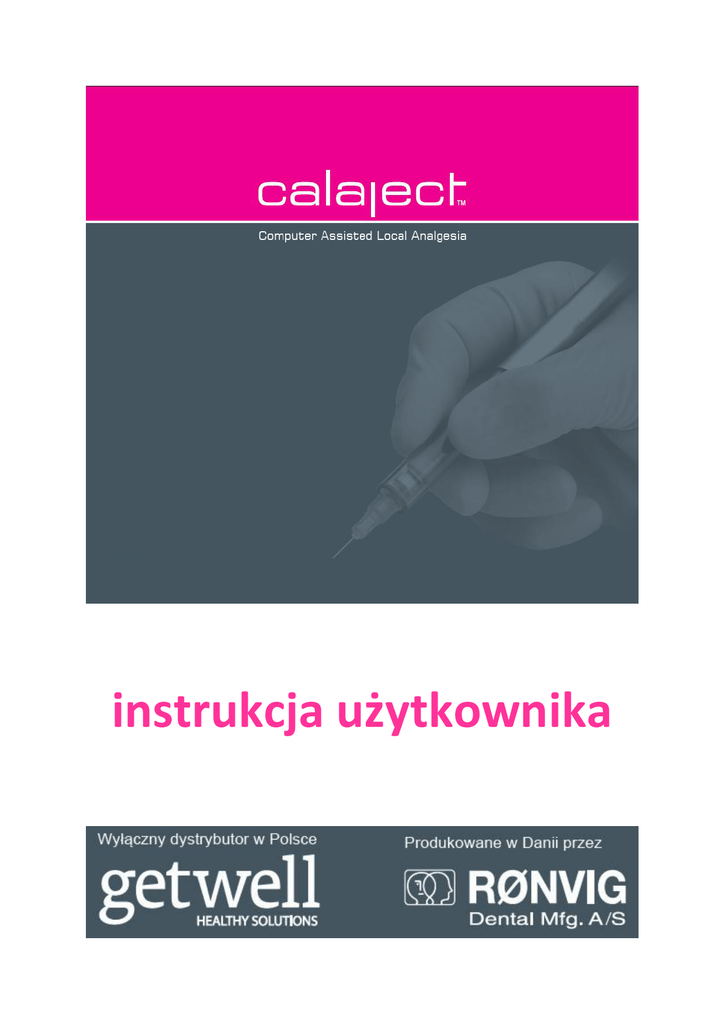 instrukcja użytkownika 1 SPIS TREŚCI SKŁAD SYSTEMU CALAJECT™ ............................................................................................................. 2 UNIT KONTROLNY................................................................................................................................. 3 PANEL PRZEDNI Z DOTYKOWYM WYŚWIETLACZEM........................................................................ 3 PRZYGOTOWANIE DO UŻYTKOWANIA .............................................................................................. 3 ZALECENIA ............................................................................................................................................. 4 CZYSZCZENIE ........................................................................................................................................ 4 GWARANCJA I NAPRAWA ..................................................................................................................... 4 PROGRAMY ............................................................................................................................................ 5 PROGRAM 1 ........................................................................................................................................ 5 PROGRAM 2 ........................................................................................................................................ 6 PROGRAM 3 ........................................................................................................................................ 6 PARAMETRY TECHNICZNE ................................................................................................................... 7 Prosimy o uważne przeczytanie instrukcji użytkownika przed rozpoczęciem korzystania z systemu znieczuleń komputerowych CALAJECT™. System znieczuleń CALAJECT™ może być używany wyłącznie przez przeszkolony personel mający uprawnienia do wykonywania iniekcji stomatologicznych. W związku z powyższym, instrukcja nie zawiera szczegółowych informacji na temat technik wykonywania iniekcji. Producent nie odpowiada za urazy pacjentów wynikające z niewłaściwego wykorzystania sprzętu lub stosowania przez osoby nieuprawnione. SKŁAD SYSTEMU CALAJECT™ Unit kontrolny Uchwyt dozujący Pedał sterujący Przezroczyste osłonki na wkład ze znieczuleniem - 15 szt. Podstawa do uchwytu i końcówki igły Ładowarka Instrukcja użytkownika (OPCJA DODATKOWA) Przewód do połączenia z wielofunkcyjnym pedałem sterującym unitu 2 UNIT KONTROLNY PANEL PRZEDNI Z DOTYKOWYM WYŚWIETLACZEM 1. Włączanie/wyłączanie; 2. Wskaźnik aktualnego ciśnienia/oporu iniekcji; 3. Wybór programu I, II, III; 4. R - wycofanie tłoka do pozycji startowej; 5. Wskaźnik poziomu naładowania baterii. PANEL TYLNY 6. Wejście zasilające (do ładowarki); 7. Wejście do przewodu uchwytu dozującego; 8. Wejście do pedału sterującego lub pedału sterującego unitu. W przypadku wielofunkcyjnych pedałów do unitu jest możliwe wykorzystanie wolnych łączy do sterowania urządzeniem CALAJECT™; 9. Regulacja głośności sygnału dźwiękowego; 10. Głośnik. PRZYGOTOWANIE DO UŻYTKOWANIA Podłącz przewód uchwytu do odpowiedniego gniazdka w panelu tylnym (7). - zwróć uwagę na czerwone kropki na gniazdku i wtyczce przewodu, muszą do siebie pasować. Aby odłączyć uchwyt dozujący, pociągnij wtyczkę do tyłu (nie należy jej obracać). CALAJECT™ nie powinien być umieszczany w pobliżu urządzeń, które są wrażliwe na zakłócenia elektromagnetyczne lub mogą je generować. Sprawdź stan naładowania baterii na panelu kontrolnym. Czas ładowania baterii to około 2 godziny. Czas użytkowania sprzętu, po pełnym naładowaniu, około 8 godzin. CALAJECT™ można używać również podczas ładowania. Przykręć igłę do przezroczystej osłonki i wsuń do niej wkład ze środkiem znieczulającym. Aby uniknąć wyciekania płynu do końcówki, zaleca się najpierw umieszczenie igły, a później założenie wkładu ze znieczuleniem. Końcówka uchwytu dozującego CALAJECT™ jest dostosowana do standardowych wkładów ze środkiem znieczulającym o pojemności 1,7/1,8ml (jak do karpuli) oraz do standardowych igieł stomatologicznych np.: 30G/12, 30G/25. Zamontuj załadowaną osłonkę (z igłą i środkiem znieczulającym) do uchwytu dozującego. Przed przykręceniem końcówki należy sprawdzić pozycję tłoka uchwytu - powinien być całkowicie schowany. Tłok cofa się automatycznie do pozycji początkowej przy każdorazowym włączeniu CALAJECT™. Tłok możemy także wycofać do pozycji początkowej po przyciśnięciu przycisku "R" na panelu dotykowym. 3 Naciśnij pedał sterujący i trzymaj wciśnięty aż do momentu, kiedy środek znieczulający pojawi się na końcu igły. Wybierz program. Przy ponownym wciśnięciu pedału, wybrany program zostanie aktywowany. CALAJECT™ zatrzyma się automatycznie po opróżnieniu ampułki ze środkiem znieczulającym. Wycofaj tłok poprzez naciśnięcie przycisku „R” na panelu głównym. CALAJECT™ zatrzyma się automatycznie po osiągnięciu maksymalnego ciśnienia wstrzykiwania, przewidzianego w ustawieniach danego programu. Sygnalizuje to długi sygnał dźwiękowy, a wskaźnik ciśnienia na panelu głównym, po dojściu do pozycji maksymalnej, wyłączy się. Przed kontynuowaniem znieczulenia należy odczekać chwilę lub zmienić pozycję igły. ZALECENIA Zaleca się, aby przed wykonaniem pierwszego znieczulenia wykonać próbne "iniekcje w powietrze" (bez wkłucia), co pozwoli na praktyczne zapoznanie się z trzema różnymi programami. CZYSZCZENIE Unit kontrolny, uchwyt dozujący oraz podstawę na uchwyt można czyścić wacikiem nasączonym standardowymi środkami do dezynfekcji powierzchni stosowanymi w stomatologii. Panelu głównego oraz uchwytu nie należy zanurzać w płynach. Nie sterylizować w autoklawie, ponieważ