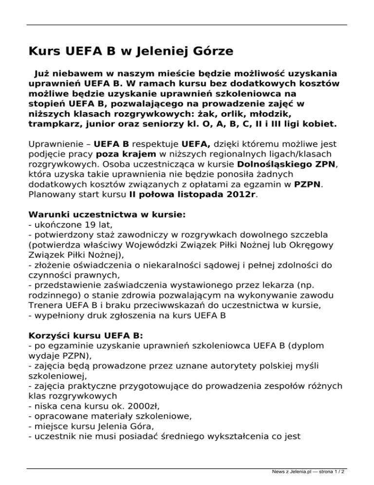 Kurs UEFA B w Jeleniej Górze Już niebawem w naszym mieście będzie możliwość uzyskania uprawnień UEFA B. W ramach kursu bez dodatkowych kosztów możliwe będzie uzyskanie uprawnień szkoleniowca na stopień UEFA B, pozwalającego na prowadzenie zajęć w niższych klasach rozgrywkowych: żak, orlik, młodzik, trampkarz, junior oraz seniorzy kl. O, A, B, C, II i III ligi kobiet. Uprawnienie – UEFA B respektuje UEFA, dzięki któremu możliwe jest podjęcie pracy poza krajem w niższych regionalnych ligach/klasach rozgrywkowych. Osoba uczestnicząca w kursie Dolnośląskiego ZPN, która uzyska takie uprawnienia nie będzie ponosiła żadnych dodatkowych kosztów związanych z opłatami za egzamin w PZPN. Planowany start kursu II połowa listopada 2012r. Warunki uczestnictwa w kursie: - ukończone 19 lat, - potwierdzony staż zawodniczy w rozgrywkach dowolnego szczebla (potwierdza właściwy Wojewódzki Związek Piłki Nożnej lub Okręgowy Związek Piłki Nożnej), - złożenie oświadczenia o niekaralności sądowej i pełnej zdolności do czynności prawnych, - przedstawienie zaświadczenia wystawionego przez lekarza (np. rodzinnego) o stanie zdrowia pozwalającym na wykonywanie zawodu Trenera UEFA B i braku przeciwwskazań do uczestnictwa w kursie, - wypełniony druk zgłoszenia na kurs UEFA B Korzyści kursu UEFA B: - po egzaminie uzyskanie uprawnień szkoleniowca UEFA B (dyplom wydaje PZPN), - zajęcia będą prowadzone przez uznane autorytety polskiej myśli szkoleniowej, - zajęcia praktyczne przygotowujące do prowadzenia zespołów różnych klas rozgrywkowych - niska cena kursu ok. 2000zł, - opracowane materiały szkoleniowe, - miejsce kursu Jelenia Góra, - uczestnik nie musi posiadać średniego wykształcenia co jest News z Jelenia.pl — strona 1 / 2 konieczne przy kursie instruktora piłki nożnej, - catering, - brak egzaminów wstępnych, - kurs prowadzony jest w przerwie między rozgrywkami (listopad-marzec), - stopień UEFA B daje, możliwość ubiegania się o dyplom Trenera UEFA A dający, możliwość prowadzenia zespołów do II ligi włącznie Uwaga! Trenerzy, którzy posiadają stopień instruktora piłki nożnej, istnieje możliwość zdobycia uprawnień UEFA B. Warunkiem jest przystąpienie do kursu wyrównawczego, który obejmuje jedynie 80 godzin zajęć. Warunkiem uczestnictwa jest udokumentowana praca od minimum roku z dziećmi i młodzieżą(potwierdza właściwy Wojewódzki Związek Piłki Nożnej lub Okręgowy Związek Piłki Nożnej). Kurs będzie prowadzony równolegle z kursem UEFA B. Koszt kursu wyrównawczego to ok. 1000zł. Zapisy i szczegółowe informacje: trener Marek Siatrak – tel.: 791 860 817 email: [email protected] Link do oryginalnej publikacji: http://jelenia.pl/Kurs_UEFA_B_w_Jeleniej_Gorze_n1536.html Wygenerowano: 03/03/2017 14:14:22 © Jelenia.pl News z Jelenia.pl — strona 2 / 2 Powered by TCPDF (www.tcpdf.org)