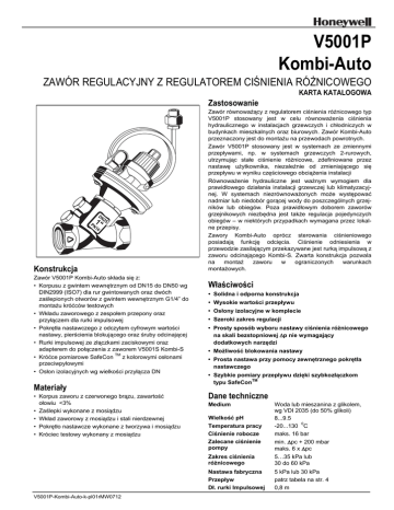 V5001P Kombi-Auto ZAWÓR REGULACYJNY Z REGULATOREM CIŚNIENIA RÓŻNICOWEGO KARTA KATALOGOWA Zastosowanie Zawór równoważący z regulatorem ciśnienia różnicowego typ V5001P stosowany jest w celu równoważenia ciśnienia hydraulicznego w instalacjach grzewczych i chłodniczych w budynkach mieszkalnych oraz biurowych. Zawór Kombi-Auto przeznaczony jest do montażu na przewodach powrotnych. Zawór V5001P stosowany jest w systemach ze zmiennymi przepływami, np. w systemach grzewczych 2-rurowych, utrzymując stałe ciśnienie różnicowe, zdefiniowane przez nastawę użytkownika, niezależnie od zmieniającego się przepływu w wyniku częściowego obciążenia instalacji Równoważenie hydrauliczne jest ważnym wymogiem dla prawidłowego działania instalacji grzewczej lub klimatyzacyjnej. W systemach niezrównoważonych może występować nadmiar lub niedobór gorącej wody do poszczególnych grzejników lub obiegów. Poza prawidłowym doborem zaworów grzejnikowych niezbędna jest także regulacja pojedynczych obiegów – w niektórych przypadkach wymagana przez lokalne przepisy. Zawory Kombi-Auto oprócz sterowania ciśnieniowego posiadają funkcję odcięcia. Ciśnienie odniesienia w przewodzie zasilającym przekazywane jest rurką impulsową z zaworu odcinającego Kombi-S. Zwarta konstrukcja pozwala na montaż zaworu w ograniczonych warunkach montażowych. Konstrukcja Zawór V5001P Kombi-Auto składa się z: • Korpusu z gwintem wewnętrznym od DN15 do DN50 wg DIN2999 (ISO7) dla rur gwintowanych oraz dwóch zaślepionych otworów z gwintem wewnętrznym G1/4” do montażu króćców testowych • Wkładu zaworowego z zespołem przepony oraz przyłączem dla rurki impulsowej • Pokrętła nastawczego z odczytem cyfrowym wartości nastawy, pierścienia blokującego oraz śruby odcinającej • Rurki impulsowej ze złączkami zaciskowymi oraz adapterem do połączenia z zaworem V5001S Kombi-S TM z kolorowymi osłonami • Króćce pomiarowe SafeCon przeciwpyłowymi • Osłon izolacyjnych wg wielkości przyłącza DN Materiały • Solidna i odporna konstrukcja • Wysokie wartości przepływu • Osłony izolacyjne w komplecie • Szeroki zakres regulacji • Prosty sposób wyboru nastawy ciśnienia różnicowego na skali bezstopniowej p nie wymagający dodatkowych narzędzi • Możliwość blokowania nastawy • Prosta nastawa przy pomocy zewnętrznego pokrętła nastawczego • Szybkie pomiary przepływu dzięki szybkozłączkom typu SafeConTM Dane techniczne • Korpus zaworu z czerwonego brązu, zawartość ołowiu <3% • Zaślepki wykonane z mosiądzu • Wkład zaworowy z mosiądzu i stali nierdzewnej • Pokrętło nastawcze wykonane z tworzywa i mosiądzu • Króciec testowy wykonany z mosiądzu V5001P-Kombi-Auto-k-pl01rMW0712 Właściwości Medium Wielkość pH Temperatura pracy Ciśnienie robocze Zalecane ciśnienie pompy 1 Woda lub mieszanina z glikolem, wg VDI 2035 (do 50% glikoli) 8...9.5 0 -20...130 C maks. 16 bar Zakres ciśnienia różnicowego min. pc + 200 mbar maks. 6 x pc 5…35 kPa lub 30 do 60 kPa Nastawa fabryczna Przepływ Dł. rurki Impulsowej 5 kPa lub 30 kPa patrz tabela na str. 4 0,8 m V5001P KOMBI-AUTO Montaż Działanie Zawór Kombi-Auto, montowany na przewodzie powrotnym współpracuje z zaworem odcinającym na przewodzie zasilającym np. Kombi-S. Zawór Kombi-S przekazuje impuls ciśnienia do regulatora zaworu Kombi-Auto oraz umożliwia pomiar ciśnienia różnicowego. Zawór Kombi-Auto dostarczany jest w komplecie z rurką impulsową oraz elementami złącznymi umożliwiającymi przyłącze zaworu Kombi-S, który można zamówić oddzielnie. Zawór V5001P Kombi-Auto jest montowany na przewodzie powrotnym. Wartość ciśnienia różnicowego określona dla pełnego obciążenia pionu jest wybierana pokrętłem (obrót w prawo zwiększanie wartości, obrót w lewo zmniejszanie). Wymagana wartość nastawy może być określona według poniżej zamieszczonej tabeli nr 3 lub 4, z wykorzystaniem programu doboru zamieszczonego na www.honeywellvalvesizing.com, lub bezpośrednio z projektu. Wymagany przepływ przy pełnym obciążeniu zwykle jest dobierany przez projektanta i musi być odpowiedni z punktu widzenia równoważenia hydraulicznego całego systemu. Wszystkie zawory muszą być montowane określonymi na korpusie kierunkami przepływu. zgodnie z UWAGA: Po uruchomieniu instalacji rurka impulsowa znajduje się pod ciśnieniem Pomiar przepływu i ciśnienia Przepływ czerwony - VM242A Kombi-Auto posiada szybkozłączny króciec pomiarowy typu SafeConTM umieszczony na korpusie regulatora membranowego oraz dwóch otworów w korpusie zaworu, w które można zamontować dodatkowe króćce typu SafeConTM umożliwiające pomiary przy użyciu przenośnego komputera np. VM242 BasicMes-2. Poniżej możliwości różnych pomiarów: + • Niebieski przewod: połączenie z Kombi-Auto (PT) • Czerwony przewód: połączenie z Kombi-S (SV) PT czerwony + VM242A Sv p obiegu Wymagany króciec pomiarowy na zaworze zasilającym, np. Kombi-S z króćcem typu SafeConTM niebieski Wymagany króciec pomiarowy na zaworze zasilającym, np. Kombi-S z króćcem typu SafeConTM niebieski - Wymagany górny króciec pomiarowy typu SafeConTM na korpusie zaworu Kombi-Auto • Czerwony przewód: połączenie z Kombi-S (SV) PR • Niebieski przewod: połączenie z Kombi-Auto (PR) p zaworu czerwony - VM242A Sv PV niebieski + Wymagane oba króćce pomiarowe typu SafeConTM na zaworze KombiAuto • Niebieski przewod: połączenie z górnym króćcem SafeConTM zaworu (PR) PR • Czerwony przewód: połączenie z dolnym króćcem SafeConTM zaworu (PV) Króćce SafeCon™ są dostępne jako akcesoria – patrz kolejny rozdział „Akcesoria”. W zależności od rodzaju pomiaru wymagane są króćce pomiarowe na zaworze Kombi-Auto i/lub na zaworze odcinającym Kombi-S (jeśli zastosowany). Jeśli użyto inny zawór na zasilaniu, należy zastosować inne metody pomiaru oraz zapewnić mo