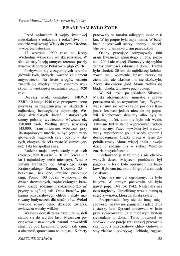 Teresa Mausolf (Jaskuła) - córka legionisty PISANE NAM BYŁO ŻYCIE Przed wybuchem II wojny światowej mieszkałam z rodzicami i rodzeństwem w osadzie wojskowej Władysin pow. Grodno, w woj. białostockim. 17 września 1939 roku na Kresy Wschodnie wkroczyły wojska rosyjskie. W ślad za rusyfikacją tamtych terenów poszły masowe deportacje Polaków w głąb ZSRR. Pozbywano się z zagarniętych terenów głównie tych, których uważano za element antysowiecki. Na liście wrogów ustroju znaleźli się między innymi osadnicy wojskowi, w większości uczestnicy wojny 1920 roku. Decyzją władz centralnych NKWD ZSRR 10 lutego 1940 roku przeprowadzono pierwszą najtragiczniejszą w skutkach i najbardziej bezwzględną deportację. Według dzisiejszych badań historycznych strony polskiej wywieziono wówczas ok. 250.000 osób. Według strony rosyjskiej 143.000. Transportowano wówczas przy 30-stopniowym mrozie, w bydlęcych zaryglowanych wagonach całe rodziny – starych, chorych, dzieci (często kilkumiesięczne). Taki los spotkał i nas. Rodzina moja liczyła wtedy pięć osób (rodzice, brat Ryszard – 10 lat, Teresa – 7 lat i najmłodszy sześć miesięcy). Wraz z innymi trafiliśmy do Ałtajskiego Kraju Krajnszynkiego Rajonu, Uczastok 25 – bezkresne, bezludne, mroźne pustkowie tajgi. Ponad 100 rodzin wpakowano do dwóch drewnianych, zapluskwionych baraków. Każdej rodzinie przydzielono 2,5 m2 pryczy w ogólnej sali. Obok baraków piekarnia przydziałowego chleba i mały murowany budyneczek dla strażników. Wokół wysokie sosny, pełno dzikiego zwierza, zwłaszcza watahy wilków. Wszyscy dorośli zaraz nazajutrz musieli stawić się do wyrębu lasu. Mężczyzn początkowo ustawionych parami prowadzili strażnicy pod karabinami, potem szli sami, a obecność sprawdzano na miejscu. Kobiety KRESOWE STANICE pracowały w tartaku odległym może z 6 km. W tej grupie była moja mama. W barakach pozostawali starzy, chorzy i dzieci. Nie było tu ani szkoły, ani przedszkola. Osoby pracujące otrzymywały 600 gram kwaśnego gliniastego chleba, pozostali 200 i nic więcej. Skończyły się szybko zapasy żywności zabranej z domu. Trzeba było chodzić 20 km do najbliższej kołchozowej wsi, wymienić lepsze rzeczy na ziemniaki, ale wkrótce i to się skończyło. Zaczął doskwierać głód. Mama zrobiła się blada i chuda, tatusiowi puchły nogi. W 1941 roku po układach SikorskiMajski otrzymaliśmy amnestię i prawo poruszania się po terytorium Rosji. Wyprowadziliśmy się wówczas do posiołka Krajuszki los nasz jednak niewiele się poprawił. Kołchozowe deputaty albo były w znikomej ilości, albo nie było ich wcale. Tatuś nie był w stanie wypracować trudodnia - normy. Przed wywózką był aresztowany, wykańczano go już wtedy głodem i dochodzeniami. Ciężka praca w lesie dopełniła reszty. Mama więcej dbała o swoje dzieci i rodzinę niż o siebie. Wkrótce zmarła z wycieńczenia. Pochowano ją w trumnie z nie oheblowanych desek. Miejscem pochówku był pagórek w lesie koło opisanych już baraków. Było tam już około 50 grobów samych Polaków. Cmentarz nie był ogrodzony, nie było księdza. W tamtym pustkowiu nie było nawet popa. Był rok 1942. Nastał dla nas czas tragiczny. Utraciliśmy wraz z mamą tą część żywności, którą zarabiała szyciem. Przeprowadziliśmy się do innej miejscowości (nazwy nie pamiętam) gdzie tatuś i starszy brat Ryszard pracowali w lesie przy żywicowaniu. Ja z młodszym bratem siedziałam w domu. Tatuś przynosił ze stołówki dwie porcje rzadziutkiej pracowniczej zupy i przydziałowy chleb. Gotowaliśmy zielsko - pokrzywę i lebiodę, zagęsz35 czaliśmy lurę, bo musiało starczyć dla wszystkich. W 1943 roku ojca powołano do I Dywizji im. T. Kościuszki. Pojechał na wezwanie, nasza trójka została sama. Ryszard 12 lat, ja 10, najmłodszy 3 latka. Starszy brat nadal pracował w lesie, ale wyżywić się z jednej marnej porcji zupy i przydziału teraz już zmniejszonej - porcji chleba było niemożliwością, Czasem i tej racji w stołówce po prostu dla nas nie starczyło. Ratowaliśmy się jak mogliśmy. Tuż po zimie zbieraliśmy na działkach miejscowej ludności zmarznięte, pojedyncze ziemniaki. Po silnych mrozach nie zgniły, kiedy słonko przygrzało, wyschły i rozsypywały się w krochmal. Zbieraliśmy to, zagniatali z zaparzonym zielskiem i piekli placki na płycie. Jeżeli zdobyliśmy przydział chleba, zostawialiśmy dla Genka. Przestrzenie na Syberii są przeogromne. Tatuś nie wracał, a my opadaliśmy z sił. Ogarniała nas apatia i beznadzieja. Byliśmy już u kresu wytrzymałości kiedy tatuś wrócił. Ja zdążyłam rozchorować się na jakąś chyba tylko syberyjską chorobę. Byłam obsypana na całym ciele bąbelkami wypełnionymi mazistą mętną cieczą. Przypominało to szczepioną ospę. Włosy na głowie skleiły się od popękanych pęcherzy, nie można było ich rozczesać. Na skórze tworzyły się strupy, przyklejało się do tego i odrywało ubranie. Byłam cała obolała. Tatuś zlikwidował nasze pozostałości i ruszyliśmy w drogę. Przy barakach, miejscu naszego pierwotnego pobytu, wstąpiliśmy jeszcze na cmentarz, by pożegnać grób mamy. Od wczesnego ranka, do późnych godzin popołudniowych jechaliśmy pociągiem w kierunku południowym. Wieczorem dotarliśmy do Zudziłowa gdzie w dietdomie mieliśmy już załatwiony pobyt i opiekę. Dom dziecka w przeważającej części był rosyjski, tak pod względem wychowanków jak i personelu. Braci przyjęto, a mnie nie. Tatuś miał przepustkę na określony czas, pokazywał papiery kierow36 nikowi. Ten upierał się, powiedział że i tak tatuś będzie jechał przez Barnauł więc żeby zabrał mnie do szpitala. Dotarliśmy tam już późno nocą. Nie wiem, czy nie było odpowiedniego lekarza, czy nie ten szpital, tu nie przyjęto mnie również. Tatuś rozmawiał z pielęgniarką, pokazywał papiery, nic nie pomogło. W końcu