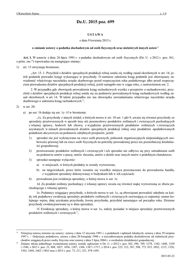 ©Kancelaria Sejmu s. 1/4 Dz.U. 2015 poz. 699 US T AW A z dnia 9 kwietnia 2015 r. o zmianie ustawy o podatku dochodowym od osób fizycznych oraz niektórych innych ustaw 1) Art. 1. W ustawie z dnia 26 lipca 1991 r. o podatku dochodowym od osób fizycznych (Dz. U. z 2012 r. poz. 361, z późn. zm. 2)) wprowadza się następujące zmiany: 1) art. 15 otrzymuje brzmienie: „Art. 15. 1. Przychód z działów specjalnych produkcji rolnej ustala się według zasad określonych w art. 14, jeżeli podatnik prowadzi księgi wykazujące te przychody. O zamiarze założenia ksiąg podatnik jest obowiązany zawiadomić właściwego naczelnika urzędu skarbowego przed rozpoczęciem roku podatkowego albo przed rozpoczęciem prowadzenia działów specjalnych produkcji rolnej, jeżeli nastąpiło ono w ciągu roku, z zastrzeżeniem ust. 2. 2. W przypadku gdy obowiązek prowadzenia ksiąg rachunkowych wynika z przepisów o rachunkowości, przychód z działów specjalnych produkcji rolnej ustala się na podstawie prowadzonych ksiąg rachunkowych według zasad określonych w art. 14. W takim przypadku nie ma obowiązku zawiadamiania właściwego naczelnika urzędu skarbowego o założeniu ksiąg rachunkowych.”; 2) w art. 20: a) po ust. 1b dodaje się ust. 1c–1f w brzmieniu: „1c. Za przychody z innych źródeł, o których mowa w art. 10 ust. 1 pkt 9, uważa się również przychody ze sprzedaży przetworzonych w sposób inny niż przemysłowy produktów roślinnych i zwierzęcych pochodzących z własnej uprawy, hodowli lub chowu, z wyjątkiem przetworzonych produktów roślinnych i zwierzęcych uzyskanych w ramach prowadzonych działów specjalnych produkcji rolnej oraz produktów opodatkowanych podatkiem akcyzowym na podstawie odrębnych przepisów, jeżeli: 1) sprzedaż nie jest wykonywana na rzecz osób prawnych, jednostek organizacyjnych nieposiadających osobowości prawnej lub na rzecz osób fizycznych na potrzeby prowadzonej przez nie pozarolniczej działalności gospodarczej; 2) przetwarzanie produktów roślinnych i zwierzęcych i ich sprzedaż nie odbywa się przy zatrudnieniu osób na podstawie umów o pracę, umów zlecenia, umów o dzieło oraz innych umów o podobnym charakterze; 3) sprzedaż następuje wyłącznie: a) w miejscach, w których produkty te zostały wytworzone, b) na targowiskach, przez które rozumie się wszelkie miejsca przeznaczone do prowadzenia handlu, z wyjątkiem sprzedaży dokonywanej w budynkach lub w ich częściach; 4) prowadzona jest ewidencja sprzedaży, o której mowa w ust. 1e. 1d. Za produkt roślinny pochodzący z własnej uprawy uważa się również mąkę wytworzoną ze zboża pochodzącego z własnej uprawy. 1e. Podatnicy osiągający przychody, o których mowa w ust. 1c, są obowiązani prowadzić odrębnie za każdy rok podatkowy ewidencję sprzedaży produktów roślinnych i zwierzęcych zawierającą co najmniej: numer kolejnego wpisu, datę uzyskania przychodu, kwotę przychodu, przychód narastająco od początku roku. Dzienne przychody ewidencjonowane są w dniu sprzedaży. 1f. Ewidencję sprzedaży, o której mowa w ust. 1e, należy posiadać w miejscu sprzedaży przetworzonych produktów roślinnych i zwierzęcych.”, 1) 2) Niniejszą ustawą zmienia się ustawy: ustawę z dnia 12 stycznia 1991 r. o podatkach i opłatach lokalnych, ustawę z dnia 29 sierpnia 1997 r. – Ordynacja podatkowa, ustawę z dnia 20 listopada 1998 r. o zryczałtowanym podatku dochodowym od niektórych przychodów osiąganych przez osoby fizyczne oraz ustawę z dnia 2 lipca 2004 r. o swobodzie działalności gospodarczej. Zmiany tekstu jednolitego wymienionej ustawy zostały ogłoszone w Dz. U. z 2012 r. poz. 362, 596, 769, 1278, 1342, 1448, 1529 i 1540, z 2013 r. poz. 21, 888, 1027, 1036, 1287, 1304, 1387 i 1717, z 2014 r. poz. 223, 312, 567, 598, 773, 915, 1052, 1215, 1328, 1563, 1644, 1662 i 1863 oraz z 2015 r. poz. 73, 211, 251, 478 i 693. 2015-05-22 ©Kancelaria Sejmu b) po ust. 2 dodaje się ust. 2a w brzmieniu: s. 2/4 „2a. Przepisu ust. 1c nie stosuje się do podatników, którzy uzyskali inne przychody ze sprzedaży zaliczane do przychodów z pozarolniczej działalności gospodarczej, o której mowa w art. 10 ust. 1 pkt 3.”; 3) w art. 43: a) ust. 1 otrzymuje brzmienie: „1. Podatnicy, którzy dochody z działów specjalnych produkcji rolnej ustalają przy zastosowaniu norm szacunkowych dochodu z określonej powierzchni upraw lub jednostki produkcji zwierzęcej, określonych w załączniku nr 2, są obowiązani składać w terminie do dnia 20 stycznia roku podatkowego urzędowi skarbowemu deklarację według ustalonego wzoru o rodzajach i rozmiarach zamierzonej produkcji w roku podatkowym.”, b) uchyla się ust. 2; 4) w art. 44 dodaje się ust. 14 w brzmieniu: „14. Do podatników prowadzących działy specjalne produkcji rolnej i ustalających dochód na podstawie prowadzonych ksiąg przepisy ust. 3, 3f–3i, 6 oraz 6b–6i stosuje się odpowiednio.”. Art. 2. W ustawie z dnia 12 stycznia 1991 r. o podatkach i opłatach lokalnych (Dz. U. z 2014 r. poz. 849 oraz z 2015 r. poz. 528) w art. 1a w ust. 2 w pkt 2 kropkę zastępuje się średnikiem i dodaje się pkt 3 w brzmieniu: „3) działalności, o której mowa w art. 3 pkt 4 ustawy z dnia 2 lipca 2004 r. o swobodzie działalności gospodarczej (Dz. U. z 2015 r. poz. 584 i 699).”. Art. 3. W ustawie z dnia 29 sierpnia 1997 r. – Ordynacja podatkowa (Dz. U. z 2015 r. poz. 613) w art. 87 § 2 otrzymuje brzmienie: „§ 2. Obowiązek wystawienia rachunku, o którym mowa w § 1, nie dotyczy rolników sprzedających produkty roślinne i zwierzęce pochodzące z własnej uprawy, hodowli lub chowu, nieprzerobione lub nieprzetworzone sposobem przemysłowym, chyba że sprzedaż jest dokonywana w ich odrębnych, stałych miejscach sprzedaży poza obrębem uprawy, hodowli lub chowu, z wyjątkiem sprzedaży na targowiskach, o których mowa w art. 20 ust. 1c pkt 3 lit. b ustawy z dnia 26 lipca 1991 r. o podatk