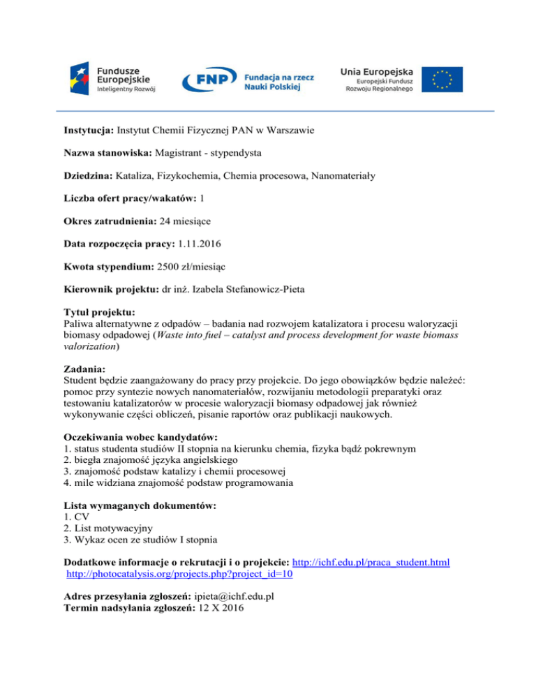 Instytucja: Instytut Chemii Fizycznej PAN w Warszawie Nazwa stanowiska: Magistrant - stypendysta Dziedzina: Kataliza, Fizykochemia, Chemia procesowa, Nanomateriały Liczba ofert pracy/wakatów: 1 Okres zatrudnienia: 24 miesiące Data rozpoczęcia pracy: 1.11.2016 Kwota stypendium: 2500 zł/miesiąc Kierownik projektu: dr inż. Izabela Stefanowicz-Pieta Tytuł projektu: Paliwa alternatywne z odpadów – badania nad rozwojem katalizatora i procesu waloryzacji biomasy odpadowej (Waste into fuel – catalyst and process development for waste biomass valorization) Zadania: Student będzie zaangażowany do pracy przy projekcie. Do jego obowiązków będzie należeć: pomoc przy syntezie nowych nanomateriałów, rozwijaniu metodologii preparatyki oraz testowaniu katalizatorów w procesie waloryzacji biomasy odpadowej jak również wykonywanie części obliczeń, pisanie raportów oraz publikacji naukowych. Oczekiwania wobec kandydatów: 1. status studenta studiów II stopnia na kierunku chemia, fizyka bądź pokrewnym 2. biegła znajomość języka angielskiego 3. znajomość podstaw katalizy i chemii procesowej 4. mile widziana znajomość podstaw programowania Lista wymaganych dokumentów: 1. CV 2. List motywacyjny 3. Wykaz ocen ze studiów I stopnia Dodatkowe informacje o rekrutacji i o projekcie: http://ichf.edu.pl/praca_student.html http://photocatalysis.org/projects.php?project_id=10 Adres przesyłania zgłoszeń: [email protected] Termin nadsyłania zgłoszeń: 12 X 2016