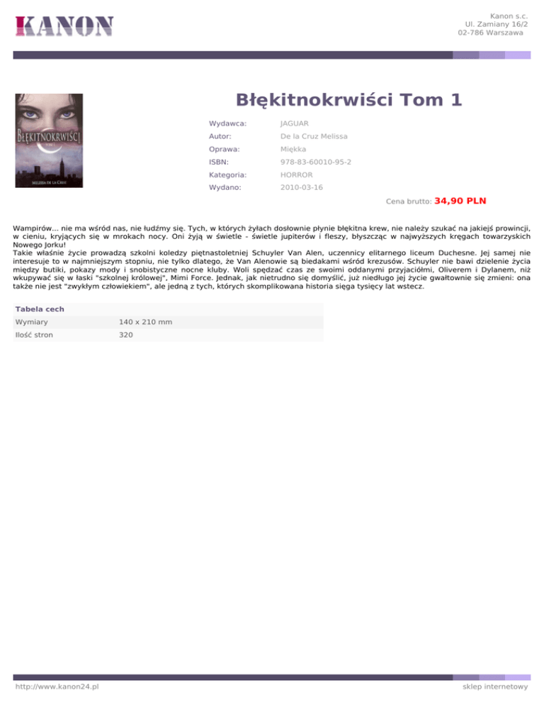 Kanon s.c. Ul. Zamiany 16/2 02-786 Warszawa Błękitnokrwiści Tom 1 Wydawca: JAGUAR Autor: De la Cruz Melissa Oprawa: Miękka ISBN: 978-83-60010-95-2 Kategoria: HORROR Wydano: 2010-03-16 Cena brutto: 34,90 PLN Wampirów... nie ma wśród nas, nie łudźmy się. Tych, w których żyłach dosłownie płynie błękitna krew, nie należy szukać na jakiejś prowincji, w cieniu, kryjących się w mrokach nocy. Oni żyją w świetle - świetle jupiterów i fleszy, błyszcząc w najwyższych kręgach towarzyskich Nowego Jorku! Takie właśnie życie prowadzą szkolni koledzy piętnastoletniej Schuyler Van Alen, uczennicy elitarnego liceum Duchesne. Jej samej nie interesuje to w najmniejszym stopniu, nie tylko dlatego, że Van Alenowie są biedakami wśród krezusów. Schuyler nie bawi dzielenie życia między butiki, pokazy mody i snobistyczne nocne kluby. Woli spędzać czas ze swoimi oddanymi przyjaciółmi, Oliverem i Dylanem, niż wkupywać się w łaski "szkolnej królowej", Mimi Force. Jednak, jak nietrudno się domyślić, już niedługo jej życie gwałtownie się zmieni: ona także nie jest "zwykłym człowiekiem", ale jedną z tych, których skomplikowana historia sięga tysięcy lat wstecz. Tabela cech Wymiary 140 x 210 mm Ilość stron 320 http://www.kanon24.pl sklep internetowy