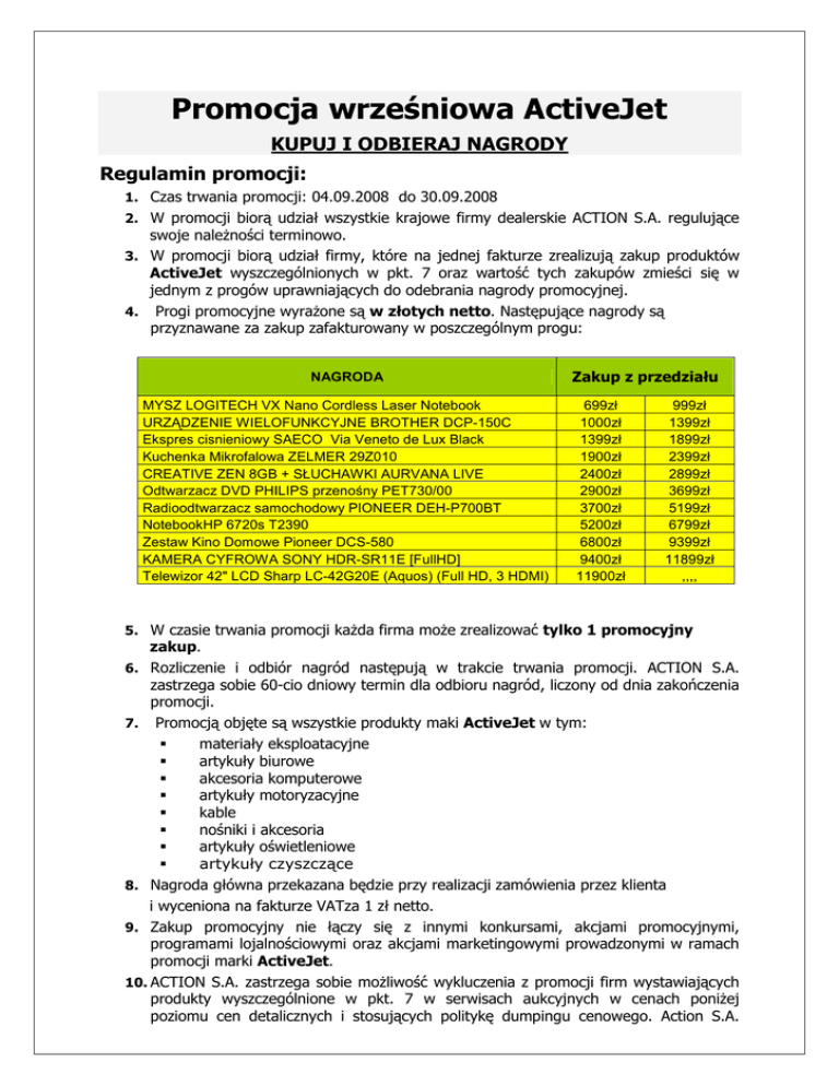 Promocja wrześniowa ActiveJet KUPUJ I ODBIERAJ NAGRODY Regulamin promocji: 1. Czas trwania promocji: 04.09.2008 do 30.09.2008 2. W promocji biorą udział wszystkie krajowe firmy dealerskie ACTION S.A. regulujące swoje naleŜności terminowo. 3. W promocji biorą udział firmy, które na jednej fakturze zrealizują zakup produktów ActiveJet wyszczególnionych w pkt. 7 oraz wartość tych zakupów zmieści się w jednym z progów uprawniających do odebrania nagrody promocyjnej. 4. Progi promocyjne wyraŜone są w złotych netto. Następujące nagrody są przyznawane za zakup zafakturowany w poszczególnym progu: NAGRODA MYSZ LOGITECH VX Nano Cordless Laser Notebook URZĄDZENIE WIELOFUNKCYJNE BROTHER DCP-150C Ekspres cisnieniowy SAECO Via Veneto de Lux Black Kuchenka Mikrofalowa ZELMER 29Z010 CREATIVE ZEN 8GB + SŁUCHAWKI AURVANA LIVE Odtwarzacz DVD PHILIPS przenośny PET730/00 Radioodtwarzacz samochodowy PIONEER DEH-P700BT NotebookHP 6720s T2390 Zestaw Kino Domowe Pioneer DCS-580 KAMERA CYFROWA SONY HDR-SR11E [FullHD] Telewizor 42" LCD Sharp LC-42G20E (Aquos) (Full HD, 3 HDMI) Zakup z przedziału 699zł 1000zł 1399zł 1900zł 2400zł 2900zł 3700zł 5200zł 6800zł 9400zł 11900zł 999zł 1399zł 1899zł 2399zł 2899zł 3699zł 5199zł 6799zł 9399zł 11899zł ,,,, 5. W czasie trwania promocji kaŜda firma moŜe zrealizować tylko 1 promocyjny zakup. 6. Rozliczenie i odbiór nagród następują w trakcie trwania promocji. ACTION S.A. zastrzega sobie 60-cio dniowy termin dla odbioru nagród, liczony od dnia zakończenia promocji. 7. Promocją objęte są wszystkie produkty maki ActiveJet w tym: materiały eksploatacyjne artykuły biurowe akcesoria komputerowe artykuły motoryzacyjne kable nośniki i akcesoria artykuły oświetleniowe artykuły czyszczące 8. Nagroda główna przekazana będzie przy realizacji zamówienia przez klienta i wyceniona na fakturze VATza 1 zł netto. 9. Zakup promocyjny nie łączy się z innymi konkursami, akcjami promocyjnymi, programami lojalnościowymi oraz akcjami marketingowymi prowadzonymi w ramach promocji marki ActiveJet. 10. ACTION S.A. zastrzega sobie moŜliwość wykluczenia z promocji firm wystawiających produkty wyszczególnione w pkt. 7 w serwisach aukcyjnych w cenach poniŜej poziomu cen detalicznych i stosujących politykę dumpingu cenowego. Action S.A. zastrzega sobie takŜe moŜliwość wykluczenia firm stosujących w/w praktyki z kolejnych promocji ActiveJet. 11. ACTION S.A. zastrzega sobie, w przypadku wyczerpania zapasów, moŜliwość zmiany nagród w trakcie trwania promocji na nagrody o wartości nie mniejszej niŜ podane w regulaminie. 12. W ramach zakupu promocyjnego produktów ActiveJet wymagane jest aby 15% wartości zakupu stanowiły produkty marki ActiveJet oznaczone kodem początkowym:: AKCACJ******* ARMACJ******* ARPACJ******* ARTACJAKN**** ARTACJBLO**** ARTACJBLZ**** ARTACJDAK**** ARTACJDES**** ARTACJDIP**** ARTACJDZI**** ARTACJETY**** ARTACJFAR**** ARTACJGUM**** ARTACJKAL**** ARTACJKAR**** ARTACJKLA**** ARTACJKLE**** ARTACJKOP**** ARTACJKOR**** ARTACJKOR**** ARTACJKOS**** ARTACJMAR**** ARTACJNAB**** ARTACJNOZ**** ARTACJOFE**** ARTACJOLO**** ARTACJPIA**** ARTACJPIN**** ARTACJPOD**** ARTACJPRK**** ARTACJPRZ**** ARTACJPTF**** ARTACJSEG**** ARTACJSKO**** ARTACJSPI**** ARTACJTAS**** ARTACJTEC**** ARTACJWIZ**** ARTACJWKO**** ARTACJZAI**** ARTACJZAK**** ARTACJZES**** ARTACJZSY**** ARTACJZSZ**** EXPACJACZ**** EXPACJWBA**** KABACJ******* MOBACJ******* MULACJ******* NOSACJ******* OSWACJ******* PERACJ******* SIEACJ******* ZASACJ******* ZASACPLIS****
