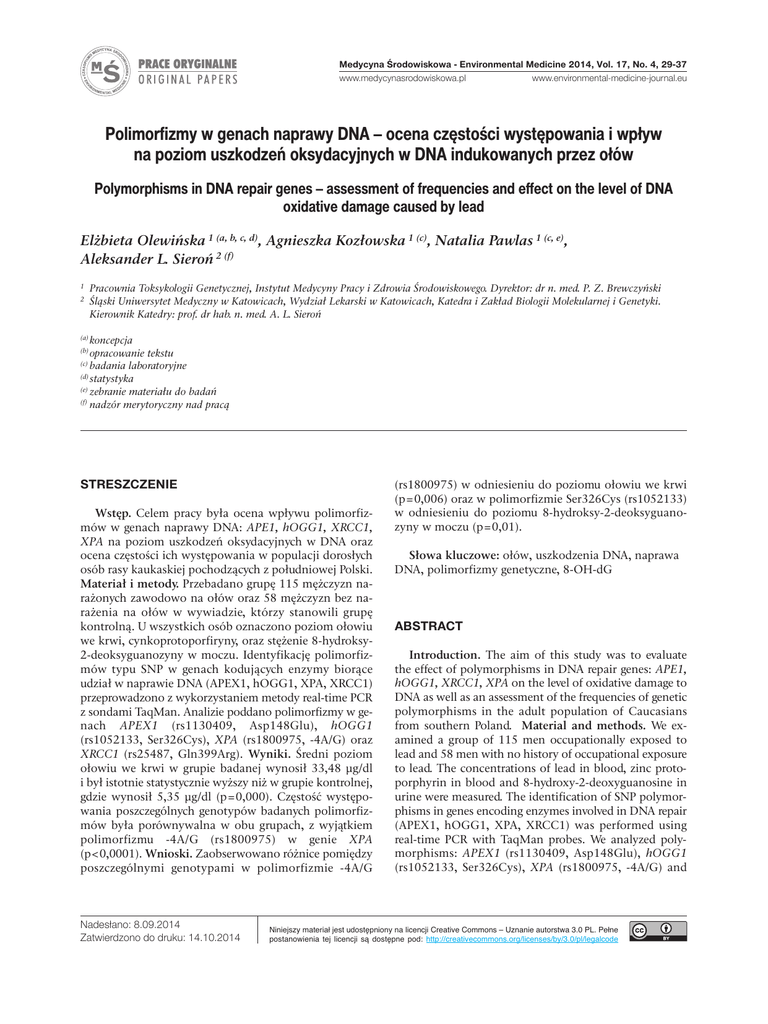 Medycyna Środowiskowa - Environmental Medicine 2014, Vol. 17, No. 4, 29-37 www.environmental-medicine-journal.eu www.medycynasrodowiskowa.pl Polimorfizmy w genach naprawy DNA – ocena częstości występowania i wpływ na poziom uszkodzeń oksydacyjnych w DNA indukowanych przez ołów Polymorphisms in DNA repair genes – assessment of frequencies and effect on the level of DNA oxidative damage caused by lead Elżbieta Olewińska 1 (a, b, c, d), Agnieszka Kozłowska 1 (c), Natalia Pawlas 1 (c, e), Aleksander L. Sieroń 2 (f) 1 2 Pracownia Toksykologii Genetycznej, Instytut Medycyny Pracy i Zdrowia Środowiskowego. Dyrektor: dr n. med. P. Z. Brewczyński Śląski Uniwersytet Medyczny w Katowicach, Wydział Lekarski w Katowicach, Katedra i Zakład Biologii Molekularnej i Genetyki. Kierownik Katedry: prof. dr hab. n. med. A. L. Sieroń koncepcja opracowanie tekstu (c) badania laboratoryjne (d) statystyka (e) zebranie materiału do badań (f) nadzór merytoryczny nad pracą (a) (b) STRESZCZENIE Wstęp. Celem pracy była ocena wpływu polimorfizmów w genach naprawy DNA: APE1, hOGG1, XRCC1, XPA na poziom uszkodzeń oksydacyjnych w DNA oraz ocena częstości ich występowania w populacji dorosłych osób rasy kaukaskiej pochodzących z południowej Polski. Materiał i metody. Przebadano grupę 115 mężczyzn narażonych zawodowo na ołów oraz 58 mężczyzn bez narażenia na ołów w wywiadzie, którzy stanowili grupę kontrolną. U wszystkich osób oznaczono poziom ołowiu we krwi, cynkoprotoporfiryny, oraz stężenie 8-hydroksy2-deoksyguanozyny w moczu. Identyfikację polimorfizmów typu SNP w genach kodujących enzymy biorące udział w naprawie DNA (APEX1, hOGG1, XPA, XRCC1) przeprowadzono z wykorzystaniem metody real-time PCR z sondami TaqMan. Analizie poddano polimorfizmy w genach APEX1 (rs1130409, Asp148Glu), hOGG1 (rs1052133, Ser326Cys), XPA (rs1800975, -4A/G) oraz XRCC1 (rs25487, Gln399Arg). Wyniki. Średni poziom ołowiu we krwi w grupie badanej wynosił 33,48 µg/dl i był istotnie statystycznie wyższy niż w grupie kontrolnej, gdzie wynosił 5,35 µg/dl (p =0,000). Częstość występowania poszczególnych genotypów badanych polimorfizmów była porównywalna w obu grupach, z wyjątkiem polimorfizmu -4A/G (rs1800975) w genie XPA (p<0,0001). Wnioski. Zaobserwowano różnice pomiędzy poszczególnymi genotypami w polimorfizmie -4A/G Nadesłano: 8.09.2014 Zatwierdzono do druku: 14.10.2014 (rs1800975) w odniesieniu do poziomu ołowiu we krwi (p =0,006) oraz w polimorfizmie Ser326Cys (rs1052133) w odniesieniu do poziomu 8-hydroksy-2-deoksyguanozyny w moczu (p =0,01). Słowa kluczowe: ołów, uszkodzenia DNA, naprawa DNA, polimorfizmy genetyczne, 8-OH-dG ABSTRACT Introduction. The aim of this study was to evaluate the effect of polymorphisms in DNA repair genes: APE1, hOGG1, XRCC1, XPA on the level of oxidative damage to DNA as well as an assessment of the frequencies of genetic polymorphisms in the adult population of Caucasians from southern Poland. Material and methods. We examined a group of 115 men occupationally exposed to lead and 58 men with no history of occupational exposure to lead. The concentrations of lead in blood, zinc protoporphyrin in blood and 8-hydroxy-2-deoxyguanosine in urine were measured. The identification of SNP polymorphisms in genes encoding enzymes involved in DNA repair (APEX1, hOGG1, XPA, XRCC1) was performed using real-time PCR with TaqMan probes. We analyzed polymorphisms: APEX1 (rs1130409, Asp148Glu), hOGG1 (rs1052133, Ser326Cys), XPA (rs1800975, -4A/G) and Niniejszy materiał jest udostępniony na licencji Creative Commons – Uznanie autorstwa 3.0 PL. Pełne postanowienia tej licencji są dostępne pod: http://creativecommons.org/licenses/by/3.0/pl/legalcode 30 Medycyna Środowiskowa - Environmental Medicine 2014, Vol. 17, No. 4 Elżbieta Olewińska i wsp.: Polimorfizmy w genach naprawy DNA XRCC1 (rs25487, Gln399Arg). Results. The mean blood lead level in the exposed group was 33,48 µg/dl and was significantly higher compared to 5.35 µg/dl (p=0.000). in the control group. The frequencies of studied polymorphisms were comparable in both groups, with the exception of -4A/G (rs1800975) in the gene XPA (p<0.0001). Conclusions. Differences were observed between geno- WSTĘP Informacja genetyczna zawarta w komórce w postaci DNA narażona jest na ciągłe uszkodzenia, ze względu na wszechobecność czynników mutagennych w środowisku życia i pracy człowieka. Zachowanie integralności materiału genetycznego jest istotne, gdyż powstałe modyfikacje mogą być źródłem mutacji, które w konsekwencji mogą prowadzić do licznych chorób. Jednym z czynników zaburzających integralność genomu i prawdopodobnie kancerogennych dla człowieka (grupa 2A wg IARC) jest ołów i jego związki nieorganiczne, występujące zarówno w środowisku, jak również na stanowisku pracy [1]. Ołów posiada zdolność do wiązania się z grupami hydroksylowymi białek, co wpływa na funkcjonowanie wielu enzymów, takich jak dehydrataza kwasu delta-aminolewulinowego (ALAD) czy ferrochelataza, które biorą udział w szlaku biosyntezy hemu. Ołów hamuje aktywność ALAD, czego efektem jest akumulacja kwasu delta-aminolewulinowego (ALA) w krwi oraz w moczu. W związku z tym poziom ALA w moczu, może być wykorzystywany, jako biomarker ekspozycji bądź marker wczesnych skutków biologicznych. Funkcja ferrochelatazy polega na wbudowaniu żelaza do cząsteczki protoporfiryny podczas syntezy hemu. Brak aktywności tego enzymu prowadzi do włączania do protoporfiryny cynku i tworzenia się cynkoprotoporfiryny (ZPP), która wykorzystywana jest jako marker ekspozycji na ołów [2–4]. Pod wpływem ołowiu w komórkach generowane są również m.in. reaktywne formy tlenu, które prowadzą do uszkodzeń materiału genetycznego, w postaci: pęknięć jednej lub obu nici DNA, powstawania wiązań krzyżowych DNA-DNA lub DNA-białko czy transwersji zasad azotowych (głównie 