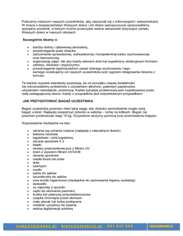 Polecamy rodzicom naszych uczestników, aby zapoznali się z informacjami i wskazówkami. W trosce o bezpieczeństwo Waszych dzieci i ich dobre samopoczucie opracowaliśmy specjalny poradnik, w którym można przeczytać ważne wskazówki dotyczące udziału Waszych dzieci w naszych obozach. Szczególnie dbamy o: bardzo dobrą i zabawową atmosferę, przestrzeganie praw dziecka, zatrudnianie sprawdzonej, wykształconej i kompetentnej kadry wychowawczej oraz kierowniczej, organizację zajęć, tak aby każdy element dnia był wypełniony atrakcyjnymi formami zabawy, edukacji i wypoczynku przestrzeganie ogólnoludzkich zasad dobrego wychowania i tego samego oczekujemy od naszych uczestników pod rygorem relegowania dziecka z turnusu Te bardzo wysokie standardy powodują, że od początku naszej działalności nie odnotowaliśmy problemów z używaniem alkoholu, paleniem papierosów, używaniem narkotyków, przemocą. Każda sytuacja problemowa jest rozpatrywana przez radę pedagogiczną obozu, każdy z przypadków jest indywidulanym przypadkiem. JAK PRZYGOTOWAĆ BAGAŻ UCZESTNIKA Bagaż uczestnika powinien mieć taką wagę, aby dziecko samodzielnie mogło swój bagaż unieść. Najlepiej zaopatrzyć dziecko w walizkę – torbę na kółkach. Bagaż nie powinien przekraczać wagi 15 kg. Oczywiście służymy pomocą przy przeniesieniu bagażu. Wyposażenie niezbędne na lato: ubrania wg uznania rodzica (najlepiej z naturalnych tkanin) bielizna osobista kąpielówki / strój kąpielowy obuwie sportowe X 2 klapki okulary przeciwsłoneczne z filtrem UV krem z wysokim filtrem UV/UVB ubranie sportowe ciepła bluza lub polar dres szampon mydło pasta do zębów szczoteczka do zębów inne środki higieniczne (niezbędne do zachowania higieny osobistej) skarpetki co najmniej 2 ręczniki cążki do obcinania paznokci kurtka lub peleryna przeciwdeszczowa czapka chroniąca przed słońcem mały plecak lub torba podręczna notatnik i przybory do pisania ważną legitymacje szkolną [email protected] , [email protected] , 501 612 602 www.lejkowka.pl PIENIĄDZE UCZESTNIKÓW W pierwszym dniu programu uczestnik może zdeponować swoje kieszonkowe u wychowawcy. Organizator nie ponosi odpowiedzialności za pieniądze uczestnika, które nie zostały zdeponowane. Zalecamy, aby dać dzieciom pieniądze na drobne wydatki w kwocie do 200zł [email protected] , [email protected] , 501 612 602 www.lejkowka.pl
