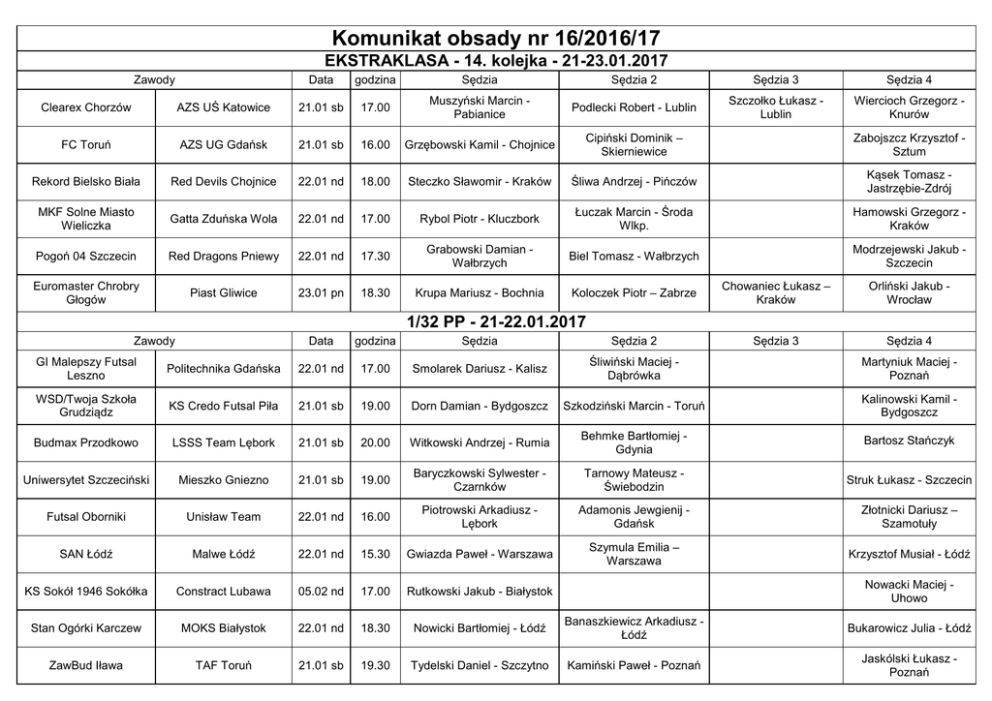 Komunikat obsady nr 16/2016/17 EKSTRAKLASA - 14. kolejka - 21-23.01.2017 Zawody Data godzina Sędzia Sędzia 2 Sędzia 3 Sędzia 4 Szczołko Łukasz Lublin Wiercioch Grzegorz Knurów Clearex Chorzów AZS UŚ Katowice 21.01 sb 17.00 Muszyński Marcin Pabianice Podlecki Robert - Lublin FC Toruń AZS UG Gdańsk 21.01 sb 16.00 Grzębowski Kamil - Chojnice Cipiński Dominik – Skierniewice Zabojszcz Krzysztof Sztum Rekord Bielsko Biała Red Devils Chojnice 22.01 nd 18.00 Steczko Sławomir - Kraków Śliwa Andrzej - Pińczów Kąsek Tomasz Jastrzębie-Zdrój MKF Solne Miasto Wieliczka Gatta Zduńska Wola 22.01 nd 17.00 Rybol Piotr - Kluczbork Łuczak Marcin - Środa Wlkp. Hamowski Grzegorz Kraków Pogoń 04 Szczecin Red Dragons Pniewy 22.01 nd 17.30 Grabowski Damian Wałbrzych Biel Tomasz - Wałbrzych Modrzejewski Jakub Szczecin Euromaster Chrobry Głogów Piast Gliwice 23.01 pn 18.30 Krupa Mariusz - Bochnia Koloczek Piotr – Zabrze Chowaniec Łukasz – Kraków Orliński Jakub Wrocław Sędzia 3 Sędzia 4 1/32 PP - 21-22.01.2017 Zawody Data godzina Sędzia Sędzia 2 GI Malepszy Futsal Leszno Politechnika Gdańska 22.01 nd 17.00 Smolarek Dariusz - Kalisz Śliwiński Maciej Dąbrówka Martyniuk Maciej Poznań WSD/Twoja Szkoła Grudziądz KS Credo Futsal Piła 21.01 sb 19.00 Dorn Damian - Bydgoszcz Szkodziński Marcin - Toruń Kalinowski Kamil Bydgoszcz Budmax Przodkowo LSSS Team Lębork 21.01 sb 20.00 Witkowski Andrzej - Rumia Behmke Bartłomiej Gdynia Bartosz Stańczyk Uniwersytet Szczeciński Mieszko Gniezno 21.01 sb 19.00 Baryczkowski Sylwester Czarnków Tarnowy Mateusz Świebodzin Struk Łukasz - Szczecin Futsal Oborniki Unisław Team 22.01 nd 16.00 Piotrowski Arkadiusz Lębork Adamonis Jewgienij Gdańsk Złotnicki Dariusz – Szamotuły SAN Łódź Malwe Łódź 22.01 nd 15.30 Gwiazda Paweł - Warszawa Szymula Emilia – Warszawa Krzysztof Musiał - Łódź KS Sokół 1946 Sokółka Constract Lubawa 05.02 nd 17.00 Rutkowski Jakub - Białystok Stan Ogórki Karczew MOKS Białystok 22.01 nd 18.30 Nowicki Bartłomiej - Łódź Banaszkiewicz Arkadiusz Łódź Bukarowicz Julia - Łódź ZawBud Iława TAF Toruń 21.01 sb 19.30 Tydelski Daniel - Szczytno Kamiński Paweł - Poznań Jaskólski Łukasz Poznań Nowacki Maciej Uhowo Helios Białystok AZS UW Warszawa 27.01 pt 19.00 Chrzanowski Paweł Białystok Barteczka Jacek - Białystok Czudzinowicz Monika Białystok Wiking Opole Gwiazda Ruda Śląska 21.01 sb 20.00 Bąk Henryk - Zabrze Stoń Marcin - Tychy Wanicki Tomasz Knurów Stara Nova Gliwice Orzeł Futsal JelczLaskowice 21.01 sb 18.00 Jaruchiewicz Damian Knurów Mnich Izabela - Tarnowskie Góry Białek Roman - Gliwice AZS Zielona Góra KS FT Brzeg 22.01 nd 18.00 Nowicki Tomasz - Szamotuły Zięba Dawid - Szczecin Tkacz Przemysław Zielona Góra Góral Tryńcza AZS UMCS Lublin 21.01 sb 18.00 Wałęga Paweł - Dębica Bałut Paweł - Czarna Potępa Michał Kolbuszowa Elmar Jędrzejów (Nowiny) Heiro Rzeszów 21.01 sb 18.00 Hamowski Grzegorz Kraków Szymczyk Łukasz - Kraków Sprzęczka Marcin Ostrowiec Św. GKS Futsal Tychy UKS Futsal Nowiny 22.01 nd 16.00 Wiercioch Grzegorz Knurów Wanicki Tomasz - Knurów Mnich Izabela Tarnowskie Góry EKSTRALIGA Kobiet - 8. kolejka - 21-22.01.2017 Zawody Data godzina Sędzia Sędzia 2 Sędzia 3 Sędzia 4 Łuczak Marcin - Środa Wlkp. AZS UAM Poznań Kotwica Kórnik 21.01 sb 18.00 Tkacz Przemysław - Zielona Martyniuk Maciej - Poznań Góra Unifreeze Górzno AZS UG Gdańsk 22.01 nd 18.00 Gryckiewicz Patryk - Toruń Kępka Patryk - Olsztyn Kapela Krzysztof Orneta AZS AWF Warszawa AZS UW Warszawa 22.01 nd 18.00 Chrzanowski Paweł Białystok Czudzinowicz Monika Białystok Mital Artur - Mława Słomniczanka Lex Słomniki ROW Rybnik 21.01 sb 18.00 Olszak Tomasz - Miąsowa Krupa Mariusz - Bochnia Kubik Tomasz - Bochnia AZS UJ Kraków KU AZS UŚ Katowice 21.01 sb 18.00 Ciechanowicz Marcin Kraków Ziach Rafał - Kraków Chowaniec Łukasz – Kraków Rolnik Biedrzychowice ISD AJD Częstochowa 21.01 sb 19.00 Rybol Piotr - Kluczbork Orliński Jakub - Wrocław Podmostka Marcin Opole I LIGA Kobiet - 6 kolejka - 21-22.01.2017 Zawody Data godzina Sędzia Sędzia 2 Sędzia 3 Sędzia 4 Żyrardowianka Mazovia Grodzisk Maz. 22.01 nd 18.00 Cipiński Dominik – Skierniewice Sęczek Marcin Trębaczew Michniewicz Szymon Łódź Gwiazda Toruń Helios Białystok 21.01 sb 15.30 Piotrowski Arkadiusz Lębork Tydelski Daniel - Szczytno Kamiński Paweł Poznań GTS Bojszowy Gwiazda Prószków 22.01 nd 13.00 Szymczyk Łukasz - Kraków Ziach Rafał - Kraków Kąsek Tomasz Jastrzębie-Zdrój Bronowianka Kraków GTW Gliwice 21.01 sb 18.00 Curyło Wojciech - Kraków Steczko Sławomir - Kraków Młodzieżowe Mistrzostwa Polski - 14-15.01.2017 Zawody Data godzina Sędzia Sędzia 2 Sędzia 3 U-18 Toruń (6 meczów) 21.01 sb 8.30 Kamiński Paweł - Poznań Jaskólski Łukasz - Poznań Tydelski Daniel Szczytno U-16 Łęczyca (6 meczów) 22.01 nd 10.00 Dębowski Seweryn Koluszki Sęczek Marcin Trębaczew Banaszkiewicz Arkadiusz - Łódź U-16 Toruń (Lubicz) (6 meczów) 21.01 sb 8.00 Dorn Damian - Bydgoszcz Kalinowski Kamil Bydgoszcz Szkodziński Marcin Toruń Półfinał AMP Łódź 20-22.01 Szymula Emilia – Warszawa Mital Artur - Mława AMWiM Kobiet 20-21.01 9-21.30 Gwiazda Paweł - Warszawa Sędzia 4