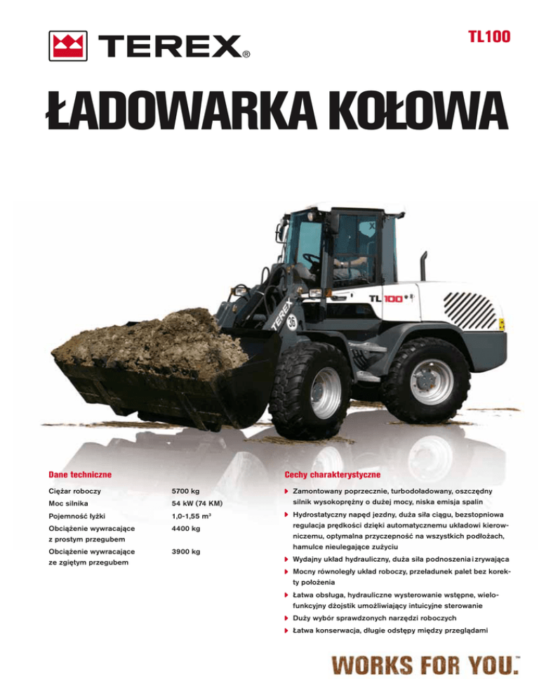 TL100 ŁADOWARKA KOŁOWA Dane techniczne Cechy charakterystyczne Ciężar roboczy 5700 kg Zamontowany poprzecznie, turbodoładowany, oszczędny Moc silnika 54 kW (74 KM) silnik wysokoprężny o dużej mocy, niska emisja spalin Pojemność łyżki 1,0-1,55 m Hydrostatyczny napęd jezdny, duża siła ciągu, bezstopniowa Obciążenie wywracające 4400 kg regulacja prędkości dzięki automatycznemu układowi kierow- 3 niczemu, optymalna przyczepność na wszystkich podłożach, z prostym przegubem Obciążenie wywracające ze zgiętym przegubem 3900 kg hamulce nieulegające zużyciu Wydajny układ hydrauliczny, duża siła podnoszenia i zrywająca Mocny równoległy układ roboczy, przeładunek palet bez korekty położenia Łatwa obsługa, hydrauliczne wysterowanie wstępne, wielofunkcyjny dżojstik umożliwiający intuicyjne sterowanie Duży wybór sprawdzonych narzędzi roboczych Łatwa konserwacja, długie odstępy między przeglądami OPIS TECHNICZNY SILNIK Producent, model Typ Cykl pracy Pojemność skokowa Moc zgodnie z ISO 9249 przy 2200 min-1 Układ chłodzenia Deutz, TD 2011 L04 W 4-cylindrowy turbodoładowany silnik wysokoprężny, EU stopień III A, EPA Interim Tier 4 4-suwowy z wtryskiem bezpośrednim 3620 cm3 54 kW (74 KM) Woda INSTALACJA ELEKTRYCZNA Napięcie robocze Instalacja oświetleniowa zgodna z przepisami ruchu drogowego i normą europejską. 12 V UKŁAD HYDRAULICZNY UKŁAD PRZENIESIENIA NAPĘDU Hydrostatyczny napęd jazdy w zamkniętym obiegu, niezależny od hydrauliki ładowarki. Zaawansowana automatyka jazdy, samoczynna optymalizacja siły pociągowej i prędkości. Regulacja silnika hydraulicznego w funkcji obciążenia umożliwia wybór jednego z dwóch zakresów prędkości. Płynna regulacja prędkości do przodu i do tyłu. Napęd na wszystkie koła przekazywany z przekładni redukcyjnej na tylnej osi przez wał przegubowy na przednią oś. Pedał hamulca z funkcją pełzania. 2 zakresy jazdy: „Zakres prędkości I“ 0-6 km/h „Zakres prędkości II“ 0-20 km/h 4 zakresy jazdy (opcjonalnie wersja szybkiej jazdy): „Zakres prędkości I“ 0-6 / 0-18 km/h „Zakres prędkości II“ 0-12 / 0-36 km/h Siła ciągu 4388 daN OSIE Oś przednia: Oś z planetarną przekładnią kierowniczą, ze zintegrowanym centralnym hamulcem tarczowym, sztywne mocowanie. Samoblokujący mechanizm różnicowy 45%. Oś tylna: Oś napędu planetarnego ze zintegrowaną przekładnią redukcyjną, zawieszenie wahliwe, amortyzowana poduszkami gumowym. Samoblokujący mechanizm różnicowy 45%. Kąt wychylenia ±12° OPONY Rozmiar standardowy 405/70 R 20 SPT 9 Dunlop HAMULCE Hamulec roboczy: Hamulec dodatkowy: Hamulec postojowy: Hydrauliczny centralny hamulec tarczowy, działający poprzez napęd na wszystkie cztery koła. Hydrostatyczny przez zamknięty obieg napędu jezdnego. Mechaniczny centralny hamulec tarczowy przedniej osi. UKŁAD KIEROWNICZY Sterowanie przegubowe, 2 siłowniki kierujące z obustronną amortyzacją w położeniach krańcowych, całkowicie hydrauliczne przez zawór priorytetowy Load-Sensing, szybkie i łatwe kierowanie również przy prędkości obrotowej silnika na biegu jałowym. Całkowity kąt skrętu 80° POJEMNOŚCI NAPEŁNIENIA Pojemność zbiornika paliwa Układ hydrauliczny (włącznie ze zbiornikiem) 110 l 88 l PARAMETRY EKSPLOATACYJNE, WYPOSAŻENIE STANDARDOWE Ciężar roboczy (ISO 6016) Obciążenie wywracające z prostym przegubem (ISO 14397-1) Obciążenie wywracające ze zgiętym przegubem (ISO 14397-1) Długość całkowita, łyżka na podłożu Szerokość całkowita Promień skrętu na zewnętrznej krawędzi łyżki standardowej Rozstaw osi Wysokość z kabiną 5700 kg 4400 kg 3900 kg 5270 mm 1950 mm 4445 mm 2220 mm 2765 mm Wydajność pompy 76 l/min Ciśnienie robocze 250 bar Urządzenie sterujące: Proporcjonalny zawór hydrauliczny z 3 obiegami sterującymi i przełącznikiem biegu szybkiego dla przechylania. Wszystkie ruchy są sterowalne równocześnie i niezależnie. Dźwignia sterująca (dźwignia wielofunkcyjna) dla siłownika podnoszącego i przechylającego ze zintegrowanym przełącznikiem dodatkowego obwodu sterującego i przełącznikiem kierunku jazdy. Pozycja pływająca w obwodzie sterującym „opuszczanie", sterowana elektro-hydraulicznie. Dodatkowy obwód sterujący łącznie ze złączami wtykowymi i funkcją pracy ciągłej w wyposażeniu seryjnym. UKŁAD ZAŁADOWCZY Układ załadowczy z kinematyką równoległą i zintegrowanym mechanicznym (opcjonalnie hydraulicznym) szybkozłączem. Łyżka załadowcza (ISO 7546) 1,00 m3 Siła podnoszenia przy gruncie (ISO 14397-2) 61 000 N Siła skrawania (ISO 14397-2) 55 000 N PODNOŚNIK WIDŁOWY Udźwig (łączny zakres podnoszenia i skrętu) 2400 (2600*) kg Udźwig (pozycja transportowa), ok. 300 mm nad podłożem, całkowity zakres 3200* kg skrętu Szerokość wspornika wideł 1240 mm Długość zębów wideł (100x45 mm) 1100 mm Współczynnik stateczności 1,25 Wyznaczanie udźwigu użytecznego na równym podłożu = 80% obciążenia przewracającego pod kątem KABINA Elastycznie osadzona stalowa kabina z pełną widocznością, świadectwo ROPS (EN ISO 3471 ROPS) i FOPS** (EN ISO 3449 FOPS). Kabina operatora wyposażona w dwoje drzwi, elektryczne wycieraczki z przełącznikiem interwałowym i spryskiwaczami z przodu i z tyłu, barwione panoramiczne przeszklenie ze szkła bezpiecznego, odsuwaną szybę z lewej strony. Fotel operatora z hydrauliczną amortyzacją, regulacją wagi i biodrowym pasem bezpieczeństwa zgodnie z ISO 7096 i ISO 6683. Ogrzewanie kabiny z 3-stopniową dmuchawą (przełączaną ze świeżego powietrza na tryb cyrkulacji powietrza) i odmrażaniem szyby przedniej i tylnej. Przygotowana do montażu klimatyzacji i radia. Regulacja nachylenia i wysokości kierownicy. 2 reflektory robocze przednie. Poziom mocy akustycznej odpowiada dyrektywom WE. *Z balastem tylnej osi **FOPS tylko z ochronną siatką dachową (opcja) TL100 WYMIARY: ŁYŻKA ZAŁADOWCZA 80° 1850 4 