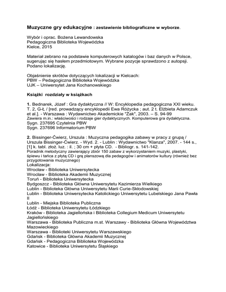 Muzyczne gry edukacyjne : zestawienie bibliograficzne w wyborze. Wybór i oprac. Bożena Lewandowska Pedagogiczna Biblioteka Wojewódzka Kielce, 2015 Materiał zebrano na podstawie komputerowych katalogów i baz danych w Polsce, sugerując się hasłem przedmiotowym. Wybrane pozycje sprawdzono z autopsji. Podano lokalizację. Objaśnienie skrótów dotyczących lokalizacji w Kielcach: PBW – Pedagogiczna Biblioteka Wojewódzka UJK – Uniwersytet Jana Kochanowskiego Książki rozdziały w książkach 1. Bednarek, Józef : Gra dydaktyczna // W: Encyklopedia pedagogiczna XXI wieku. T. 2, G-Ł / [red. prowadzący encyklopedii Ewa Różycka ; aut. 2 t. Elżbieta Adamczuk et al.]. - Warszawa : Wydawnictwo Akademickie "Żak", 2003. – S. 94-99 Zawiera m.in.: właściwości i rodzaje gier dydaktycznych. Komputerowa gra dydaktyczna. Sygn. 237695 Czytelnia PBW Sygn. 237696 Informatorium PBW 2. Bissinger-Ćwierz, Urszula : Muzyczna pedagogika zabawy w pracy z grupą / Urszula Bissinger-Ćwierz. - Wyd. 2. - Lublin : Wydawnictwo "Klanza", 2007. - 144 s., [1] k. tabl. złoż. luz. : il. ; 30 cm + płyta CD. - Bibliogr. s. 141-142. Poradnik metodyczny zawierający zbiór 150 zabaw z wykorzystaniem muzyki, plastyki, śpiewu i tańca z płytą CD i grą planszową dla pedagogów i animatorów kultury (również bez przygotowania muzycznego) Lokalizacja: Wrocław - Biblioteka Uniwersytecka Wrocław - Biblioteka Akademii Muzycznej Toruń - Biblioteka Uniwersytecka Bydgoszcz - Biblioteka Główna Uniwersytetu Kazimierza Wielkiego Lublin - Biblioteka Główna Uniwersytetu Marii Curie-Skłodowskiej Lublin - Biblioteka Uniwersytecka Katolickiego Uniwersytetu Lubelskiego Jana Pawła II Lublin - Miejska Biblioteka Publiczna Łódź - Biblioteka Uniwersytetu Łódzkiego Kraków - Biblioteka Jagiellońska i Biblioteka Collegium Medicum Uniwersytetu Jagiellońskiego Warszawa - Biblioteka Publiczna m.st. Warszawy - Biblioteka Główna Województwa Mazowieckiego Warszawa - Biblioteki Uniwersytetu Warszawskiego Gdańsk - Biblioteka Główna Akademii Muzycznej Gdańsk - Pedagogiczna Biblioteka Wojewódzka Katowice - Biblioteka Uniwersytetu Śląskiego 3. Bogdanowicz, Zofia : Zabawy dydaktyczne dla przedszkoli / Zofia Bogdanowicz. Wyd. 4 popr. - Warszawa : Wydawnictwa Szkolne i Pedagogiczne, 1990. - 192 s. : 1 portr., rys. ; 20 cm. Sygn. 207622 Czytelnia PBW Sygn. 207623, 207624, 217984 Wypożyczalnia PBW 4. Cossu, Menotti : Gry z wyobraźnią / Menotti Cossu ; [tł. z fr. Iwona Badowska]. Bielsko-Biała : "Park", 1993. - 126 s. : rys., wykr. ; 24 cm. Sygn. 214203 Czytelnia PBW Sygn. 214204 Wypożyczalnia PBW 5. Czelakowska, Danuta : Metodyka edukacji polonistycznej dzieci w wieku wczesnoszkolnym / Danuta Czelakowska. - Wyd. 4. - Kraków : Oficyna Wydawnicza "Impuls", 2009. - 329 s. : il. ; 24 cm. Spis treści: 1. Cele polonistycznej edukacji wczesnoszkolnej. 2. Metody nauki czytania i pisania w ujęciu porównawczym. 3. Proces nauki czytania. 4. Proces pisania. 5. Rozwój i kształcenie języka dzieci w wieku wczesnoszkolnym. 6. Praca z tekstem literackim. 7. Nauczanie gramatyki w edukacji wczesnoszkolnej. 8. Nauczanie ortografii i interpunkcji. 9. Rozwijanie twórczej aktywności uczniów. 10. Gry i zabawy dydaktyczne w polonistycznej edukacji dzieci. 11. Dramatyzacje w nauczaniu wczesnoszkolnym języka polskiego. Sygn. 246291 Czytelnia PBW Sygn. 246292 Wypożyczalnia PBW 6. Domań, Robert : Metody pedagogiki zabawy w pracy z dziećmi w wieku przedszkolnym / Robert Domań. - Lublin : Wydawnictwo Przedszkolak, 2003. - 71, [1] s., [8] s. tabl. kolor. : il. ; 21 cm + dysk optyczny (CD). Zawiera: Pedagogika zabawy w pracy z dziećmi w wieku przedszkolnym. Rodzaje i indeks metod (metody wstępne, metody aktywizujące, metody integracyjne, metody twórczego opracowania tematu, metody informacji zwrotnej, metody plastyczne). Opis metod i [osnowy zajęć]. Zabawy przy muzyce i pląsy (zabawa "Czarowanie", "Ćwiczenia palców", "O Benoje", "Pingwin", "Podajmy sobie rączki", "Słoneczko jest". Podróż dookoła świata - scenariusz z wykorzystaniem metod pedagogiki zabawy. Sygn. 244756 Czytelnia PBW 7. Gawrecki, Lechosław : Gry dydaktyczne w nauczaniu początkowym / Lechosław Gawrecki ; Instytut Kształcenia Nauczycieli im. Wł. Spasowskiego. Oddział Doskonalenia Nauczycieli w Kaliszu. - Kalisz : Instytut Kształcenia Nauczycieli ODN, 1987. - 103 s. ; 21 cm. - Bibliogr. s. 102-103. Sygn. 192544 Wypożyczalnia PBW 8. Goźlińska, Elżbieta : Jak skonstruować grę dydaktyczną / Elżbieta Goźlińska. Warszawa : Wydawnictwa Szkolne i Pedagogiczne, cop. 2004. - 40 s. ; 21 cm Czytelnia Pedagogiczna UJK 9. Klik uczy śpiewać : [multimedialne zabawy muzyczne dla dzieci w wieku 6-10 lat / red. Dorota Miszczuk. - Warszawa : Wydawnictwa Szkolne i Pedagogiczne, cop. 2002. - 1 dysk optyczny (CD-ROM) : dźw., kolor ;12 cm + Licencja. Sygn. CD 131 Audiowizualny PBW 10. Kowalski, Marcin : Między nami graczami : gry dydaktyczne na motywach lektur szkolnych : Wstąp do Stowarzyszenia / Marcin Kowalski ; [rys. Grażyna Rigall]. - Gdańsk : Gdańskie Wydaw. Oświatowe, 2013. - [39] s. : il. ; 29 cm. UW1: Na okł.: Stowarzyszenie umarłych poetów, reżyseria Peter Weir : gimnazjum. Zawiera grę planszową: Wstąp do Stowarzyszenia opartą na motywach filmu "Stowarzyszenie umarłych poetów". Sygn. 252691 Czytelnia PBW 11. Kruszewski, Krzysztof : Gry dydaktyczne // W: Encyklopedia pedagogiczna / pod red. Wojciecha Pomykało. - Warszawa : Fundacja "Innowacja", 1993. – S. 223225 Dokument dostępny także w wersji elektronicznej w Repozytorium PBW Sygn. 213699 Czytelnia PBW Sygn. 213700 Bibliografia PBW 12. Kruszewski, Krzysztof : Gry dydaktyczne // W: Sztuka nauczania : podręcznik dla studentów kierunków nauczycielskich. T. 1, Czynności nauczyciela / pod red. Krzysztofa Kruszewskiego. - Warszawa : Wydaw. Naukowe PWN, 1991. – S 165-181 Sygn. 209547, 209549, 209551, 209553 Wypożyczalnia PBW 13. Podhájecká, Mária : Gra edukacyjna