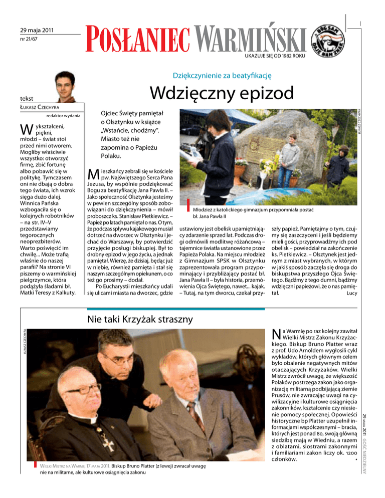 I 29 maja 2011 nr 21/67 UKAZUJE SIĘ OD 1982 ROKU Dziękczynienie za beatyfikację Ojciec Święty pamiętał o Olsztynku w książce „Wstańcie, chodźmy”. Miasto też nie zapomina o Papieżu Polaku. redaktor wydania W ykształceni, piękni, młodzi – świat stoi przed nimi otworem. Mogliby właściwie wszystko: otworzyć firmę, zbić fortunę albo pobawić się w politykę. Tymczasem oni nie dbają o dobra tego świata, ich wzrok sięga dużo dalej. Winnica Pańska wzbogaciła się o kolejnych robotników – na str. IV–V przedstawiamy tegorocznych neoprezbiterów. Warto poświęcić im chwilę... Może trafią właśnie do naszej parafii? Na stronie VI piszemy o warmińskiej pielgrzymce, która podążyła śladami bł. Matki Teresy z Kalkuty. Łukasz Czechyra Wdzięczny epizod tekst Łukasz Czechyra M ieszkańcy zebrali się w kościele pw. Najświętszego Serca Pana Jezusa, by wspólnie podziękować Bogu za beatyfikację Jana Pawła II. – Jako społeczność Olsztynka jesteśmy w pewien szczególny sposób zobowiązani do dziękczynienia – mówił proboszcz ks. Stanisław Pietkiewicz. – Papież po latach pamiętał o nas. O tym, że podczas spływu kajakowego musiał dotrzeć na dworzec w Olsztynku i jechać do Warszawy, by potwierdzić przyjęcie posługi biskupiej. Był to drobny epizod w jego życiu, a jednak pamiętał. Wierzę, że dzisiaj, będąc już w niebie, również pamięta i stał się naszym szczególnym opiekunem, o co też go prosimy – dodał. Po Eucharystii mieszkańcy udali się ulicami miasta na dworzec, gdzie Młodzież z katolickiego gimnazjum przypomniała postać bł. Jana Pawła II ustawiony jest obelisk upamiętniający zdarzenie sprzed lat. Podczas drogi odmówili modlitwę różańcową – tajemnice światła ustanowione przez Papieża Polaka. Na miejscu młodzież z Gimnazjum SPSK w Olsztynku zaprezentowała program przypominający i przybliżający postać bł. Jana Pawła II – była historia, przemówienia Ojca Świętego, nawet... kajak. – Tutaj, na tym dworcu, czekał przy- Nie taki Krzyżak straszny szły papież. Pamiętajmy o tym, czujmy się zaszczyceni i jeśli będziemy mieli gości, przyprowadźmy ich pod obelisk – powiedział na zakończenie ks. Pietkiewicz. – Olsztynek jest jednym z miast wybranych, w którym w jakiś sposób zaczęła się droga do biskupstwa przyszłego Ojca Świętego. Bądźmy z tego dumni, bądźmy wdzięczni papieżowi, że o nas pamiętał. Lucy N Łukasz Czechyra Wielki Mistrz na Warmii, 17 maja 2011. Biskup Bruno Platter (z lewej) zwracał uwagę nie na militarne, ale kulturowe osiągnięcia zakonu 29 maja 2011 Gość Niedzielny a Warmię po raz kolejny zawitał Wielki Mistrz Zakonu Krzyżackiego. Biskup Bruno Platter wraz z prof. Udo Arnoldem wygłosili cykl wykładów, których głównym celem było obalenie negatywnych mitów otaczających Krzyżaków. Wielki Mistrz zwrócił uwagę, że większość Polaków postrzega zakon jako organizację militarną podbijającą ziemie Prusów, nie zwracając uwagi na cywilizacyjne i kulturowe osiągnięcia zakonników, kształcenie czy niesienie pomocy społecznej. Opowieści historyczne bp Platter uzupełnił informacjami współczesnymi – bracia, których jest ponad 80, swoją główną siedzibę mają w Wiedniu, a razem z oblatami, siostrami zakonnymi i familiariami zakon liczy ok. 1200 członków. • posłaniec warmiński posłaniec warmiński Braniewo. Zgromadzenie Sióstr św. Katarzyny Dziewicy przeżywało w ostatnich tygodniach ważne wydarzenie. Odbyła się bowiem kapituła prowincjalna, podczas której omawiano najważniejsze wyzwania i zadania, jakie niesie dla sióstr sytuacja społeczno-religijna naszego regionu. Przedstawicielki poszczególnych wspólnot tworzyły program działań duszpasterskich na najbliższy czas. W archidiecezji warmińskiej siostry katarzynki pracują jako katechetki, zajmują się osobami chorymi i starszymi, katechizują dzieci i młodzież, a także prowadzą dom dla księży seniorów. Hasłem przewodnim spotkania były słowa z Ewangelii św. Mateusza: „Wstańcie, nie lękajcie się.” Kapituła prowincjalna jest nadzwyczajną władzą w zgro- Archiwum Sióstr Katarzynek Zakonne wybory madzeniu i zazwyczaj zwołuje się ją co trzy lata. Tym razem jej zadaniem było także wybranie nowej przełożonej prowincjalnej i jej rady. Oprócz tego kapituła jest okazją dokonania autorefleksji i szukania odpowiedzi na aktualne wyzwania stojące przed prowincją. Siostry badają swoje życie religijne i działalność w świetle Ewangelii, charyzmatu bł. Matki Reginy i duchowości zgromadzenia. Na kapitule zebrało się 36 sióstr delegatek na czele z Matką Generalną s. M. Verą Loss wraz z radną generalną s. M. Gaudencją Zwolak z Rzymu. Na przełożoną prowincjalną wybra- no s. M. Mariettę Olczyk, wikarią prowincjalną została s. M. Bartłomieja Olechnowicz. Pozostałymi radnymi zostały: s. M. Błażeja Ryfka, s. M. Natalia Śliwa, s. M. Chryzostoma Palmowska. Obrady wyznaczyły drogę najbliższych trzech lat prowincji. dem Przewrócić rycerza wiecznych wojów oraz sposób ich życia. Zgromadzeni mogli zobaczyć, jak formowano szyk bojowy, przymierzyć ubiór z dawnych czasów, zrobić pamiątkowe zdjęcie. Nie obyło się również bez wspólnych zabaw – próby przewrócenia przez dzieci ustawionych w szyku rycerzy czy strzelania z procy do tarczy. Podczas imprezy wystąpili również wychowankowie ośrodka. Organizację uczty rycerskiej wspomogły Rada Osiedla Kormoran i Biblioteka Miejska nr 9. kfk Krzysztof Kozłowski Olsztyn. Ucztą rycerską podsumowano całoroczny pod projekt poświęco- patronatem ny propagowaniu „Gościa” dziejów Polski, przeprowadzony przez Specjalny Ośrodek Szkolno-Wychowawczy w Olsztynie. Impreza ta miała na celu połączenie społeczności osiedla Kormoran z osobami niepełnosprawnymi. Atrakcją uczty był pokaz Drużyny Wojów Bolesławowych „Białoz