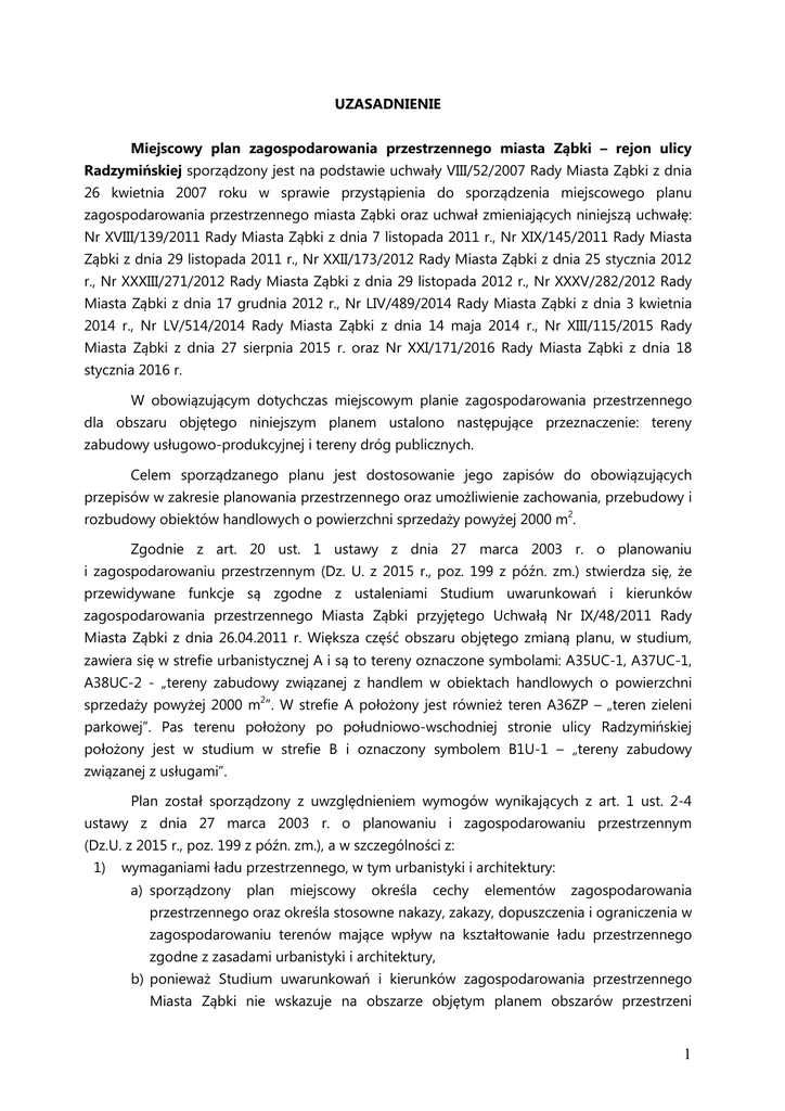UZASADNIENIE Miejscowy plan zagospodarowania przestrzennego miasta Ząbki – rejon ulicy Radzymińskiej sporządzony jest na podstawie uchwały VIII/52/2007 Rady Miasta Ząbki z dnia 26 kwietnia 2007 roku w sprawie przystąpienia do sporządzenia miejscowego planu zagospodarowania przestrzennego miasta Ząbki oraz uchwał zmieniających niniejszą uchwałę: Nr XVIII/139/2011 Rady Miasta Ząbki z dnia 7 listopada 2011 r., Nr XIX/145/2011 Rady Miasta Ząbki z dnia 29 listopada 2011 r., Nr XXII/173/2012 Rady Miasta Ząbki z dnia 25 stycznia 2012 r., Nr XXXIII/271/2012 Rady Miasta Ząbki z dnia 29 listopada 2012 r., Nr XXXV/282/2012 Rady Miasta Ząbki z dnia 17 grudnia 2012 r., Nr LIV/489/2014 Rady Miasta Ząbki z dnia 3 kwietnia 2014 r., Nr LV/514/2014 Rady Miasta Ząbki z dnia 14 maja 2014 r., Nr XIII/115/2015 Rady Miasta Ząbki z dnia 27 sierpnia 2015 r. oraz Nr XXI/171/2016 Rady Miasta Ząbki z dnia 18 stycznia 2016 r. W obowiązującym dotychczas miejscowym planie zagospodarowania przestrzennego dla obszaru objętego niniejszym planem ustalono następujące przeznaczenie: tereny zabudowy usługowo-produkcyjnej i tereny dróg publicznych. Celem sporządzanego planu jest dostosowanie jego zapisów do obowiązujących przepisów w zakresie planowania przestrzennego oraz umożliwienie zachowania, przebudowy i rozbudowy obiektów handlowych o powierzchni sprzedaży powyżej 2000 m2. Zgodnie z art. 20 ust. 1 ustawy z dnia 27 marca 2003 r. o planowaniu i zagospodarowaniu przestrzennym (Dz. U. z 2015 r., poz. 199 z późn. zm.) stwierdza się, że przewidywane funkcje są zgodne z ustaleniami Studium uwarunkowań i kierunków zagospodarowania przestrzennego Miasta Ząbki przyjętego Uchwałą Nr IX/48/2011 Rady Miasta Ząbki z dnia 26.04.2011 r. Większa część obszaru objętego zmianą planu, w studium, zawiera się w strefie urbanistycznej A i są to tereny oznaczone symbolami: A35UC-1, A37UC-1, A38UC-2 - „tereny zabudowy związanej z handlem w obiektach handlowych o powierzchni sprzedaży powyżej 2000 m2”. W strefie A położony jest również teren A36ZP – „teren zieleni parkowej”. Pas terenu położony po południowo-wschodniej stronie ulicy Radzymińskiej położony jest w studium w strefie B i oznaczony symbolem B1U-1 – „tereny zabudowy związanej z usługami”. Plan został sporządzony z uwzględnieniem wymogów wynikających z art. 1 ust. 2-4 ustawy z dnia 27 marca 2003 r. o planowaniu i zagospodarowaniu przestrzennym (Dz.U. z 2015 r., poz. 199 z późn. zm.), a w szczególności z: 1) wymaganiami ładu przestrzennego, w tym urbanistyki i architektury: a) sporządzony plan miejscowy określa cechy elementów zagospodarowania przestrzennego oraz określa stosowne nakazy, zakazy, dopuszczenia i ograniczenia w zagospodarowaniu terenów mające wpływ na kształtowanie ładu przestrzennego zgodne z zasadami urbanistyki i architektury, b) ponieważ Studium uwarunkowań i kierunków zagospodarowania przestrzennego Miasta Ząbki nie wskazuje na obszarze objętym planem obszarów przestrzeni 1 publicznej to plan miejscowy nie ustala wymagań wynikających z kształtowania tych przestrzeni; 2) uwzględnieniem walorów architektonicznych i krajobrazowych – sporządzony plan miejscowy nie wpływa negatywnie na walory architektoniczne i krajobrazowe obszaru, dla którego jest sporządzany, a gabaryty i lokalizacja projektowanej zabudowy nawiązują do budynków istniejących położonych w obszarze planu; 3) wymaganiami ochrony środowiska, w tym gospodarowania wodami i ochrony gruntów rolnych i leśnych: a) sporządzony plan miejscowy określa zasady ochrony środowiska poprzez zapewnianie rozwiązania problemów zabudowy gminy takich jak gospodarka wodna, odprowadzanie ścieków, gospodarka odpadami i system transportowy oraz poprzez określenie zasad w zakresie ochrony powietrza, wód, gleby, ziemi, ochrony urządzeń melioracji, b) na obszarze planu nie występują formy ochrony przyrody, w związku z tym odstąpiono od ustalania nakazów, zakazów, dopuszczeń i ograniczeń w zagospodarowaniu terenów wynikających z przepisów odrębnych, c) na obszarze planu nie występują tereny górnicze, obszary szczególnego zagrożenia powodzią i obszary osuwania się mas ziemnych, w związku z tym odstąpiono od ustalania ich granic i sposobów zagospodarowania, d) na obszarze planu nie występują grunty chronione na podstawie ustawy o ochronie gruntów rolnych i leśnych, 4) wymaganiami ochrony dziedzictwa kulturowego i zabytków oraz dóbr kultury współczesnej – ze względu na brak występowania obiektów i terenów, dla których plan ustalałby konieczność ochrony, sporządzony plan miejscowy nie określa ustaleń w tym zakresie; 5) wymaganiami ochrony zdrowia oraz bezpieczeństwa ludzi i mienia, a także potrzeby osób niepełnosprawnych – sporządzony plan miejscowy nie wpływa negatywnie na wymagania z zakresu ochrony zdrowia oraz bezpieczeństwa ludzi i mienia, a także potrzeby osób niepełnosprawnych, a ustalenia dotyczące ochrony środowiska odnoszą się również do ochrony zdrowia oraz bezpieczeństwa ludzi; 6) uwzględnieniem walorów ekonomicznych przestrzeni - po wykonaniu analiz istniejącego zagospodarowania i uzbrojenia obszaru, w sporządzonym planie miejscowym pozostawiono, jako funkcję wiodącą, tereny zabudowy usługowej, w tym obiektów handlowych o powierzchni sprzedaży powyżej 2000 m2, mając na uwadze, że tereny te położone są w pełni wykształconej zwartej strukturze funkcjonalno-przestrzennej co m.in. minimalizować będzie transportochłonność układu przestrzennego, umożliwi mieszkańcom maksymalne wykorzystanie publicznego transportu zbiorowego jako podstawowego środka transportu oraz umożliwi zapewnienie rozwiązań przestrzennych, ułatwiających przemieszczanie się pieszych i rowerzystów; 7) uwzględnieniem prawa własności – sporządzony plan miejscowy uwzględnia prawo własności gruntów m.in. poprzez wprowa