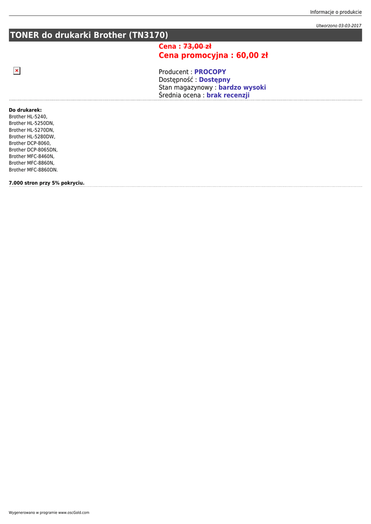 Informacje o produkcie Utworzono 03-03-2017 TONER do drukarki Brother (TN3170) Cena : 73,00 zł Cena promocyjna : 60,00 zł Producent : PROCOPY Dostępność : Dostępny Stan magazynowy : bardzo wysoki Średnia ocena : brak recenzji Do drukarek: Brother HL-5240, Brother HL-5250DN, Brother HL-5270DN, Brother HL-5280DW, Brother DCP-8060, Brother DCP-8065DN, Brother MFC-8460N, Brother MFC-8860N, Brother MFC-8860DN. 7.000 stron przy 5% pokryciu. Wygenerowano w programie www.oscGold.com
