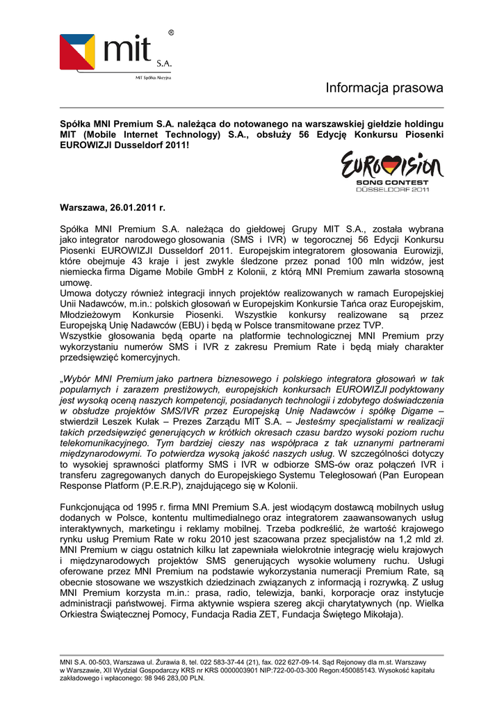 Informacja prasowa Spółka MNI Premium S.A. należąca do notowanego na warszawskiej giełdzie holdingu MIT (Mobile Internet Technology) S.A., obsłuży 56 Edycję Konkursu Piosenki EUROWIZJI Dusseldorf 2011! Warszawa, 26.01.2011 r. Spółka MNI Premium S.A. należąca do giełdowej Grupy MIT S.A., została wybrana jako integrator narodowego głosowania (SMS i IVR) w tegorocznej 56 Edycji Konkursu Piosenki EUROWIZJI Dusseldorf 2011. Europejskim integratorem głosowania Eurowizji, które obejmuje 43 kraje i jest zwykle śledzone przez ponad 100 mln widzów, jest niemiecka firma Digame Mobile GmbH z Kolonii, z którą MNI Premium zawarła stosowną umowę. Umowa dotyczy również integracji innych projektów realizowanych w ramach Europejskiej Unii Nadawców, m.in.: polskich głosowań w Europejskim Konkursie Tańca oraz Europejskim, Młodzieżowym Konkursie Piosenki. Wszystkie konkursy realizowane są przez Europejską Unię Nadawców (EBU) i będą w Polsce transmitowane przez TVP. Wszystkie głosowania będą oparte na platformie technologicznej MNI Premium przy wykorzystaniu numerów SMS i IVR z zakresu Premium Rate i będą miały charakter przedsięwzięć komercyjnych. „Wybór MNI Premium jako partnera biznesowego i polskiego integratora głosowań w tak popularnych i zarazem prestiżowych, europejskich konkursach EUROWIZJI podyktowany jest wysoką oceną naszych kompetencji, posiadanych technologii i zdobytego doświadczenia w obsłudze projektów SMS/IVR przez Europejską Unię Nadawców i spółkę Digame – stwierdził Leszek Kułak – Prezes Zarządu MIT S.A. – Jesteśmy specjalistami w realizacji takich przedsięwzięć generujących w krótkich okresach czasu bardzo wysoki poziom ruchu telekomunikacyjnego. Tym bardziej cieszy nas współpraca z tak uznanymi partnerami międzynarodowymi. To potwierdza wysoką jakość naszych usług. W szczególności dotyczy to wysokiej sprawności platformy SMS i IVR w odbiorze SMS-ów oraz połączeń IVR i transferu zagregowanych danych do Europejskiego Systemu Teległosowań (Pan European Response Platform (P.E.R.P), znajdującego się w Kolonii. Funkcjonująca od 1995 r. firma MNI Premium S.A. jest wiodącym dostawcą mobilnych usług dodanych w Polsce, kontentu multimedialnego oraz integratorem zaawansowanych usług interaktywnych, marketingu i reklamy mobilnej. Trzeba podkreślić, że wartość krajowego rynku usług Premium Rate w roku 2010 jest szacowana przez specjalistów na 1,2 mld zł. MNI Premium w ciągu ostatnich kilku lat zapewniała wielokrotnie integrację wielu krajowych i międzynarodowych projektów SMS generujących wysokie wolumeny ruchu. Usługi oferowane przez MNI Premium na podstawie wykorzystania numeracji Premium Rate, są obecnie stosowane we wszystkich dziedzinach związanych z informacją i rozrywką. Z usług MNI Premium korzysta m.in.: prasa, radio, telewizja, banki, korporacje oraz instytucje administracji państwowej. Firma aktywnie wspiera szereg akcji charytatywnych (np. Wielka Orkiestra Świątecznej Pomocy, Fundacja Radia ZET, Fundacja Świętego Mikołaja). MNI S.A. 00-503, Warszawa ul. Żurawia 8, tel. 022 583-37-44 (21), fax. 022 627-09-14. Sąd Rejonowy dla m.st. Warszawy w Warszawie, XII Wydzial Gospodarczy KRS nr KRS 0000003901 NIP:722-00-03-300 Regon:450085143. Wysokość kapitału zakładowego i wpłaconego: 98 946 283,00 PLN. Informacja prasowa Po trzech kwartałach br. skonsolidowany zysk netto MIT S.A. wyniósł 16,4 mln zł, o 19,5% więcej niż w tym samym okresie 2009 r. Zysk z działalności operacyjnej (EBIT) grupy MIT wyniósł 24,5 mln zł, rosnąc o 174,5%. Przychody ze sprzedaży netto wyniosły 78,6 mln zł. Kolejne projekty rozwojowe Zarząd MIT S.A. konsekwentnie realizuje strategię rozwoju zasobów i koncentracji na wzroście rentowności, poprzez rozwój segmentów zapewniających wyższe marże. To między innymi Centrum Outsourcingu usług który to projekt uzyskał wsparcie z funduszy europejskich od Polskiej Agencji Rozwoju Przedsiębiorczości. MIT S.A. oraz spółki zależne pracują nad rozwojem nowych produktów, które w przyszłych latach mają generować znaczącą część przychodów. Mapy i lokalizatory cyfrowe to kolejny projekt realizowany przez Spółkę zależną Navigo za pieniądze europejskie. - Planujemy w tym roku wprowadzić szereg projektów internetowych mobilnych, które powinny zwiększyć nasze przychody i zyski. Jesteśmy liderem w usługach mobilnych. Chcemy przenieść nasze kompetencje do projektów internetowych, gdzie dzięki rozwojowi urządzeń umożliwiających mobilny dostęp do Internetu, będzie migrować coraz więcej naszych klientów – komentuje Leszek Kułak. Kontakt dla mediów: Malwina Kiepiel Dyrektor Biura Komunikacji I Strategii Marketingowej MNI S.A. (22) 583 37 27; tel. kom. 786 040 144 [email protected] Tomasz Brzeziński Koordynator ds. Public Relations (22) 583 37 44; tel. kom. 607 036 429 [email protected] MNI S.A. 00-503, Warszawa ul. Żurawia 8, tel. 022 583-37-44 (21), fax. 022 627-09-14. Sąd Rejonowy dla m.st. Warszawy w Warszawie, XII Wydzial Gospodarczy KRS nr KRS 0000003901 NIP:722-00-03-300 Regon:450085143. Wysokość kapitału zakładowego i wpłaconego: 98 946 283,00 PLN.