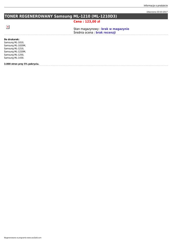 Informacje o produkcie Utworzono 03-03-2017 TONER REGENEROWANY Samsung ML-1210 (ML-1210D3) Cena : 123,00 zł Stan magazynowy : brak w magazynie Średnia ocena : brak recenzji Do drukarek: Samsung ML-1010, Samsung ML-1020M, Samsung ML-1210, Samsung ML-1220M, Samsung ML-1250, Samsung ML-1430. 3.000 stron przy 5% pokryciu. Wygenerowano w programie www.oscGold.com
