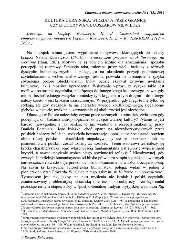 Синопсис: текст, контекст, медіа, № 1 (13), 2016 KULTURA UKRAIŃSKA, WIDZIANA PRZEZ GRANICĘ CZYLI ODKRYWANIE OBSZARÓW NIEWIEDZY (recenzja na książkę: Ковальчук Н. Д. Символічні структури етнокультурного процесу в Україні / Ковальчук Н. Д. – К.: НАКККіМ, 2012. – 262 с.) Na początek winna jestem wyjaśnienie motywów, skłaniających do lektury książki Natalii Kowalczuk (Struktury symboliczne procesu etnokulturowego na Ukrainie [tłum. RK]). Motywy te są bowiem istotne dla zrozumienia sposobu percepcji tej rozprawy. Strategia taka, zalecana przez wielu badaczy z różnych dyscyplin humanistycznych1, a polegająca na określeniu pozycji podmiotowej czytelnika/autora wobec analizowanego tekstu, pozwala na zmniejszenie ryzyka stworzenia pozoru obiektywizmu, który będzie skrywał zarówno uwikłanie kulturowe, jak i możliwe uprzedzenia. Wskazanie wprost, że ryzyko takie jest możliwe po stronie czytelnika, należącego do innego kręgu kulturowego, nawet gdy nie ma bezpośredniego związku pomiędzy tym kręgiem, a tym drugim – do którego należy dzieło – jest krokiem uzasadnionym. W przypadku, gdy kręgi te nie tylko się stykają, ale gdy styczność ta ma charakter wysoce konfliktogennego, sięgającego głęboko w historię, uwikłania, zaznaczenie tej okoliczności jest niezbędne. Dlaczego w Polsce należałoby czytać prace uczonych ukraińskich, zwłaszcza gdy podejmują oni badania antropologiczne, dotyczące własnej kultury? Pytanie to jest bardzo niewygodne; a jak bardzo, to już wiadomo z recepcji znakomitej pracy Daniela Beauvois2. Jego książka, choć oparta na niewykorzystywanych przez polskich badaczy źródłach, wzbudziła konsternację i opór: autor przedstawił bowiem obraz relacji polsko – ukraińskich niepokrywający się ze schematem, jaki w piśmiennictwie polskim został uznany za wzorzec. Temu wzorcowi też należy się krótka charakterystyka: jego właściwością fundamentalną jest swoiste wyjęcie spod krytyki, a nawet uchylenie wobec niego powinności refleksji. 3 Nieodzownej, gdy zważyć, że refleksja humanistyczna od blisko półwiecza skupia się także na własnych naiwnościach i kwestionuje prawomocność utożsamiania naiwności z oczywistością. Na czym ta krytyczna autorefleksja humanistyki polega, widać w jednej z pionierskich prac Edwarda W. Saida z tego zakresu, w Kulturze i imprerializmie4. Tymczasem jest tak, jakby ten nurt myślenia nie istniał; i polski czytelnik, zainteresowany problematyką ukraińską (ale też białoruską czy litewską) nadal pozostaje na tym etapie, który w (post)kolonialnej tradycji brytyjskiej wyznacza Raj 1 Zalecenia np. G.Chakravorty Spivak (Can the Subaltern Speak? (w:) C. Nelson, L. Grossberg, Marxism and the Interpretation of Culture, Univ. of Illinois Pr., 1988) czy D. LaCapry (np. Historia w okresie przejściowym. Doświadczenie, tożsamość, teoria krytyczna, tł. K. Bojarska, Kraków 2009 s. 26 – 78;) są uznawane za kanoniczne wskazówki z zakresu metodologii badań humanistycznych. Por. także: Deltecheva R., The difficult topos in-between: The East Central European cultural context as a post-coloniality, „Sarmatian Review” 18 (2)/1998, s. 557 – 562. 2 D. Beauvois, Trójkąt ukraiński. Szlachta, carat i lud na Wołyniu, Podolu i Kijowszczyźnie, tł. K. Rutkowski, Lublin 1005. 3 Wprowadzenie krytycznego dyskursu w tym zakresie jest stosunkowo świeże. Zob. J. Niedźwiedź, Sarmatyzm czyli tradycja wynaleziona, „Teksty Drugie”, t. „Zwrot sarmacki” 1/2015, s. 46 – 53; A. Kubiak, peryferyjn samosterowność i ambiwalencja, tamże, s. 96 – 106. Ważną książką, której istotnym watkiem jest konfrontacja dyskursu kresoznawczego z historią jest Fantomowe ciało króla. Peryferyjne zmagania z nowoczesną formą, Kraków 2011. 4 E.W. Said, Kultura i imperializm, tł. M. Wyrwas - Wiśniewska, Kraków 2009. . © Romana Kolarzowa Синопсис: текст, контекст, медіа, № 1 (13), 2016 Nostalgia; czyli na etapie „dyskursu kresoznawczego”. To jednak, co istotnie różni ów dyskurs kresoznawczy od dyskursu raj nostalgii, to brak świadomości, że ów dyskurs jest ograniczony do jednej pozycji – do pozycji strony, w pewnym okresie historycznym dominującej politycznie i starającej zapewnić sobie dominację w sferze symbolicznej. Niedostateczność takiego dyskursu, gdy zostaje zauważona, skłania przynajmniej do zastanowienia się nad tym, jak ta relacja była i jest postrzegana z drugiej strony. Jeśli zaczyna się dostrzegać ideologiczny charakter dyskursu kresoznawczego (podobnie, jak każdego dyskursu, wytworzonego w realiach kolonialnych i postkolonialnych ), rodzi się problem następujący: już wiadomo, jak terytoria ongiś podporządkowane widzą dawni hegemonowie – ale czym one są w świadomości swoich rdzennych mieszkańców? Już wiadomo, jak kultura takich terytoriów została „zorientalizowana”5: sprowadzona do wygodnej i legitymizującej roszczenia do dominacji symbolicznej formuły „niższości cywilizacyjnej’, „kultury przedpiśmiennej” czy „kultury ludowej”. Czym jednak ta kultura jest dla ludzi, którzy ją tworzyli i którzy byli przez nią kształtowani? Poznawczo bardziej znaczące jest dotarcie do tego, czym jest kultura ukraińska dla Ukraińców (podobnie, jak indyjska dla Hindusów), niż poprzestawanie na przyjęciu, że obraz tej kultury, widziany z zewnątrz, jest nie tylko w pełni wiarygodny, ale też jedyny możliwy. Natalia Kowalczuk podjęła się zadania imponującego: przedstawienia zasobów symbolicznych, stanowiących postawę odrębności kultury ukraińskiej i pozwalających na określenie tożsamości etnokulturowej. Czytelnik „zewnętrzny”, obciążony dodatkową niedoskonałością, jaką jest skromna znajomość języka, otrzymuje bardzo mu potrzebną lekcję r