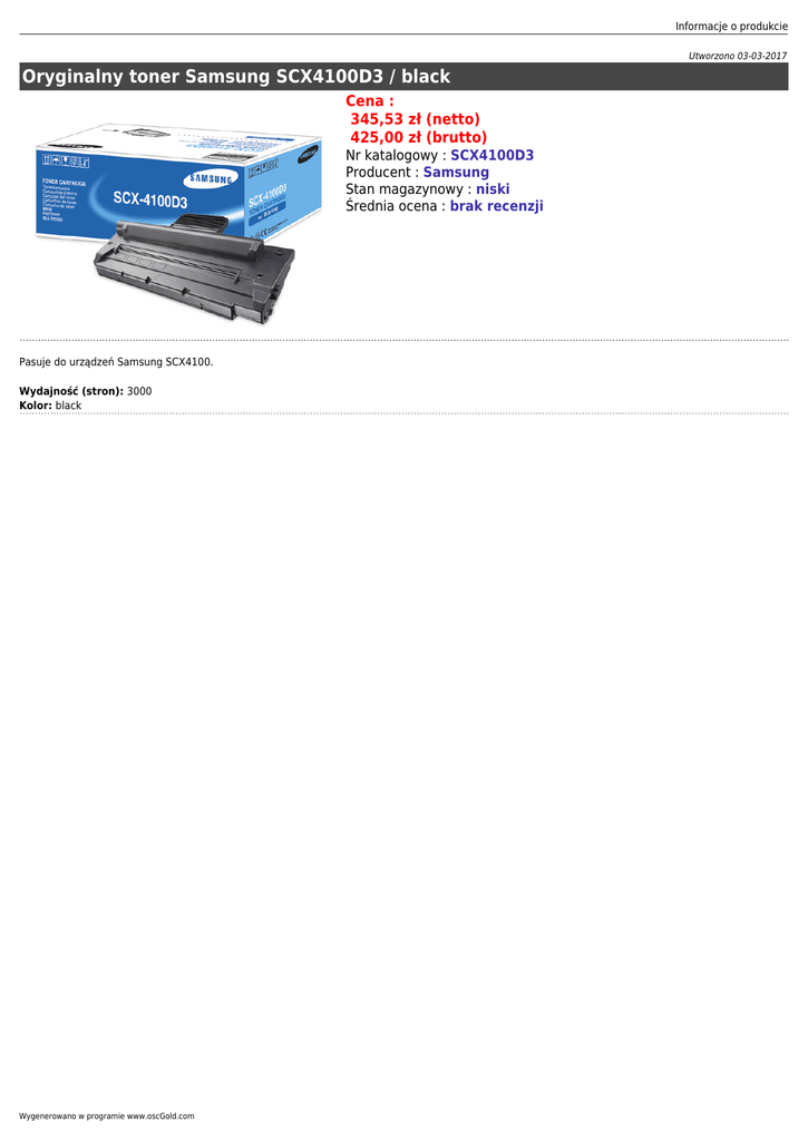 Informacje o produkcie Utworzono 03-03-2017 Oryginalny toner Samsung SCX4100D3 / black Cena : 345,53 zł (netto) 425,00 zł (brutto) Nr katalogowy : SCX4100D3 Producent : Samsung Stan magazynowy : niski Średnia ocena : brak recenzji Pasuje do urządzeń Samsung SCX4100. Wydajność (stron): 3000 Kolor: black Wygenerowano w programie www.oscGold.com