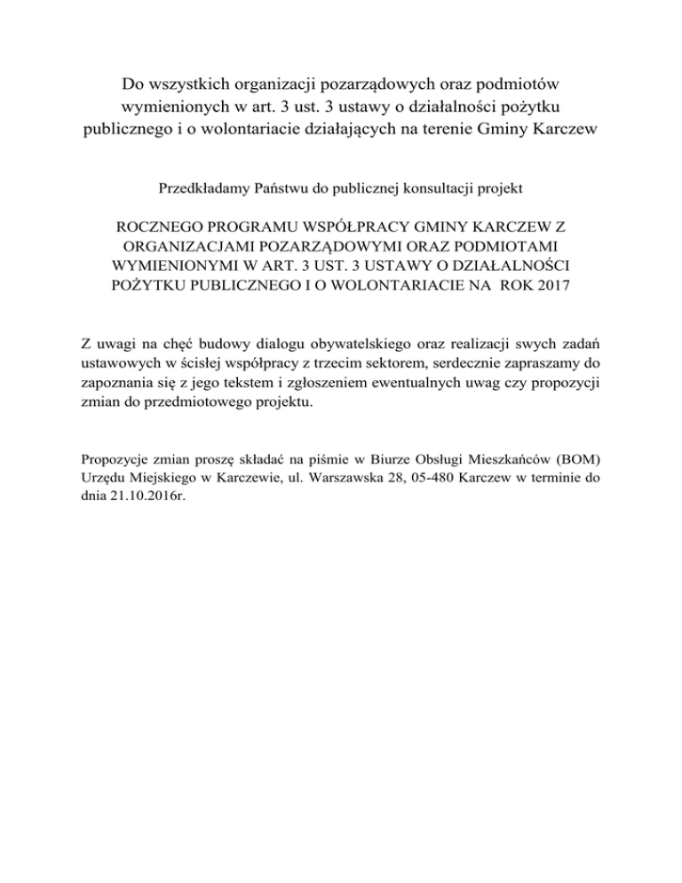 Do wszystkich organizacji pozarządowych oraz podmiotów wymienionych w art. 3 ust. 3 ustawy o działalności pożytku publicznego i o wolontariacie działających na terenie Gminy Karczew Przedkładamy Państwu do publicznej konsultacji projekt ROCZNEGO PROGRAMU WSPÓŁPRACY GMINY KARCZEW Z ORGANIZACJAMI POZARZĄDOWYMI ORAZ PODMIOTAMI WYMIENIONYMI W ART. 3 UST. 3 USTAWY O DZIAŁALNOŚCI POŻYTKU PUBLICZNEGO I O WOLONTARIACIE NA ROK 2017 Z uwagi na chęć budowy dialogu obywatelskiego oraz realizacji swych zadań ustawowych w ścisłej współpracy z trzecim sektorem, serdecznie zapraszamy do zapoznania się z jego tekstem i zgłoszeniem ewentualnych uwag czy propozycji zmian do przedmiotowego projektu. Propozycje zmian proszę składać na piśmie w Biurze Obsługi Mieszkańców (BOM) Urzędu Miejskiego w Karczewie, ul. Warszawska 28, 05-480 Karczew w terminie do dnia 21.10.2016r. Projekt UCHWAŁA Nr ……. RADY MIEJSKIEJ W KARCZEWIE z dnia …………………r. sprawie przyjęcia rocznego programu współpracy Gminy Karczew z organizacjami pozarządowymi oraz podmiotami wymienionymi w art. 3 ust. 3 ustawy o działalności pożytku publicznego i o wolontariacie na rok 2017 Na podstawie art. 18 ust. 2 pkt. 15 ustawy z dnia 8 marca 1990 r. o samorządzie gminnym (Dz. U. z 2016 r., poz. 446 z późn. zm.1) w zw. z art. 5a ust. 1 ustawy z dnia 24 kwietnia 2003 r. o działalności pożytku publicznego i o wolontariacie (Dz. U. z 2016 r., poz. 239 z późn. zm.2) uchwala się, co następuje: § 1. Przyjmuje się roczny program współpracy Gminy Karczew z organizacjami pozarządowymi oraz podmiotami wymienionymi w art. 3 ust. 3 ustawy o działalności pożytku publicznego i o wolontariacie na rok 2017, w brzmieniu stanowiącym Załącznik do niniejszej uchwały. § 2. Wykonanie uchwały powierza się Burmistrzowi Karczewa. § 3. Uchwała wchodzi w życie z dniem podjęcia z mocą obowiązującą od 1 stycznia 2017 roku. _________________________________ 1 2 Zmiany tekstu jednolitego wymienionej ustawy zostały ogłoszone w: Dz. U. z 2016 r., poz. 1579. Zmiany tekstu jednolitego wymienionej ustawy zostały ogłoszone w: Dz. U. z 2016 r., poz. 395. UZASADNIENIE Zgodnie z art. 5a ust. 1 ustawy z dnia 24 kwietnia 2003 r. o działalności pożytku publicznego i o wolontariacie (Dz. U. z 2016 r., poz. 239 ze zm.) organ stanowiący jednostki samorządu terytorialnego uchwala, po konsultacjach z organizacjami pozarządowymi oraz podmiotami wymienionymi w art. 3 ust. 3, roczny program współpracy z organizacjami pozarządowymi oraz podmiotami, wymienionymi w art. 3 ust. 3 w/w ustawy. Podjęcie przedmiotowej uchwały umożliwi realizację zadań publicznych przez organizacje pozarządowe i inne podmioty, o których mowa w ustawie, na zasadach określonych w załączniku do uchwały. ZAŁACZNIK do UCHWAŁY NR …………. RADY MIEJSKIEJ W KARCZEWIE Z DNIA ………………… PROGRAM WSPÓŁPRACY GMINY KARCZEW Z ORGANIZACJAMI POZARZĄDOWYMI ORAZ PODMIOTAMI WYMIENIONYMI W ART. 3 UST. 3 USTAWY O DZIAŁALNOŚCI POŻYTKU PUBLICZNEGO I O WOLONTARIACIE NA ROK 2017 § 1. Podstawą programu współpracy Gminy Karczew z organizacjami pozarządowymi oraz podmiotami wymienionymi w art. 3 ust. 3 ustawy o działalności pożytku publicznego i o wolontariacie na rok 2017 zwanego dalej „Programem” jest art. 5a ust. 1 ustawy z dnia 24 kwietnia 2003 r. o działalności pożytku publicznego i o wolontariacie (Dz. U. z 2016 r., poz. 239 ze zm.). Niniejszy program jest wyrazem polityki władz Gminy Karczew wobec organizacji pozarządowych i podmiotów wymienionych w art. 3 ust. 3 w/w ustawy, mającej na uwadze wspieranie ich inicjatyw i działań oraz zapewnienie im na terenie Gminy Karczew jak najlepszych warunków funkcjonowania. § 2. 1. Ilekroć w Programie jest mowa o: 1) ustawie – należy przez to rozumieć ustawę z dnia 24 kwietnia 2003 r. o działalności pożytku publicznego i o wolontariacie (Dz. U. z 2016 r., poz. 239 ze zm.); 2) podmiotach Programu – należy przez to rozumieć organizacje pozarządowe i podmioty wymienione w art. 3 ust. 3 ustawy o działalności pożytku publicznego i o wolontariacie; 3) Programie – należy przez to rozumieć „Roczny program współpracy Gminy Karczew z o organizacjami pozarządowymi i podmiotami wymienionymi w art. 3 ust. 3 ustawy o działalności pożytku publicznego i o wolontariacie na rok 2017”; 4) Radzie – należy przez to rozumieć Radę Miejską w Karczewie; 5) Burmistrzu – należy przez to rozumieć Burmistrza Karczewa; 6) jednostki organizacyjne – należy przez to rozumieć jednostki organizacyjne Gminy Karczew; 7) Gminie – należy przez to rozumieć Gminę Karczew. 2. Współpraca z podmiotami programu obejmuje zadania o zasięgu lokalnym i opiera się na zasadach pomocniczości, suwerenności stron, partnerstwa, efektywności, uczciwej konkurencji i jawności. § 3. 1. Celem głównym programu jest kształtowanie społeczeństwa obywatelskiego, jego udział w rozwiązywaniu lokalnych problemów poprzez budowanie i umacnianie partnerstwa pomiędzy Gminą Karczew a organizacjami pozarządowymi a także poprzez stwarzanie warunków sprzyjających wzrostowi aktywności społecznej mieszkańców. 2. Celami szczegółowymi programu są: 1) przeciwdziałanie patologiom społecznym; 2) aktywizacja społeczności lokalnej; 3) wyrównywanie szans życiowych osób niepełnosprawnych; 4) zwiększenie udziału mieszkańców w rozwiązywaniu lokalnych problemów; 5) zagospodarowanie czasu wolnego mieszkańcom Gminy Karczew; 6) podniesienie bezpieczeństwa publicznego; 7) kształtowanie lokalnego społeczeństwa obywatelskiego i wspomaganie rozwoju społeczności lokalnych 8) integracja podmiotów realizujących zadania publiczne; 9) wzmocnienie potencjału organizacji pozarządowych i podmiotów wymienionych w art.3 ust. 3 ustawy; 10) rozwijanie samorządności i edukacji obywatelskiej; 11) promowanie współpracy, w tym w relacjach pomiędzy Gminą K