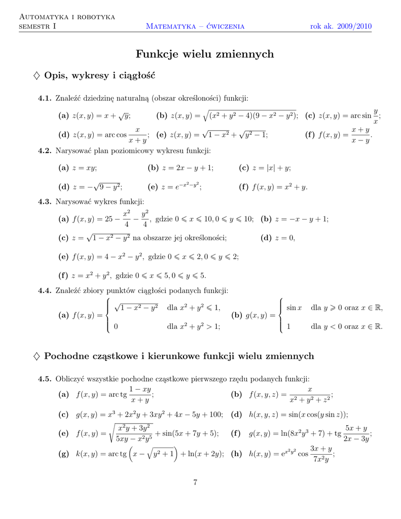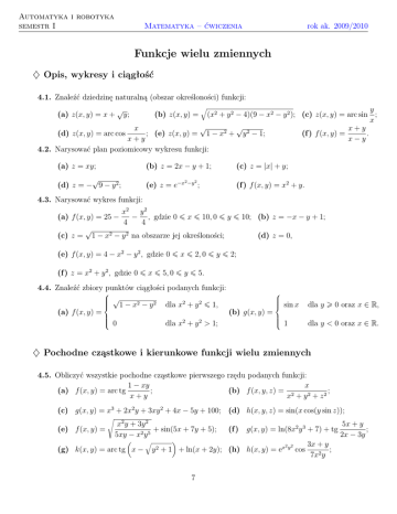 Automatyka i robotyka semestr I rok ak. 2009/2010 Matematyka – ćwiczenia Funkcje wielu zmiennych ♦ Opis, wykresy i ciągłość 4.1. Znaleźć dziedzinę naturalną (obszar określoności) funkcji: y (x2 + y 2 − 4)(9 − x2 − y 2 ); (c) z(x, y) = arc sin ; x √ √ x x + y (d) z(x, y) = arc cos ; (e) z(x, y) = 1 − x2 + y 2 − 1; (f ) f (x, y) = . x+y x−y 4.2. Narysować plan poziomicowy wykresu funkcji: (a) z(x, y) = x + √ y; (b) z(x, y) = q (a) z = xy; (b) z = 2x − y + 1; √ (d) z = − 9 − y 2 ; (e) z = e−x 2 −y 2 ; (c) z = |x| + y; (f ) f (x, y) = x2 + y. 4.3. Narysować wykres funkcji: (a) f (x, y) = 25 − (c) z = √ x2 y 2 − , gdzie 0 ¬ x ¬ 10, 0 ¬ y ¬ 10; (b) z = −x − y + 1; 4 4 1 − x2 − y 2 na obszarze jej określoności; (d) z = 0, (e) f (x, y) = 4 − x2 − y 2 , gdzie 0 ¬ x ¬ 2, 0 ¬ y ¬ 2; (f ) z = x2 + y 2 , gdzie 0 ¬ x ¬ 5, 0 ¬ y ¬ 5. 4.4. Znaleźć zbiory punktów ciągłości podanych funkcji: √ sin x 1 − x2 − y 2 dla x2 + y 2 ¬ 1, (a) f (x, y) = (b) g(x, y) = 0 1 dla x2 + y 2 > 1; dla y 0 oraz x ∈ R, dla y < 0 oraz x ∈ R. ♦ Pochodne cząstkowe i kierunkowe funkcji wielu zmiennych 4.5. Obliczyć wszystkie pochodne cząstkowe pierwszego rzędu podanych funkcji: 1 − xy x (a) f (x, y) = arc tg ; (b) f (x, y, z) = 2 ; x+y x + y2 + z2 (c) g(x, y) = x3 + 2x2 y + 3xy 2 + 4x − 5y + 100; (d) h(x, y, z) = sin(x cos(y sin z)); s (e) f (x, y) = x2 y + 3y 2 + sin(5x + 7y + 5); 5xy − x2 y 5 (g) k(x, y) = arc tg x − q y2 (f ) g(x, y) = ln(8x2 y 3 + 7) + tg + 1 + ln(x + 2y); (h) h(x, y) = ex 7 2 y2 cos 3x + y ; 7x2 y 5x + y ; 2x − 3y Automatyka i robotyka semestr I (i) f (x, y) = (j) g(x, y) = q √ rok ak. 2009/2010 Matematyka – ćwiczenia 8x2 y + sin x2 + cos(y 2 x3 ) + (8xy 2 − 7x)10 ; √ 5x2 + y 3 − arc sin x2 + 3y + 5exy . 4.6. Obliczyć: (a) q ∂f √ (1, 5), jeżeli f (x, y) = x3 y 3 + y + y; ∂x (b) √ ∂f (2, 5), jeżeli f (x, y) = y 2 + 1 − x2 . ∂y 4.7. Obliczyć wszystkie pochodne cząstkowe drugiego rzędu funkcji i sprawdzić, czy pochodne cząstkowe mieszane są równe: (a) f (x, y) = sin(x2 + y 2 ); 1 (b) g(x, y, z) = √ 2 ; x + y2 + z2 (c) h(x, y, z) = ln(x2 + y 4 + z 6 + 1); (d) f (x, y) = exy . 2 ∂ 2u ∂ 2u ∂ 2u 1 4.8. Sprawdzić, czy funkcja u = √ 2 spełnia równanie + + = 0? ∂x2 ∂y 2 ∂z 2 x + y2 + z2 4.9. Obliczyć gradienty podanych funkcji we wskazanych punktach: (a) f (x, y) = x2 + y 2 , (b) g(x, y, z) = exyz , P = (−3, 4); P = (−1, 1, −1). 4.10. Obliczyć długość gradient funkcji u = x3 + y 3 − 3z w punkcie P (2, 1, 0). 4.11. Obliczyć pochodne kierunkowe podanych funkcji punkcie P i kierunku ~v : √w " # 1 3 (a) f (x, y) = sin x cos y, P (0, π), ~v = − , ; 2 2 z−x 6 3 2 (b) f (x, y, z) = , P (1, 0, −3), ~v = − , , − . z+y 7 7 7 2 2 4.12. Obliczyć pochodną funkcji z = 2x − 3y w punkcie P0 (1, 0) w kierunku półosi P0 s o kątach 2 π kierunkowych α = π, β = . 3 6 4.13. Dana jest funkcja f (x, y, z) = x2 + 3xyz + yz 3 . Obliczyć df w punkcie P0 (5, 2, 1), jeżeli ds wiadomo, że wektor v = [3, 3, 3] jest zgodnie równoległy do półosi P0 s. 4.14. Napisać równania płaszczyzn stycznych do wykresów podanych funkcji we wskazanych punktach wykresu: √ ! 1 3 arc sin x (a) f (x, y) = , (x0 , y0 , z0 ) = − , , −1 ; (b) f (x, y) = xy , (x0 , y0 , z0 ) = (2, 4, 16). arc cos y 2 2 8 Automatyka i robotyka semestr I rok ak. 2009/2010 Matematyka – ćwiczenia ♦ Różniczka funkcji wielu zmiennych 4.15. Napisać różniczki podanych funkcji we wskazanych punktach: y (a) f (x, y) = arc cos , (x0 , y0 ) = (4, 1); (b) f (x, y, z) = xy − z x , (x0 , y0 , z0 ) = (2, 4, 6). x 4.16. Wykorzystując różniczkę funkcji obliczyć przybliżone wartości podanych wyraże/n: (a) √ 2, 1 · 8, 05; (b) 1, 083,96 ; (c) sin 1, 49 · arc tg 0, 07 ; 22,95 (d) q 3 (2.93)3 + (4.05)3 + (4.99)3 . 4.17. Wykorzystując różniczkę funkcji obliczyć w przybliżeniu jak zmieni się objętość V walca o promieniu podstawy R = 1 m i wysokości H = 2 m, jeżeli jego wysokość zwiększymy o 1 cm, a promień podstawy zmniejszymy o 3 cm? 4.18. Ciśnienie gazu w pewnym procesie technologicznym wyraża się wzorem p= 100eT , V gdzie T jest temperaturą gazu, a V jego objętością. Aktualne wartości tych parametrów wynoszą T = 0o C, V = 300 m3 . Objętość gazu wzrosła o 1 m3 . Obliczyć w przybliżeniu, jak należy zmienić temperaturę gazu, aby jego ciśnienie nie uległo zmianie. 4.19. Przy pomocy menzurki można zmierzyć objętość ciała z dokładnością ∆V = 0.1 cm3 , a przy pomocy wagi sprężynowej można ustalić jego masę z dokładnością ∆M = 1 g. Objętość ciała zmierzona tym sposobem wynosi V = 25 cm3 , a masa M = 200 g. Z jaką w przybliżeniu dokładnością można obliczyć gęstość ρ tego ciała? 4.20. Boki trójkątnego kawałka ziemi zmierzone z dokładnością 1 m wynoszą a = 250 m, b = 400 m. Kąt między tymi bokami zmierzony z dokładnością 0.01 rad wynosi α = dokładnością można obliczyć pole P tego kawałka ziemi? 9 π . Z jaką w przybliżeniu 3