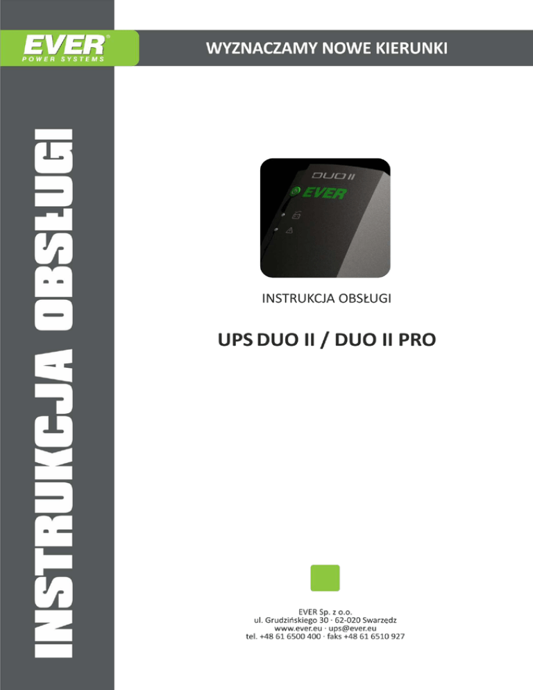 Instrukcja obsługi zasilaczy serii DUO II / DUO II Pro Instrukcja obsługi zasilaczy serii DUO II / DUO II Pro SPIS TRź CI WSTĘP ...................................................................................................................................... 3 OGÓLNA CHARAKTERYSTYKA ZASILACZA .............................................................. 3 BUDOWA ZASILACZA ......................................................................................................... 4 PANEL CZOŁOWY .............................................................................................................. 4 PANEL TYLNY .................................................................................................................... 4 INSTRUKCJA BHP ................................................................................................................. 5 INSTALACJA .......................................................................................................................... 6 ROZPAKOWANIE ................................................................................................................ 6 MONTAŻ ZASILACZA........................................................................................................ 6 CHARAKTERYSTYKA PRACY ZASILACZA .................................................................. 8 ZABEZPIECZENIA .............................................................................................................. 9 Przeciążeniowe ................................................................................................................... 9 Przeciwzwarciowe .............................................................................................................. 9 Przeciwprzepięciowe ........................................................................................................ 10 WSPÓŁPRACA ZASILACZA Z ZEWNĘTRZNYMI SYSTEMAMI ZARZĄDZAJĄCYMI ........................................................................................................... 10 UWAGI EKSPLOATACYJNE ............................................................................................ 11 BEZPIECZNIK .................................................................................................................... 11 WSPÓŁPRACA Z AGREGATAMI PRĄDOTWÓRCZYMI ............................................ 11 WYKORZYSTANIE FILTRA TELEFONICZNEGO ........................................................ 11 PRZECHOWYWANIE, KONSERWACJA I TRANSPORT ............................................. 12 UTYLIZACJA ..................................................................................................................... 12 PARAMETRY TECHNICZNE ............................................................................................ 13 INFORMACJE DOTYCZĄCE PRZEPISÓW I GWARANCJI....................................... 14 DEKLARACJA ZGODNOŚCI............................................................................................ 14 GWARANCJA ..................................................................................................................... 14 2012/12/20 Pomoc Techniczna, tel. +48 61 6500 400 www.ever.eu 2 Instrukcja obsługi zasilaczy serii DUO II / DUO II Pro WST P Dzi kujemy za dokonanie zakupu zasilacza awaryjnego DUO II / DUO II Pro. Przed rozpoczęciem użytkowania, prosimy o zapoznanie się z niniejszą instrukcją. Mamy nadzieję, że zakupiony UPS spełni Państwa oczekiwania. Zasilacze EVER DUO II / DUO II Pro zabezpieczają podłączone do nich urządzenia przed spadkami oraz zanikami napięcia w sieci, a także eliminują możliwo ć uszkodzeń w wyniku przepięć w sieci elektrycznej. Głównym przeznaczeniem zasilaczy EVER z serii DUO II / DUO II Pro jest zabezpieczenie komputerów PC, komputerowych urządzeń peryferyjnych oraz urządzeń fiskalnych. OżÓLNA CHARAKTźRYSTYKA ZASILACZA Cztery gniazda wyj ciowe IEC 320 z podtrzymaniem awaryjnym Synchronizacja z siecią “Zimny start” – możliwo ć uruchomienia bez podłączonego zasilania z sieci Dźwiękowa sygnalizacja rozładowania baterii Mikroprocesorowa kontrola wszystkich parametrów Odporno ć na przeciążenia Zabezpieczenie przed zwarciem Filtr telekomunikacyjny Komunikacja z komputerem poprzez port USB – dotyczy zasilaczy DUO II Pro UWAGA! Zasilacze DUO II / DUO II Pro nie s pracy z urz dzeniami medycznymi, a przeznaczone do w szczególno ci podtrzymuj cymi ycie i/lub zdrowie. 2012/12/20 Pomoc Techniczna, tel. +48 61 6500 400 www.ever.eu 3 Instrukcja obsługi zasilaczy serii DUO II / DUO II Pro BUDOWA ZASILACZA PANźL CZOŁOWY 1. Wyłącznik urządzenia 2. Sygnalizator trybu pracy 3. Sygnalizator awarii PANEL TYLNY 1. Gniazda wyj ciowe 4 x IEC 320 2. Bezpiecznik automatyczny 3. Przewód zasilający 4. Filtr telefoniczny RJ 5. Gniazdo komunikacji z komputerem (USB)dotyczy zasilaczy DUO II Pro 2012/12/20 Pomoc Techniczna, tel. +48 61 6500 400 www.ever.eu 4 Instrukcja obsługi zasilaczy serii DUO II / DUO II Pro INSTRUKCJA BHP Praca urządzenia oraz jego magazynowanie powinno odbywać się w warunkach zgodnych ze specyfikacją urządzenia. Przy krótkotrwałym zwarciu duży prąd może spowodować poważne oparzenia. Przed podłączeniem urządzenia należy sprawdzić stan techniczny przewodów, wtyków i gniazd zasilania oraz stan samego urządzenia. Urządzenie musi być włączone do gniazda trójprzewodowego (dwa bieguny i uziemienie) – podłączenie do gniazda innego rodzaju grozi porażeniem. Urządzenie zasilane poprzez przewód z wtyczką posiada przewód uziemiający, który odprowadza prąd upływowy od odbiorników (np. sprzętu komputerowego) – całkowity prąd upływowy nie może przekraczać 3,5 mA. Wszelkie czynno ci naprawcze dokonywane przez użytkownika są zabronione i grożą utratą zdrowia lub życia. Wszystkie naprawy oraz wymiana baterii powinny być dokonywane wyłącznie przez wykwalifikowany personel