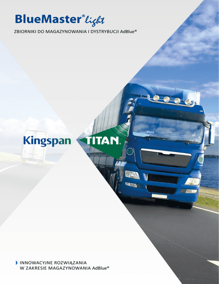 Zbiorniki do magazynowania i dystrybucji AdBlue® INNOWACYJNE ROZWIĄZANIA W ZAKRESIE MAGAZYNOWANIA AdBlue® Innowacyjne rozwiązania w zakresie magazynowania AdBlue® KINGSPAN TITAN Kompleksowa oferta jedno i dwupłaszczowych zbiorników do magazynowania i dystrybucji AdBlue® MOŻLIWE ZASTOSOWANIE BlueMaster® light znajduje zastosowanie w wielu sektorach m.in. transportowym, przemysłowym oraz rolniczym. Urządzenia BlueMaster® light to idealne rozwiązanie w zakresie bezpiecznego przechowywania i dystrybucji AdBlue®. BlueMaster® light przeznaczony jest dla firm posiadających w swojej flocie maszyny i pojazdy z systemem SCR (selektywna redukcja katalityczna), np. firmy transportowe, budowlane, centra dystrybucyjno-logistyczne, a także producentów rolnych. Zalety Prosta konstrukcja i niezawodność. Poziom cieczy w zbiornikach widoczny dzięki jednopłaszczowej konstrukcji. Łatwość serwisowania. Niska cena. Układ dystrybucyjny oparty na sprawdzonych pompach zatapialnych. Różnorodność dostępnych opcji. Różnorodność kształtów i pojemności aż do 9000 l. Dostępne pojemności i wymiary ZBIORNIKI JEDNOPŁASZCZOWE KOD PRODUKTU KOD PRODUKTU OBLB1000* Pojemność Długość Szerokość Wysokość 1000 l 1,95 m 0,62 m 1,23 m OBLB1300* Pojemność 1300 l Średnica 1,20 m Wysokość 1,40 m KOD PRODUKTU OBLB1500* Pojemność Długość Szerokość Wysokość 1500 l 2,10 m 0,75 m 1,40 m KOD PRODUKTU KOD PRODUKTU OBLB2500* Pojemność 2500 l Średnica 1,65 m Wysokość 1,50 m OBLB3500* Pojemność 3500 l Średnica 1,90 m Wysokość 1,80 m KOD PRODUKTU OBLB5000* Pojemność 5000 l Średnica 2,01 m Wysokość 2,30 m ZBIORNIKI DWUPŁASZCZOWE KOD PRODUKTU KOD PRODUKTU OBLB9000* Pojemność 9000 l Średnica 2,30 m Wysokość 2,85 m BBLB1200* Pojemność Długość Szerokość Wysokość 1200 l 1,90 m 1,24 m 1,79 m KOD PRODUKTU BBLB2500* Pojemność Długość Szerokość Wysokość 2500 l 2,46 m 1,46 m 1,85 m KOD PRODUKTU BBLB3500* Pojemność Długość Szerokość Wysokość 3500 l 2,85 m 2,20 m 1,96 m KOD PRODUKTU BBML4000* Pojemność Długość Szerokość Wysokość 4000 l 3,90 m 1,15 m 2,34 m KOD PRODUKTU BBLB5000* Pojemność Długość Szerokość Wysokość 5000 l 2,85 m 2,23 m 2,34 m * Ciąg dalszy kodu jest zależny od specyfikacji zbiornika. Gwarancja: na szczelność zbiornika jednopłaszczowego - 2 lata; zbiorników dwupłaszczowych - 10 lat; wyposażenie zbiorników - 2 lata. Gwarancja dotyczy wyrobu użytkowanego w sposób zgodny z instrukcją producenta. KOD PRODUKTU BBLB9000* Pojemność Długość Szerokość Wysokość 9000 l 3,28 m 2,48 m 2,95 m wyposażenie STANDARDOWE Zbiorników jednopłaszczowych wyposażenie STANDARDOWE Zbiorników dwupłaszczowych Zbiorniki jednopłaszczowe białe, półprzezroczyste. Zbiornik dwupłaszczowy (zbiornik zewnętrzny niebieski). Właz rewizyjny 8”. Zamykana na klucz obudowa dystrybutora. Właz rewizyjny 16” (od pojemności 3500 l). Właz rewizyjny 8” lub 16” (16’’ od pojemności 3500 l). Wentylacja. Wentylacja. Wlew 2” (u góry zbiornika). Wlew 2” (u góry zbiornika). Uproszczony układ dystrybucyjny zbudowany z pompy zatapialnej 230 V (przełącznik ON/OFF), manualnego nalewaka, 6 m przewodu dystrybucyjnego. Uproszczony układ dystrybucyjny zbudowany z pompy zatapialnej 230 V (przełącznik ON/OFF), manualnego nalewaka, 6 m przewodu dystrybucyjnego. Wskaźnik poziomu cieczy. Pływakowy dla zbiorników o pojemności 1300 i 2500 l, pneumatyczny dla pojemności od 3500 l. Wyposażenie opcjonalne Pojemność zbiornika [ l ] ZBIORNIKI JEDNOPŁASZCZOWE ZBIORNIKI DWUPŁASZCZOWE 1000 1300 1500 2500 3500 5000 9000 1200 2500 3500 4000 5000 9000 Przyłącze do napełniania u góry zbiornika z suchozłączem 2”. Linia napełniająca od góry zbiornika do poziomu roboczego z suchozłączem 2”. Przepływomierz cyfrowy przy nalewaku. Automatyczny nalewak. Zegarowy wskaźnik poziomu. Automatyczne ogrzewanie zbiornika (ogrzewanie nadmuchowe). Wentylator wyciągowy. Elektroniczny czujnik maksymalnego poziomu. Elektroniczny czujnik przecieku między płaszczami. Elektroniczny wskaźnik poziomu z sondą ciśnieniową. Zwijadło przewodu dystrybucyjnego 6 m. Izolacja termiczna zbiornika wewnętrznego. Elektryczna taśma grzewcza i izolacja termiczna zbiornika wewnętrznego. Właz rewizyjny. Przełącznik główny. Automatyczny nalewak. Czujnik poziomu. Przepływomierz cyfrowy. Pompa zatapialna. Dopuszcza się różnice w odcieniach produktów przedstawionych na ulotkach, wynikające ze specyfiki druku. Specyfikacje produktów mogą nieznacznie ulec zmianie, w celu uzyskania aktualnej opcji wyposażenia produktu, prosimy o kontakt z biurem Kingspan Environmental lub najbliższym dystrybutorem. Kingspan Environmental Sp. z o.o. | ul. Topolowa 5 | 62-090 Rokietnica | Polska Tel.: +48 61 814 44 00 | Fax: +48 61 814 54 99 | [email protected] | www.environmental.kingspan.com 08-2013 Dystrybutor: