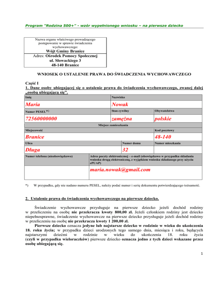 Program "Rodzina 500+" - wzór wypełnionego wniosku – na pierwsze dziecko Nazwa organu właściwego prowadzącego postępowanie w sprawie świadczenia wychowawczego: Wójt Gminy Branice Adres: Ośrodek Pomocy Społecznej ul. Słowackiego 3 48-140 Branice WNIOSEK O USTALENIE PRAWA DO ŚWIADCZENIA WYCHOWAWCZEGO Część I 1. Dane osoby ubiegającej się o ustalenie prawa do świadczenia wychowawczego, zwanej dalej „osobą ubiegającą się”. Imię Nazwisko Maria Nowak Numer PESEL*) Stan cywilny Obywatelstwo 72560000000 zamężna polskie Miejsce zamieszkania Miejscowość Kod pocztowy Branice 48-140 Ulica Numer domu Długa 32 Numer telefonu (nieobowiązkowo) Numer mieszkania Adres poczty elektronicznej – e-mail (obowiązkowo w przypadku składania wniosku drogą elektroniczną, z wyjątkiem wniosku składanego przy użyciu ePUAP) [email protected] *) W przypadku, gdy nie nadano numeru PESEL, należy podać numer i serię dokumentu potwierdzającego tożsamość. 2. Ustalenie prawa do świadczenia wychowawczego na pierwsze dziecko. Świadczenie wychowawcze przysługuje na pierwsze dziecko jeżeli dochód rodziny w przeliczeniu na osobę nie przekracza kwoty 800,00 zł. Jeżeli członkiem rodziny jest dziecko niepełnosprawne, świadczenie wychowawcze na pierwsze dziecko przysługuje jeżeli dochód rodziny w przeliczeniu na osobę nie przekracza kwoty 1 200,00 zł. Pierwsze dziecko oznacza jedyne lub najstarsze dziecko w rodzinie w wieku do ukończenia 18. roku życia; w przypadku dzieci urodzonych tego samego dnia, miesiąca i roku, będących najstarszymi dziećmi w rodzinie w wieku do ukończenia 18. roku życia (czyli w przypadku wieloraczków) pierwsze dziecko oznacza jedno z tych dzieci wskazane przez osobę ubiegającą się. 1 Program "Rodzina 500+" - wzór wypełnionego wniosku – na pierwsze dziecko Niepełnosprawne dziecko oznacza dziecko legitymujące się orzeczeniem o niepełnosprawności określonym w przepisach o rehabilitacji zawodowej i społecznej oraz zatrudnianiu osób niepełnosprawnych albo orzeczeniem o umiarkowanym lub znacznym stopniu niepełnosprawności. Wnoszę o ustalenie prawa do świadczenia wychowawczego na pierwsze dziecko zamieszkujące ze mną oraz pozostające na moim utrzymaniu(w przypadku zaznaczenia – wypełnić tabelę A oraz tabelę B w przypadku ubiegania się o świadczenie wychowawcze również na kolejne dzieci). □ Nie wnoszę o ustalenie prawa do świadczenia wychowawczego na pierwsze dziecko zamieszkujące ze mną oraz pozostające na moim utrzymaniu (w przypadku zaznaczenia – wypełnić tabelę B). A. Pierwsze dziecko. Imię Nazwisko Patrycja Numer PESEL*) 01102000000 Płeć kobieta □ mężczyzna Nowak Stan cywilny panna Obywatelstwo polskie Data urodzenia (dd-mm-rrrr) 20.10.2001 *) W przypadku, gdy nie nadano numeru PESEL, należy podać numer i serię dokumentu potwierdzającego tożsamość. Osoba ubiegająca się o świadczenie wychowawcze na pierwsze dziecko dołącza do wniosku odpowiednie załączniki (oświadczenia) dotyczące osiągniętych dochodów wypełnione przez członków rodziny. 3. Ustalenie prawa do świadczenia wychowawczego na kolejne dziecko/dzieci w wieku poniżej 18. roku życia, inne niż pierwsze dziecko. Wnoszę o ustalenie prawa do świadczenia wychowawczego na następujące dzieci/dziecko zamieszkujące ze mną oraz pozostające na moim utrzymaniu(świadczenie wychowawcze na drugie i kolejne dziecko przysługuje do dnia ukończenia przez dziecko 18. roku życia i przysługuje niezależnie od osiągniętego dochodu): B. Kolejne dziecko/dzieci (poniższa lista nie obejmuje pierwszego dziecka). 2 Program "Rodzina 500+" - wzór wypełnionego wniosku – na pierwsze dziecko 1. Imię Nazwisko Marek 03021500000 2. Stan cywilny kawaler Imię mężczyzna Obywatelstwo polskie 04061200000 15.02.2003 Stan cywilny panna Imię Płeć kobieta □ mężczyzna Nowak Numer PESEL*) Data urodzenia (dd-mm-rrrr) Nazwisko Bożena 3. □ kobieta Nowak Numer PESEL*) Płeć Obywatelstwo polskie Nazwisko Data urodzenia (dd-mm-rrrr) 12.06.2004 Płeć □ kobieta □ mężczyzna Numer PESEL*) 4. Stan cywilny Imię Obywatelstwo Nazwisko Data urodzenia (dd-mm-rrrr) Płeć □ kobieta □ mężczyzna Numer PESEL*) 5. Stan cywilny Imię Obywatelstwo Nazwisko Data urodzenia (dd-mm-rrrr) Płeć □ kobieta □ mężczyzna Numer PESEL*) Stan cywilny Obywatelstwo Data urodzenia (dd-mm-rrrr) *) W przypadku, gdy nie nadano numeru PESEL, należy podać numer i serię dokumentu potwierdzającego tożsamość. 4. Dane członków rodziny Rodzina oznacza odpowiednio: małżonków, rodziców dzieci, opiekuna faktycznego dziecka(opiekun faktyczny dziecka to osoba faktycznie opiekującą się dzieckiem, jeżeli wystąpiła z wnioskiem do sądu opiekuńczego o przysposobienie dziecka) oraz zamieszkujące wspólnie z tymi osobami, pozostające na ich utrzymaniu dzieci w wieku do ukończenia 25. roku życia, a także 3 Program "Rodzina 500+" - wzór wypełnionego wniosku – na pierwsze dziecko dzieci, które ukończyły 25. rok życia, legitymujące się orzeczeniem o znacznym stopniu niepełnosprawności, jeżeli w związku z tą niepełnosprawnością przysługuje świadczenie pielęgnacyjne lub specjalny zasiłek opiekuńczy albo zasiłek dla opiekuna, o którym mowa w ustawie z dnia 4 kwietnia 2014 r. o ustaleniu i wypłacie zasiłków dla opiekunów (Dz. U. z 2016 r. poz. 162). Do członków rodziny nie zalicza się dziecka pozostającego pod opieką opiekuna prawnego, dziecka pozostającego w związku małżeńskim, a także pełnoletniego dziecka posiadającego własne dziecko. W przypadku gdy dziecko, zgodnie z orzeczeniem sądu, jest pod opieką naprzemienną obydwojga rodziców rozwiedzionych, żyjących w separacji lub żyjących w rozłączeniu, dziecko zalicza się jednocześnie do członków rodzin obydwojga rodziców. Osoba samotnie wychowująca dziecko (oznacza to pannę, kawalera, wdowę, wdowca, osobę pozostającą w separacji
