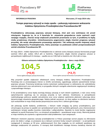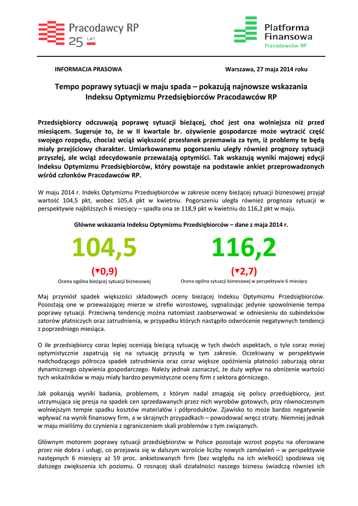 INFORMACJA PRASOWA Warszawa, 27 maja 2014 roku Tempo poprawy sytuacji w maju spada – pokazują najnowsze wskazania Indeksu Optymizmu Przedsiębiorców Pracodawców RP Przedsiębiorcy odczuwają poprawę sytuacji bieżącej, choć jest ona wolniejsza niż przed miesiącem. Sugeruje to, że w II kwartale br. ożywienie gospodarcze może wytracić część swojego rozpędu, chociaż wciąż większość przesłanek przemawia za tym, iż problemy te będą miały przejściowy charakter. Umiarkowanemu pogorszeniu uległy również prognozy sytuacji przyszłej, ale wciąż zdecydowanie przeważają optymiści. Tak wskazują wyniki majowej edycji Indeksu Optymizmu Przedsiębiorców, który powstaje na podstawie ankiet przeprowadzonych wśród członków Pracodawców RP. W maju 2014 r. Indeks Optymizmu Przedsiębiorców w zakresie oceny bieżącej sytuacji biznesowej przyjął wartość 104,5 pkt, wobec 105,4 pkt w kwietniu. Pogorszeniu uległa również prognoza sytuacji w perspektywie najbliższych 6 miesięcy – spadła ona ze 118,9 pkt w kwietniu do 116,2 pkt w maju. Główne wskazania Indeksu Optymizmu Przedsiębiorców – dane z maja 2014 r. 104,5 116,2 (▾0,9) (▾2,7) Ocena ogólna bieżącej sytuacji biznesowej Ocena ogólna sytuacji biznesowej w perspektywie 6 miesięcy Maj przyniósł spadek większości składowych oceny bieżącej Indeksu Optymizmu Przedsiębiorców. Pozostają one w przeważającej mierze w strefie wzrostowej, sygnalizując jedynie spowolnienie tempa poprawy sytuacji. Przeciwną tendencję można natomiast zaobserwować w odniesieniu do subindeksów zatorów płatniczych oraz zatrudnienia, w przypadku których nastąpiło odwrócenie negatywnych tendencji z poprzedniego miesiąca. O ile przedsiębiorcy coraz lepiej oceniają bieżącą sytuację w tych dwóch aspektach, o tyle coraz mniej optymistycznie zapatrują się na sytuację przyszłą w tym zakresie. Oczekiwany w perspektywie nadchodzącego półrocza spadek zatrudnienia oraz coraz większe opóźnienia płatności zaburzają obraz dynamicznego ożywienia gospodarczego. Należy jednak zaznaczyć, że duży wpływ na obniżenie wartości tych wskaźników w maju miały bardzo pesymistyczne oceny firm z sektora górniczego. Jak pokazują wyniki badania, problemem, z którym nadal zmagają się polscy przedsiębiorcy, jest utrzymująca się presja na spadek cen sprzedawanych przez nich wyrobów gotowych, przy równoczesnym wolniejszym tempie spadku kosztów materiałów i półproduktów. Zjawisko to może bardzo negatywnie wpływać na wynik finansowy firm, a w skrajnych przypadkach – powodować wręcz straty. Niemniej jednak w maju mieliśmy do czynienia z ograniczeniem skali problemów z tym związanych. Głównym motorem poprawy sytuacji przedsiębiorstw w Polsce pozostaje wzrost popytu na oferowane przez nie dobra i usługi, co przejawia się w dalszym wzroście liczby nowych zamówień – w perspektywie następnych 6 miesięcy aż 59 proc. ankietowanych firm (bez względu na ich wielkość) spodziewa się dalszego zwiększenia ich poziomu. O rosnącej skali działalności naszego biznesu świadczą również ich rozszerzająca się aktywność zakupowa oraz szybko malejący stan zapasów. Coraz bardziej realna konieczność uzupełniania magazynów będzie dodatkowo stymulowała wzrost polskiej gospodarki w kolejnych kwartałach. Optymistycznym sygnałem jest również to, że – chociaż spadła ocena ogólna przyszłej sytuacji biznesowej – plany inwestycyjne polskich przedsiębiorców stają się coraz bardziej ambitne. Podsumowanie oceny sytuacji bieżącej Wskaźnik Wartość z maja 2014 Sygnalizowana zmiana 104,5 113,2 103,9 80,9 87,8 93,1 92,5 109,6 Ocena ogólna Nowe zamówienia Aktywność zakupowa Stan zapasów Opóźnienia płatności Ceny kupna Ceny sprzedaży Zatrudnienie Wolniejsza poprawa Wolniejszy wzrost Wolniejszy wzrost Szybszy spadek Odwrócenie trendu, spadek Wolniejszy spadek Wolniejszy spadek Odwrócenie trendu, wzrost Podsumowanie oceny sytuacji przyszłej w perspektywie najbliższych 6 miesięcy Wskaźnik Wartość z maja 2014 Sygnalizowana zmiana Ocena ogólna Nowe zamówienia Aktywność zakupowa Stan zapasów Opóźnienia płatności Ceny kupna Ceny sprzedaży Zatrudnienie Inwestycje 116,2 137,7 121,9 80,3 112,0 112,7 90,4 83,4 130,2 Wolniejsza poprawa Wolniejszy wzrost Szybszy wzrost Szybszy spadek Odwrócenie trendu, wzrost Szybszy wzrost Wolniejszy spadek Odwrócenie trendu, spadek Szybszy wzrost Indeks Optymizmu Przedsiębiorców Indeks Optymizmu Przedsiębiorców to cykliczne badanie, w którym członkowie Pracodawców RP (ok. 10 tys. firm zatrudniających ok. 5 mln osób) oceniają co miesiąc obecny klimat do prowadzenia interesów oraz prognozują koniunkturę dla biznesu w przyszłości. Organizacja wzorowała się przy tym na niemieckim wskaźniku IFO. Gdy wynik Indeksu przyjmuje wartości poniżej 100 pkt, oznacza to pogarszanie się sytuacji biznesowej, a gdy przekracza 100 pkt – sygnalizuje poprawę (równe 100 pkt świadczy o braku zmian).
