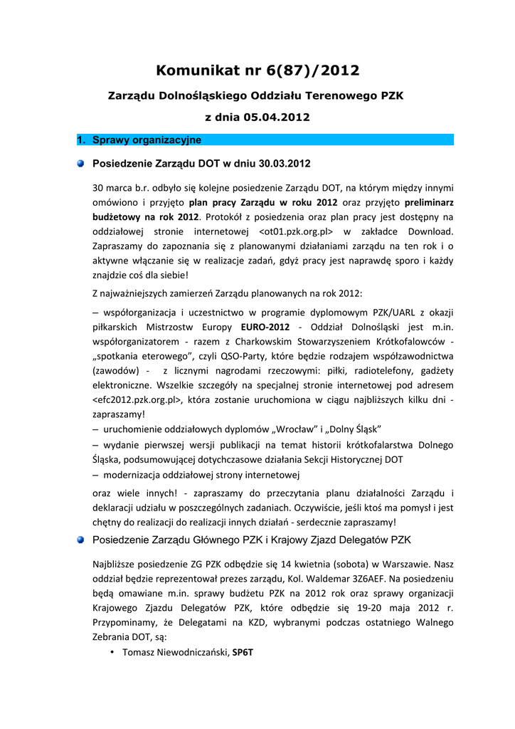 Komunikat nr 6(87)/2012 Zarządu Dolnośląskiego Oddziału Terenowego PZK z dnia 05.04.2012 1. Sprawy organizacyjne Posiedzenie Zarządu DOT w dniu 30.03.2012 30 marca b.r. odbyło się kolejne posiedzenie Zarządu DOT, na którym między innymi omówiono i przyjęto plan pracy Zarządu w roku 2012 oraz przyjęto preliminarz budżetowy na rok 2012. Protokół z posiedzenia oraz plan pracy jest dostępny na oddziałowej stronie internetowej <ot01.pzk.org.pl> w zakładce Download. Zapraszamy do zapoznania się z planowanymi działaniami zarządu na ten rok i o aktywne włączanie się w realizacje zadań, gdyż pracy jest naprawdę sporo i każdy znajdzie coś dla siebie! Z najważniejszych zamierzeń Zarządu planowanych na rok 2012: – współorganizacja i uczestnictwo w programie dyplomowym PZK/UARL z okazji piłkarskich Mistrzostw Europy EURO-2012 - Oddział Dolnośląski jest m.in. współorganizatorem - razem z Charkowskim Stowarzyszeniem Krótkofalowców „spotkania eterowego”, czyli QSO-Party, które będzie rodzajem współzawodnictwa (zawodów) - z licznymi nagrodami rzeczowymi: piłki, radiotelefony, gadżety elektroniczne. Wszelkie szczegóły na specjalnej stronie internetowej pod adresem <efc2012.pzk.org.pl>, która zostanie uruchomiona w ciągu najbliższych kilku dni zapraszamy! – uruchomienie oddziałowych dyplomów „Wrocław” i „Dolny Śląsk” – wydanie pierwszej wersji publikacji na temat historii krótkofalarstwa Dolnego Śląska, podsumowującej dotychczasowe działania Sekcji Historycznej DOT – modernizacja oddziałowej strony internetowej oraz wiele innych! - zapraszamy do przeczytania planu działalności Zarządu i deklaracji udziału w poszczególnych zadaniach. Oczywiście, jeśli ktoś ma pomysł i jest chętny do realizacji do realizacji innych działań - serdecznie zapraszamy! Posiedzenie Zarządu Głównego PZK i Krajowy Zjazd Delegatów PZK Najbliższe posiedzenie ZG PZK odbędzie się 14 kwietnia (sobota) w Warszawie. Nasz oddział będzie reprezentował prezes zarządu, Kol. Waldemar 3Z6AEF. Na posiedzeniu będą omawiane m.in. sprawy budżetu PZK na 2012 rok oraz sprawy organizacji Krajowego Zjazdu Delegatów PZK, które odbędzie się 19-20 maja 2012 r. Przypominamy, że Delegatami na KZD, wybranymi podczas ostatniego Walnego Zebrania DOT, są: • Tomasz Niewodniczański, SP6T • Waldemar Sznajder, 3Z6AEF • Zbigniew Chrzanowski, SP6CZ • Krzysztof Adamczyk, SP6JIU Prosimy o zgłaszanie wszelkich postulatów, uwag, propozycji tematów, którymi powinien zająć się Zjazd - bezpośrednio do naszych Delegatów. 2. Spotkanie Techniczne DOT - „JANIKÓW-2012” Na ostatnim posiedzeniu Zarządu DOT oficjalnie zatwierdzono plan Spotkania Technicznego DOT JANIKÓW-2012, które odbędzie się 15 kwietnia (niedziela) od godz. 09:00 w Janikowie k/Bystrzycy. Miejscem spotkania jest świetlica wiejska w Janikowie, a bezpośrednim organizatorem i gospodarzem będzie klub SP6PYP. W czasie spotkania przewidziane są: – prelekcja na temat tunerów antenowych (ręcznych i automatycznych) z pokazem praktycznych konstrukcji home-made skrzynek antenowych i przykładami ich zastosowania, – pokaz nowoczesnych technik cyfrowych używanych w codziennej praktyce krótkofalarskiej, na przykładzie urządzeń - zarówno fabrycznych, jak i amatorskich - z wbudowanymi funkcjami APRS, GPS oraz łączności DV (Digital Voice). Przedstawione zostaną również popularne radiotelefony FM na pasma 2,m i 70cm, których cena i dostępność są ostatnio bezkonkurencyjne! – wystawa konstrukcji amatorskich, w tym odbiorników, wzmacniaczy mocy (PA), urządzeń pomocniczych oraz mini-wystawa kluczy telegraficznych (kilkadziesiąt eksponatów!) – konkurs techniczny (quiz) dla wszystkich chętnych z atrakcyjnymi nagrodami rzeczowymi To tylko niektóre z atrakcji - pełny program Spotkania zostanie ostatecznie ustalony tuż po Świętach - czekamy jeszcze na deklaracje sponsorów. Dodajmy tylko, że Koło Gospodyń z Janikowa przygotowuje pyszne potrawy - menu jest tajemnicą, ale zapewniamy, że warto! Oczywiście każdemu (pełnoletniemu!) uczestnikowi spotkania „przysługuje” co najmniej kufel dobrego lokalnego piwa! Zapraszamy do Janikowa! 15 kwietnia 2012 roku, czyli tydzień po Świętach i zawodach SPDX Contest! 3. Sprawy techniczne Stare i nowe przemienniki Proces uzyskiwania pozwoleń radiowych na stacje bezobsługowe uległ ostatnio wydłużeniu - głównie z powodu zmiany zasad koordynacji częstotliwości - do ubiegłego roku robił to społecznie Kol. Zdzisław SP6LB, a od jakiegoś czasu, według nowych zasad i ustaleń, teraz zajmuje się tym bezpośrednio Urząd Komunikacji Elektronicznej (a dokładnie Departament Zarządzania Częstotliwościami w Warszawie). Bezpośrednią konsekwencja jest wydłużony czas oczekiwania na wydanie pozwoleń radiowych dla stacji bezobsługowych. W tej chwili czekamy na wydanie pozwoleń dla przemienników cyfrowych w Bolesławcu i Bogatyni, które od lat działają na ustalonych częstotliwościach, a teraz mają być na nowo „koordynowane”... Uczulamy wszystkich użytkowników przemienników (stacji bezobsugowych) na tą sytuację i prosimy o odpowiednio wcześniejsze występowanie z wnioskami o pozwolenia radiowe do Urzędu Komunikacji Elektronicznej, żeby nie być zmuszonym do wyłączenia urządzeń... Pierwszy przemiennik DV (Digital Voice) we Wrocławiu? Z radością informujemy, ze być może już niebawem (może jeszcze przed EURO2012 ?) zostanie uruchomiony we Wrocławiu pierwszy przemiennik cyfrowy pracujący w trybie DV (Digital Voice). Odpowiedni wniosek został już złożony w UKE, są też przygotowane urządzenia... Życzymy Kolegom zajmującym się tym tematem jak najszybszego uruchomienia i deklarujemy - jako Zarząd - wszelką pomoc! 4. Sprawy sportowe SPDX Contest Przypominamy wszystkim, którzy nie uczestniczą zwykle w zawodach, że w najbliższy (świąteczny) weekend odbywają si