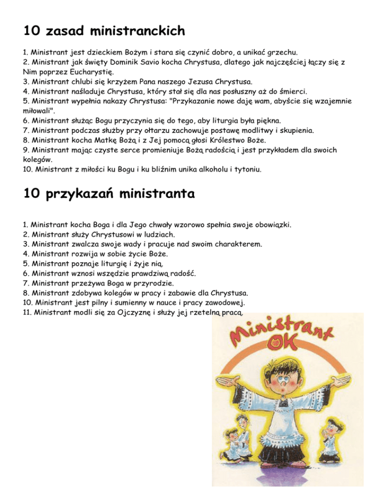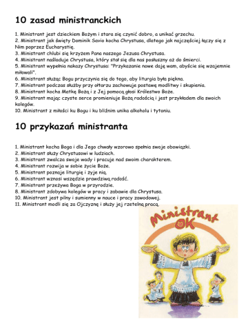 10 zasad ministranckich 1. Ministrant jest dzieckiem Bożym i stara się czynić dobro, a unikać grzechu. 2. Ministrant jak święty Dominik Savio kocha Chrystusa, dlatego jak najczęściej łączy się z Nim poprzez Eucharystię. 3. Ministrant chlubi się krzyżem Pana naszego Jezusa Chrystusa. 4. Ministrant naśladuje Chrystusa, który stał się dla nas posłuszny aż do śmierci. 5. Ministrant wypełnia nakazy Chrystusa: "Przykazanie nowe daję wam, abyście się wzajemnie miłowali". 6. Ministrant służąc Bogu przyczynia się do tego, aby liturgia była piękna. 7. Ministrant podczas służby przy ołtarzu zachowuje postawę modlitwy i skupienia. 8. Ministrant kocha Matkę Bożą i z Jej pomocą głosi Królestwo Boże. 9. Ministrant mając czyste serce promieniuje Bożą radością i jest przykładem dla swoich kolegów. 10. Ministrant z miłości ku Bogu i ku bliźnim unika alkoholu i tytoniu. 10 przykazań ministranta 1. Ministrant kocha Boga i dla Jego chwały wzorowo spełnia swoje obowiązki. 2. Ministrant służy Chrystusowi w ludziach. 3. Ministrant zwalcza swoje wady i pracuje nad swoim charakterem. 4. Ministrant rozwija w sobie życie Boże. 5. Ministrant poznaje liturgię i żyje nią. 6. Ministrant wznosi wszędzie prawdziwą radość. 7. Ministrant przeżywa Boga w przyrodzie. 8. Ministrant zdobywa kolegów w pracy i zabawie dla Chrystusa. 10. Ministrant jest pilny i sumienny w nauce i pracy zawodowej. 11. Ministrant modli się za Ojczyznę i służy jej rzetelną pracą.