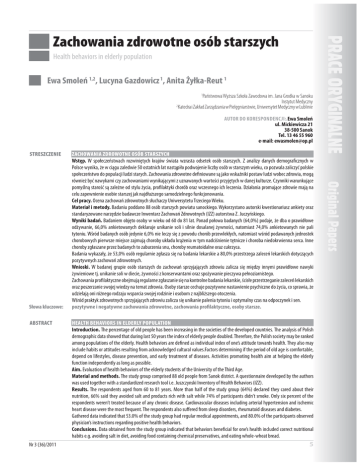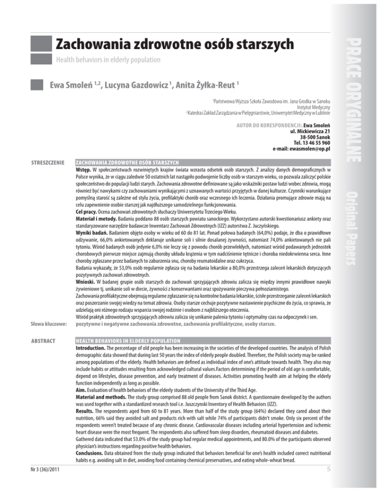 Zachowania zdrowotne osób starszych Health behaviors in elderly population Ewa Smoleń 1,2, Lucyna Gazdowicz 1, Anita Żyłka-Reut 1 1 Państwowa Wyższa Szkoła Zawodowa im. Jana Grodka w Sanoku Instytut Medyczny 2 Katedra i Zakład Zarządzania w Pielęgniarstwie, Uniwersytet Medyczny w Lublinie AUTOR DO KORESPONDENCJI:.Ewa Smoleń ul. Mickiewicza 21 38-500 Sanok Tel. 13 46 55 960 e-mail: [email protected] STRESZCZENIE Słowa kluczowe: ABSTRACT Nr 3 (36)/2011 ZACHOWANIA ZDROWOTNE OSÓB STARSZYCH Wstęp. W społeczeństwach rozwiniętych krajów świata wzrasta odsetek osób starszych. Z analizy danych demograficznych w Polsce wynika, że w ciągu zaledwie 50 ostatnich lat nastąpiło podwojenie liczby osób w starszym wieku, co pozwala zaliczyć polskie społeczeństwo do populacji ludzi starych. Zachowania zdrowotne definiowane są jako wskaźniki postaw ludzi wobec zdrowia, mogą również być nawykami czy zachowaniami wynikającymi z uznawanych wartości przyjętych w danej kulturze. Czynniki warunkujące pomyślną starość są zależne od stylu życia, profilaktyki chorób oraz wczesnego ich leczenia. Działania promujące zdrowie mają na celu zapewnienie osobie starszej jak najdłuższego samodzielnego funkcjonowania. Cel pracy. Ocena zachowań zdrowotnych słuchaczy Uniwersytetu Trzeciego Wieku. Materiał i metody. Badaniu poddano 88 osób starszych powiatu sanockiego. Wykorzystano autorski kwestionariusz ankiety oraz standaryzowane narzędzie badawcze Inwentarz Zachowań Zdrowotnych (IZZ) autorstwa Z. Juczyńskiego. Wyniki badań. Badaniem objęto osoby w wieku od 60 do 81 lat. Ponad połowa badanych (64,0%) podaje, że dba o prawidłowe odżywanie, 66,0% ankietowanych deklaruje unikanie soli i silnie dosalanej żywności, natomiast 74,0% ankietowanych nie pali tytoniu. Wśród badanych osób jedynie 6,0% nie leczy się z powodu chorób przewlekłych, natomiast wśród podawanych jednostek chorobowych pierwsze miejsce zajmują choroby układu krążenia w tym nadciśnienie tętnicze i choroba niedokrwienna serca. Inne choroby zgłaszane przez badanych to zaburzenia snu, choroby reumatoidalne oraz cukrzyca. Badania wykazały, że 53,0% osób regularnie zgłasza się na badania lekarskie a 80,0% przestrzega zaleceń lekarskich dotyczących pozytywnych zachowań zdrowotnych. Wnioski. W badanej grupie osób starszych do zachowań sprzyjających zdrowiu zalicza się między innymi prawidłowe nawyki żywieniowe tj. unikanie soli w diecie, żywności z konserwantami oraz spożywanie pieczywa pełnoziarnistego. Zachowania profilaktyczne obejmują regularne zgłaszanie się na kontrolne badania lekarskie, ścisłe przestrzeganie zaleceń lekarskich oraz poszerzanie swojej wiedzy na temat zdrowia. Osoby starsze cechuje pozytywne nastawienie psychiczne do życia, co sprawia, że udzielają oni różnego rodzaju wsparcia swojej rodzinie i osobom z najbliższego otoczenia. Wśród praktyk zdrowotnych sprzyjających zdrowiu zalicza się unikanie palenia tytoniu i optymalny czas na odpoczynek i sen. pozytywne i negatywne zachowania zdrowotne, zachowania profilaktyczne, osoby starsze. HEALTH BEHAVIORS IN ELDERLY POPULATION Introduction. The percentage of old people has been increasing in the societies of the developed countries. The analysis of Polish demographic data showed that during last 50 years the index of elderly people doubled. Therefore, the Polish society may be ranked among populations of the elderly. Health behaviors are defined as individual index of one’s attitude towards health. They also may include habits or attitudes resulting from acknowledged cultural values.Factors determining if the period of old age is comfortable, depend on lifestyles, disease prevention, and early treatment of diseases. Activities promoting health aim at helping the elderly function independently as long as possible. Aim. Evaluation of health behaviors of the elderly students of the University of the Third Age. Material and methods. The study group comprised 88 old people from Sanok district. A questionnaire developed by the authors was used together with a standardized research tool i.e. Juszczynski Inventory of Health Behaviors (IZZ). Results. The respondents aged from 60 to 81 years. More than half of the study group (64%) declared they cared about their nutrition, 66% said they avoided salt and products rich with salt while 74% of participants didn’t smoke. Only six percent of the respondents weren’t treated because of any chronic disease. Cardiovascular diseases including arterial hypertension and ischemic heart disease were the most frequent. The respondents also suffered from sleep disorders, rheumatoid diseases and diabetes. Gathered data indicated that 53.0% of the study group had regular medical appointments, and 80.0% of the participants observed physician’s instructions regarding positive health behaviors. Conclusions. Data obtained from the study group indicated that behaviors beneficial for one’s health included correct nutritional habits e.g. avoiding salt in diet, avoiding food containing chemical preservatives, and eating whole-wheat bread. 5 Zachowania zdrowotne osób starszych Key words: WSTĘP Preventive behaviors included regular medical appointments, observing physician’s instructions, and constant education about health. The elderly had positive mental attitude toward their lives. As a result they supported their families and close friends in many ways, not only financially. Health practical attitudes beneficial for one’s health included avoiding smoking and having optimal time for rest and sleep. positive and negative health behaviors, preventive behaviors, elderly people Zdrowie jednostki uwarunkowane jest w głównej mierze indywidualnymi zachowaniami zdrowotnymi człowieka, pozwalającymi go utrzymywać, przywracać i potęgować. Dokonywanie wyborów określonych zachowań, uzależnione jest od pozycji, jaką w indywidualnym systemie wartości zajmuje zdr