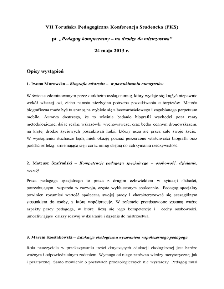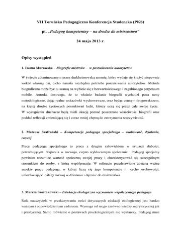VII Toruńska Pedagogiczna Konferencja Studencka (PKS) pt. „Pedagog kompetentny – na drodze do mistrzostwa” 24 maja 2013 r. Opisy wystąpień 1. Iwona Murawska – Biografie mistrzów – w poszukiwaniu autorytetów W świecie zdominowanym przez durkheimowską anomię, który wydaje się krążyć niepewnie wokół własnej osi, cicho narasta niezbędna potrzeba poszukiwania autorytetów. Metoda biograficzna może być tu szansą na wybicie się z bezwartościowego i zagubionego perpetuum mobile. Autorka dostrzega, że to właśnie badanie biografii wychodzi poza ramy metodologiczne, dając realne wskazówki wychowawcze, oraz będąc cennym drogowskazem, na krętej drodze życiowych poszukiwań ludzi, którzy uczą się przez całe swoje życie. W wystąpieniu słuchacze będą mieli okazję poznać poszerzone właściwości biografii oraz poddać refleksji zmieniającą się i coraz mniej chętną do zatrzymania rzeczywistość. 2. Mateusz Szafrański – Kompetencje pedagoga specjalnego – osobowość, działanie, rozwój Praca pedagoga specjalnego to praca z drugim człowiekiem w sytuacji słabości, potrzebującym wsparcia w rozwoju, często wykluczonym społecznie. Pedagog specjalny powinien rozumieć wartość społeczną swojej pracy i charakteryzować się szczególnym stosunkiem do osoby, z którą współpracuje. W referacie przedstawione zostaną ważne aspekty pracy pedagoga, w której liczą się jego kompetencje i cechy osobowości, umożliwiające dalszy rozwój w działaniu i dążenie do mistrzostwa. 3. Marcin Szostakowski – Edukacja ekologiczna wyzwaniem współczesnego pedagoga Rola nauczyciela w przekazywaniu treści dotyczących edukacji ekologicznej jest bardzo ważnym i odpowiedzialnym zadaniem. Wymaga od niego zarówno wiedzy merytorycznej jak i praktycznej. Samo mówienie o postawach proekologicznych nie wystarczy. Pedagog musi być autentycznie zaangażowany, swoim przykładem pokazywać jak należy dbać o środowisko, musi również być pomysłowy aby zachęcić uczniów i przekonać ich, że ekologia nie jest nudna. Gdy te warunki zostaną spełnione będzie możliwy efektywny edukacyjny skutkujący wytworzeniem postaw proeokologicnych. proces W referacie zostanie przedstawiona problematyka edukacji ekologicznej, jaka prowadzona jest w szkole w ramach programów nauczania oraz zajęć pozalekcyjnych. Zostanie również omówiony wpływ współczesnego pedagoga na kształtowanie postaw proekologicznych młodzieży. Referujący przedstawi aktualne wyniki badań prowadzonych wśród uczniów szkoły gimnazjalnej dotyczące ich postaw proekologicznych. 4. Marta Stępniak – Podejście Skoncentrowane na Rozwiązaniach – nowe spojrzenie na udoskonalenie pracy pedagoga PSR jako metoda pracy stawiająca na mocne strony każdego człowieka, jest niezwykle pomocna w komunikacji i porozumiewaniu się w pracy pedagoga-terapeuty, a co ciekawe, można wykorzystywać ją na co dzień! Służy do wydobywania z człowieka jego zasobów, wzmacniania, odkrywania potencjału. Tym bardziej jest niezbędna, ponieważ każda osoba, której pomagamy, jest ekspertem od swojego życia i to ona wie najlepiej czego potrzebuje. Pedagog, jako animator mocnych stron, ma za zadanie pomóc je odkryć, wzmocnić, ale przede wszystkim - zauważyć. 5. Paulina Pamuła – Społeczeństwo multikulturowe wyzwaniem dla pedagoga (o znaczeniu kompetencji międzykulturowych) Społeczeństwo, w którym żyjemy jest zróżnicowane pod względem kulturowym. Kontakty międzykulturowe mogą stać się źródłem zarówno nieporozumień, niepokoju, jak i fascynacji. Przed pedagogiem stoi zadanie przygotowania młodego pokolenia do czerpania z bogactwa odmienności, uczenia tolerancji i otwartości na drugiego człowieka i swobody w nawiązywaniu dialogu z przedstawicielami innych kultur. Aby sprostać wymaganiom współczesności nie wystarczy znajomość języków obcych. Referentka w swoim wystąpieniu przybliży zagadnienie kompetencji, które pozwalają lepiej wykorzystywać możliwości i potencjał kontaktów międzykulturowych, oznaczają otwartość na to, co nowe, chęć uczenia się i poznawania kultur. Przedstawi również, w jaki sposób możemy rozwijać tę kluczową kompetencję. 6. Alicja Kamyszek, Sylwia Krzewińska – Kynoterapia w pracy pedagoga Pies towarzyszy i pomaga człowiekowi od wieków, może być dla niego najlepszym przyjacielem. Często nie zdajemy sobie sprawy z tego, jak wiele ról to zwierzę pełni. Może być myśliwym, ale również niezastąpionym stróżem, najlepszym obrońcą. Ostatnio również zajmuje ważne miejsce u boku pedagogów oraz terapeutów. W jakim charakterze? Jako pomocnik terapeuty! W naszym referacie postaramy się przybliżyć: czym jest kynoterapia, jakie są jej standardy, w jaki sposób może być pomocna w edukacji, rehabilitacji, rewalidacji, resocjalizacji. Przedstawimy jak powinny przebiegać: spotkanie z psem (SP), edukacja z psem (EP) oraz terapia z psem (TP). Opisy warsztatów 1. Iwona Murawska – Emisja i higiena głosu w warsztacie pedagoga Głos jest podstawowym narzędziem pracy pedagoga, dlatego dbałość o niego wymaga należytej staranności. Odpowiednia emisja głosu umożliwia lepszy przekaz informacji oraz ułatwia kontakty, pozwala także wzbogacić warsztat pracy. Podczas zajęć uczestnicy dowiedzą się jak działa aparat mowy, poznają podstawowe zasady jego higieny, dowiedzą się też jak radzić sobie z artykulacją i łamaczami słów. Nauczą się także, jak wydajnie operować oddechem i prowadzić dźwięk. Poznawanie zasad emisji głosu, niezbędnej umiejętności w pracy pedagoga, jest istotnym krokiem dla rozwoju nauczyciela oraz jego wychowanków. 2. Wioleta Kobierska – Interaktywne cuda – palcem po tablicy Rozwój współczesnych technologii wymaga, także od pedagogów, nowych umiejętności i kompetencji. W swej pracy, obok tradycyjnych metod nauczania, mogą wykorzystywać nowoczesne techno