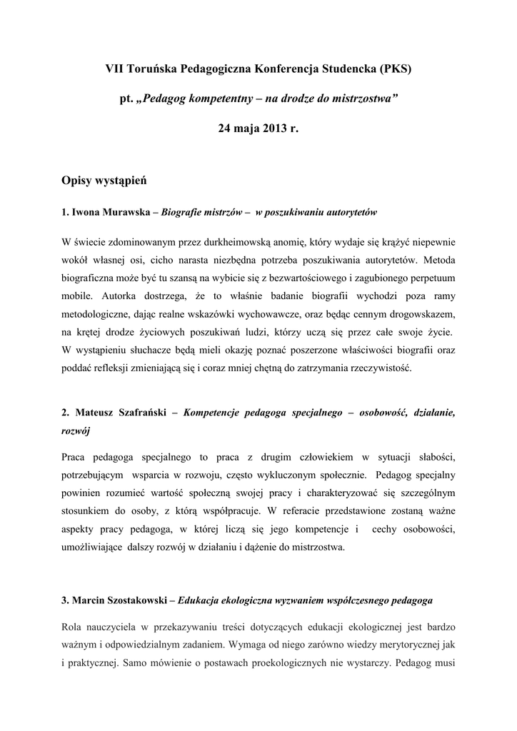 VII Toruńska Pedagogiczna Konferencja Studencka (PKS) pt