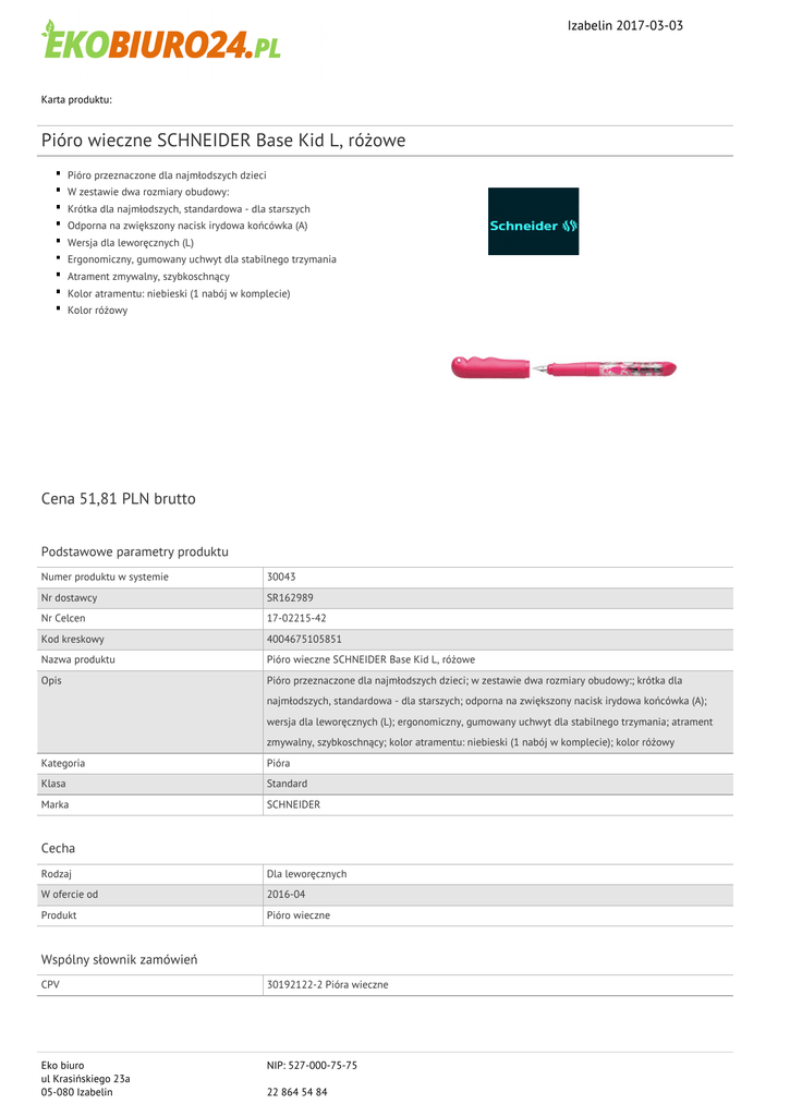 Izabelin 2017-03-03 Karta produktu: Pióro wieczne SCHNEIDER Base Kid L, różowe Pióro przeznaczone dla najmłodszych dzieci W zestawie dwa rozmiary obudowy: Krótka dla najmłodszych, standardowa - dla starszych Odporna na zwiększony nacisk irydowa końcówka (A) Wersja dla leworęcznych (L) Ergonomiczny, gumowany uchwyt dla stabilnego trzymania Atrament zmywalny, szybkoschnący Kolor atramentu: niebieski (1 nabój w komplecie) Kolor różowy Cena 51,81 PLN brutto Podstawowe parametry produktu Numer produktu w systemie 30043 Nr dostawcy SR162989 Nr Celcen 17-02215-42 Kod kreskowy 4004675105851 Nazwa produktu Pióro wieczne SCHNEIDER Base Kid L, różowe Opis Pióro przeznaczone dla najmłodszych dzieci; w zestawie dwa rozmiary obudowy:; krótka dla najmłodszych, standardowa - dla starszych; odporna na zwiększony nacisk irydowa końcówka (A); wersja dla leworęcznych (L); ergonomiczny, gumowany uchwyt dla stabilnego trzymania; atrament zmywalny, szybkoschnący; kolor atramentu: niebieski (1 nabój w komplecie); kolor różowy Kategoria Pióra Klasa Standard Marka SCHNEIDER Cecha Rodzaj Dla leworęcznych W ofercie od 2016-04 Produkt Pióro wieczne Wspólny słownik zamówień CPV 30192122-2 Pióra wieczne Eko biuro ul Krasińskiego 23a 05-080 Izabelin NIP: 527-000-75-75 22 864 54 84 Izabelin 2017-03-03 Karta katalogowa produktu cd. Pióro wieczne SCHNEIDER Base Kid L, różowe Certyfikaty Nowy produkt w ofercie Standard Hit Standard Kolor Kolor Różowy Serdecznie zapraszamy do współpracy Eko biuro zespół. Eko biuro ul Krasińskiego 23a 05-080 Izabelin NIP: 527-000-75-75 22 864 54 84
