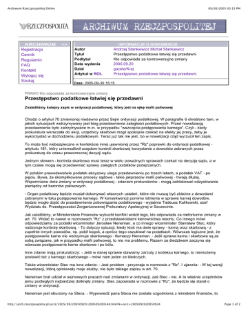 Archiwum Rzeczpospolitej Online Rejestracja Cennik Regulamin FAQ Kontakt Wyloguj się Szukaj 09/30/2005 03:15 PM Autor Tytuł Podtytuł Data wydania Dział Artykuł w ROL Andrzej Stankiewicz Michał Stankiewicz Przestępstwo podatkowe łatwiej się przedawni Kto odpowiada za kontrowersyjne zmiany 2005.09.20 gazeta/Kraj Przestępstwo podatkowe łatwiej się przedawni Czas: 2005-09-30 15:15 PRAWO Kto odpowiada za kontrowersyjne zmiany Przestępstwo podatkowe łatwiej się przedawni Znaleźliśmy kolejny zapis w ordynacji podatkowej, który jest na rękę mafii paliwowej Chodzi o artykuł 70 zmienionej niedawno przez Sejm ordynacji podatkowej. W paragrafie 6 określono tam, w jakich sytuacjach wstrzymywany jest bieg przedawnienia zaległości podatkowych. Przed nowelizacją przedawnienie było zatrzymywane m.in. w przypadku "wszczęcia postępowania karnego". Czyli - kiedy prokuratura wkraczała do akcji, urzędnicy skarbowi mogli spokojnie czekać na efekty jej pracy, żeby je wykorzystać w dochodzeniu podatkowym. Teraz już tak nie jest, bo w nowelizacji rząd wyrzucił ten zapis. To może być niebezpieczne w kontekście innej ujawnionej przez "Rz" poprawki do ordynacji podatkowej artykułu 181, który uniemożliwił urzędom kontroli skarbowej korzystanie z dowodów zebranych przez prokuraturę do czasu prawomocnej decyzji sądu. Jednym słowem - kontrola skarbowa musi teraz w wielu poważnych sprawach czekać na decyzję sądu, a w tym czasie mogą się przedawniać sprawy zaległych podatków podejrzanych. W polskim prawodawstwie podatek akcyzowy ulega przedawnieniu po trzech latach, a podatek VAT - po pięciu. Bywa, że skomplikowane procesy sądowe - takie jakprzeciw mafii paliwowej - trwają dłużej. Wspomniane dwie zmiany w ordynacji podatkowej - zdaniem prokuratorów - mogą zablokować odzyskiwanie pieniędzy od baronów paliwowych. - Organ podatkowy będzie musiał dokonywać własnych ustaleń, które nie muszą być zbieżne z dowodami zebranymi w toku postępowania karnego. W konsekwencji pomimo istnienia w sprawie karnej dowodów, będzie mogło dojść do przedawnienia zobowiązania podatkowego - wyjaśnia Tadeusz Kulikowski, szef Wydziału ds. Przestępczości Zorganizowanej Prokuratury Apelacyjnej w Szczecinie. Jak ustaliliśmy, w Ministerstwie Finansów wybuchł konflikt wokół tego, kto odpowiada za niefortunne zmiany w art. 70. Widać to nawet w rozmowach "Rz" z przedstawicielami kierownictwa resortu. Co innego mówi odpowiedzialny za podatki wiceminister Jarosław Neneman, a co innego wiceminister Stanisław Stec, który nadzoruje kontrolę skarbową. - To dotyczy sytuacji, kiedy ktoś ma dwie sprawy - karną oraz skarbową - z zupełnie innych powodów, np. pobił kogoś, a oprócz tego oszukiwał na podatkach. Wówczas logiczne jest, że postępowanie karne nie wstrzymuje skarbowego - tłumaczy Neneman. - Jeśli sprawa karna i skarbowa są ze sobą związane, jak w przypadku mafii paliwowej, to nie ma problemu. Razem ze śledztwem zaczyna się wówczas postępowanie karne skarbowe i po bólu. Inne zdanie mają prokuratorzy: - Jeśli w danej sprawie stawiamy zarzuty z kodeksu karnego, to niemożemy postawić też z karnego skarbowego - mówi nam jeden ze śledczych. Także wiceminister Stec ma inne zdanie: - Jest problem - przyznaje w rozmowie z "Rz". I ujawnia: - W tej wersji nowelizacji, którą opiniowały moje służby, nie było takiego zapisu w art. 70. Neneman brał udział w sejmowych pracach nad zmianami w ordynacji, zaś Stec - nie. A to właśnie urzędników jemu podległych najbardziej dotknęły zmiany. Stec zapowiada w rozmowie z "Rz", że będzie się starał o zmiany w ordynacji. Neneman jest oburzony na Steca. - Wypowiedź pana Steca nie została uzgodniona z ministrem finansów, to http://arch.rzeczpospolita.pl/a/rz/2005/09/20050920/200509200148.html?k=on;t=2005092020050924 Page 1 of 2 Archiwum Rzeczpospolitej Online 09/30/2005 03:15 PM jego prywatne zdanie - denerwuje się. I tłumaczy: - Taki zapis został przyjęty przez cały rząd. Wówczas nikt nie miał zastrzeżeń. Pytany przez "Rz" Neneman nie potrafi sobie przypomnieć, kto był inicjatorem zmian w art. 70. I dziwi się, że sprawdzamy paragraf po paragrafie ordynację podatkową - jedną z najważniejszych dla obywateli ustaw. Wcześniej - po dotarciu do nagrań z prac w Sejmie - ujawniliśmy, że zmiany w art. 181 w zadziwiających okolicznościach zaproponował gość jednego z posiedzeń podkomisji pracującej nad ustawą. Przedstawiciele rządu poparli tę propozycję, mimo że nie sprawdzili konsekwencji nowych zapisów. Na sali było ich siedmioro. To więcej niż posłów, których - jak wynika z nagrania - na początku posiedzenia było dwoje. ANDRZEJ STANKIEWICZ, MICHAŁ STANKIEWICZ http://arch.rzeczpospolita.pl/a/rz/2005/09/20050920/200509200148.html?k=on;t=2005092020050924 Page 2 of 2