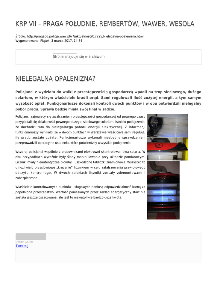 KRP VII – PRAGA POŁUDNIE, REMBERTÓW, WAWER, WESOŁA Źródło: http://pragapd.policja.waw.pl/r7/aktualnosci/17225,Nielegalna-opalenizna.html Wygenerowano: Piątek, 3 marca 2017, 14:34 Strona znajduje się w archiwum. NIELEGALNA OPALENIZNA? Policjanci z wydziału do walki z przestępczością gospodarczą wpadli na trop sieciowego, dużego solarium, w którym właściciele kradli prąd. Sami regulowali ilość zużytej energii, a tym samym wysokość opłat. Funkcjonariusze dokonali kontroli dwóch punktów i w obu potwierdzili nielegalny pobór prądu. Sprawa będzie miała swój finał w sądzie. Policjanci zajmujący się zwalczaniem przestępczości gospodarczej od pewnego czasu przyglądali się działalności pewnego dużego, sieciowego solarium. Istniało podejrzenie, że dochodzi tam do nielegalnego poboru energii elektrycznej. Z informacji funkcjonariuszy wynikało, że w dwóch punktach w Warszawie właściciele sami regulują, ile prądu zostało zużyte. Funkcjonariusze wykonali niezbędne sprawdzenia i przeprowadzili operacyjne ustalenia, które potwierdziły wszystkie podejrzenia. Wczoraj policjanci wspólnie z pracownikami elektrowni skontrolowali dwa solaria. W obu przypadkach wyraźnie były ślady manipulowania przy układzie pomiarowym. Liczniki miały nieautentyczne plomby i uszkodzone tabliczki znamionowe. Wszystko to umożliwiało przysłowiowe „kręcenie” licznikiem w celu zafałszowania prawidłowego odczytu kontrolnego. W dwóch solariach liczniki zostały zdemontowane i zabezpieczone. Właściciele kontrolowanych punktów usługowych poniosą odpowiedzialność karną za popełnione przestępstwo. Wartość poniesionych przez zakład energetyczny start nie została jeszcze oszacowana, ale jest to niewątpliwie bardzo duża kwota. Ocena: 0/5 (0) Tweetnij