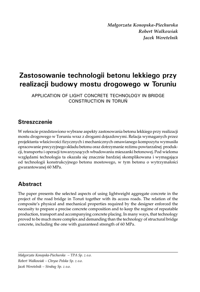 Małgorzata Konopska-Piechurska Robert Walkowiak Jacek Weretelnik Zastosowanie technologii betonu lekkiego przy realizacji budowy mostu drogowego w Toruniu APPLICATION OF LIGHT CONCRETE TECHNOLOGY IN BRIDGE CONSTRUCTION IN TORUŃ Streszczenie W referacie przedstawiono wybrane aspekty zastosowania betonu lekkiego przy realizacji mostu drogowego w Toruniu wraz z drogami dojazdowymi. Relacja wymaganych przez projektanta właściwości fizycznych i mechanicznych omawianego kompozytu wymusiła opracowanie precyzyjnego składu betonu oraz dotrzymanie reżimu powtarzalnej produkcji, transportu i operacji towarzyszących wbudowaniu mieszanki betonowej. Pod wieloma względami technologia ta okazała się znacznie bardziej skomplikowana i wymagająca od technologii konstrukcyjnego betonu mostowego, w tym betonu o wytrzymałości gwarantowanej 60 MPa. Abstract The paper presents the selected aspects of using lightweight aggregate concrete in the project of the road bridge in Toruń together with its access roads. The relation of the composite’s physical and mechanical properties required by the designer enforced the necessity to prepare a precise concrete composition and to keep the regime of repeatable production, transport and accompanying concrete placing. In many ways, that technology proved to be much more complex and demanding than the technology of structural bridge concrete, including the one with guaranteed strength of 60 MPa. Małgorzata Konopska-Piechurska – TPA Sp. z o.o. Robert Walkowiak – Chryso Polska Sp. z o.o. Jacek Weretelnik – Strabag Sp. z o.o.