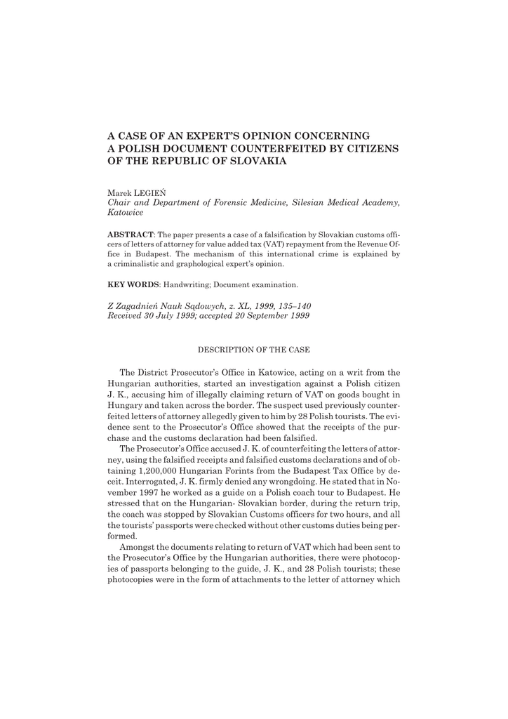 A CASE OF AN EXPERT’S OPINION CONCERNING A POLISH DOCUMENT COUNTERFEITED BY CITIZENS OF THE REPUBLIC OF SLOVAKIA Marek LEGIEÑ Chair and Department of Forensic Medicine, Silesian Medical Academy, Katowice ABSTRACT: The paper presents a case of a falsification by Slovakian customs officers of letters of attorney for value added tax (VAT) repayment from the Revenue Office in Budapest. The mechanism of this international crime is explained by a criminalistic and graphological expert’s opinion. KEY WORDS: Handwriting; Document examination. Z Zagadnieñ Nauk S¹dowych, z. XL, 1999, 135–140 Received 30 July 1999; accepted 20 September 1999 DESCRIPTION OF THE CASE The District Prosecutor’s Office in Katowice, acting on a writ from the Hungarian authorities, started an investigation against a Polish citizen J. K., accusing him of illegally claiming return of VAT on goods bought in Hungary and taken across the border. The suspect used previously counterfeited letters of attorney allegedly given to him by 28 Polish tourists. The evidence sent to the Prosecutor’s Office showed that the receipts of the purchase and the customs declaration had been falsified. The Prosecutor’s Office accused J. K. of counterfeiting the letters of attorney, using the falsified receipts and falsified customs declarations and of obtaining 1,200,000 Hungarian Forints from the Budapest Tax Office by deceit. Interrogated, J. K. firmly denied any wrongdoing. He stated that in November 1997 he worked as a guide on a Polish coach tour to Budapest. He stressed that on the Hungarian- Slovakian border, during the return trip, the coach was stopped by Slovakian Customs officers for two hours, and all the tourists’ passports were checked without other customs duties being performed. Amongst the documents relating to return of VAT which had been sent to the Prosecutor’s Office by the Hungarian authorities, there were photocopies of passports belonging to the guide, J. K., and 28 Polish tourists; these photocopies were in the form of attachments to the letter of attorney which 136 M. Legieñ had allegedly been collectively given to him. The Polish tourists, who were interrogated as witnesses, denied giving any letters of attorney for claiming VAT repayment to J. K. and claimed that their signatures on the evidence material had been forged. At the same time they confirmed that the incident at the Hungarian – Slovakian border had taken place as presented by the guide, J. K. Fig. 1. The letter of attorney. A case of an expert’s opinion concerning ... 137 The circumstances raised the suspicion that the photocopies of Polish passports had been made during the two-hour border control at the Slovakian customs control point. As things stood, the key evidence in the matter was the letter of attorney (Figure 1). Fig. 2. The comparative material – the handwriting samples taken from the guide, J. K. 138 M. Legieñ EXPERT’S OPINION The original letter of attorney was subjected to graphological examination. The comparative material consisted of handwriting samples taken from the guide, J. K. (Figure 2), and all 28 tourists. It was ascertained that: 1. The signatures by the names of the Polish tourists did not come from these persons and had been forged by means of either a free creation, or, partly, by direct imitation (on the basis of, e.g., signatures on the passports). 2. The hand-written texts and the signatures of the tourists did not contain handwriting features of the suspect J. K.; this means that the document was not made by him – neither the whole document nor any specific parts; it was ascertained that the forgery had been committed by at least two people. 3. In the language structure of the handwritten texts there were spelling features alien to the Polish language, as well as mistakes, which couldn’t have been made by J. K. (in the comparative material from J.K. the orthography in this area was correct); a key argument was the mistake in the spelling of his own name (making a mistake of this kind is rather unlikely). 4. In the language structure of the text in the letter of attorney, features typical of the Slovak language were found: – using diacritic signs over vowels “a”, “o”, “u”; – using diacritic signs over consonants “s”, “n”, “z”; – putting “s” instead of “sz”, “l” instead of “³”, “r” instead of “rz”, “o” instead of “ó”. CONCLUSIONS The expert’s opinion cleared the suspect, J. K. of the accusations. At the same time it indicated the mechanism of the crime and the real perpetrators. It turned out to be beyond any doubt that the perpetrators illegally made use of passports of Polish tourists to forge the purchase receipts, the declaration of VAT repayment and the letter of attorney for the Customs Office in Budapest. The case was transferred to the appropriate Slovakian Prosecutor’s Office. PRZYPADEK EKSPERTYZY DOKUMENTU POLSKIEGO PODROBIONEGO PRZEZ OBYWATELI REPUBLIKI S£OWACJI Marek LEGIEÑ OPIS PRZYPADKU Prokuratura Okrêgowa w Katowicach wszczê³a na wniosek w³adz wêgierskich œledztwo przeciwko polskiemu obywatelowi J. K, zarzucaj¹c mu, ¿e wy³udzi³ na podstawie wczeœniej podrobionego pe³nomocnictwa udzielonego mu rzekomo przez 28 polskich turystów zwrot podatku VAT z tytu³u wywozu z Wêgier zakupionych tam towarów. W materia³ach przekazanych prokuraturze polskiej istnia³y dowody, ¿e rachunki zakupu towarów oraz deklaracje celne by³y fa³szywe. Prokuratura zarzuci³a J. K.: sfa³szowanie pe³nomocnictwa, pos³u¿enie siê sfa³szowanymi rachunkami i sfa³szowanymi deklaracjami oraz wy³udzenie kwoty 1.200.000,- forintów z budapeszteñskiego urzêdu skarbowego. Przes³uchany J. K. zarzutom stanowczo zaprzeczy³. Zezna³, i¿ w listopadzie 1997 roku prowadzi³ jako pilot autokarow¹ wycieczkê turystyczn¹ grupy polskiej do Budapesztu. Podkreœla³, ¿e na przejœciu granicznym wêgiersko-s³owackim podczas podró