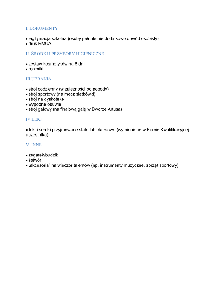 I. DOKUMENTY legitymacja szkolna druk RMUA (osoby pełnoletnie dodatkowo dowód osobisty) II. ŚRODKI I PRZYBORY HIGIENICZNE zestaw kosmetyków ręczniki na 6 dni III.UBRANIA strój codzienny (w zależności od pogody) strój sportowy (na mecz siatkówki) strój na dyskotekę wygodne obuwie strój galowy (na finałową galę w Dworze Artusa) IV.LEKI leki i środki przyjmowane stale lub okresowo (wymienione w Karcie Kwalifikacyjnej uczestnika) V. INNE zegarek/budzik śpiwór „akcesoria” na wieczór talentów (np. instrumenty muzyczne, sprzęt sportowy)